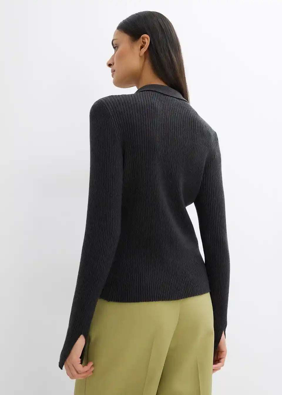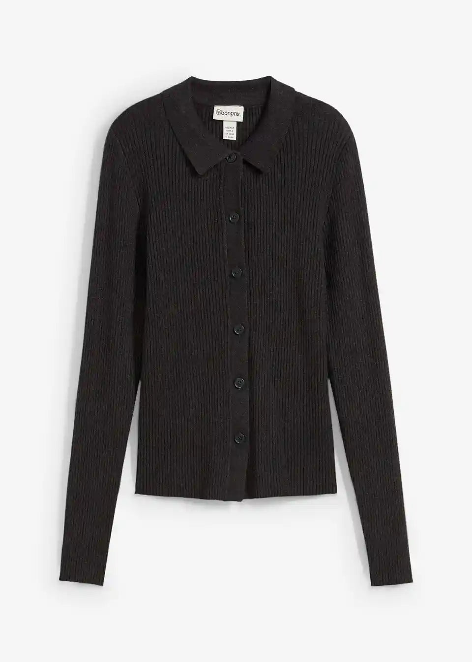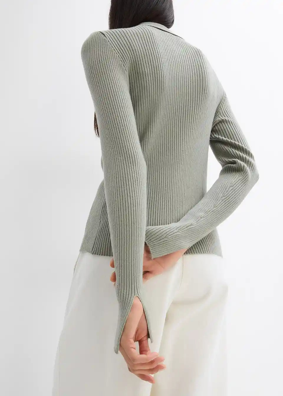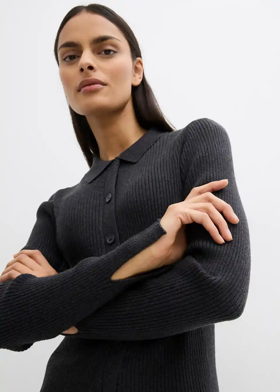 Rebrasta fina pletena jakna uskog kroja s ovratnikom na špic, gumbima u boji tkanine i širokim manžetama s prorezima