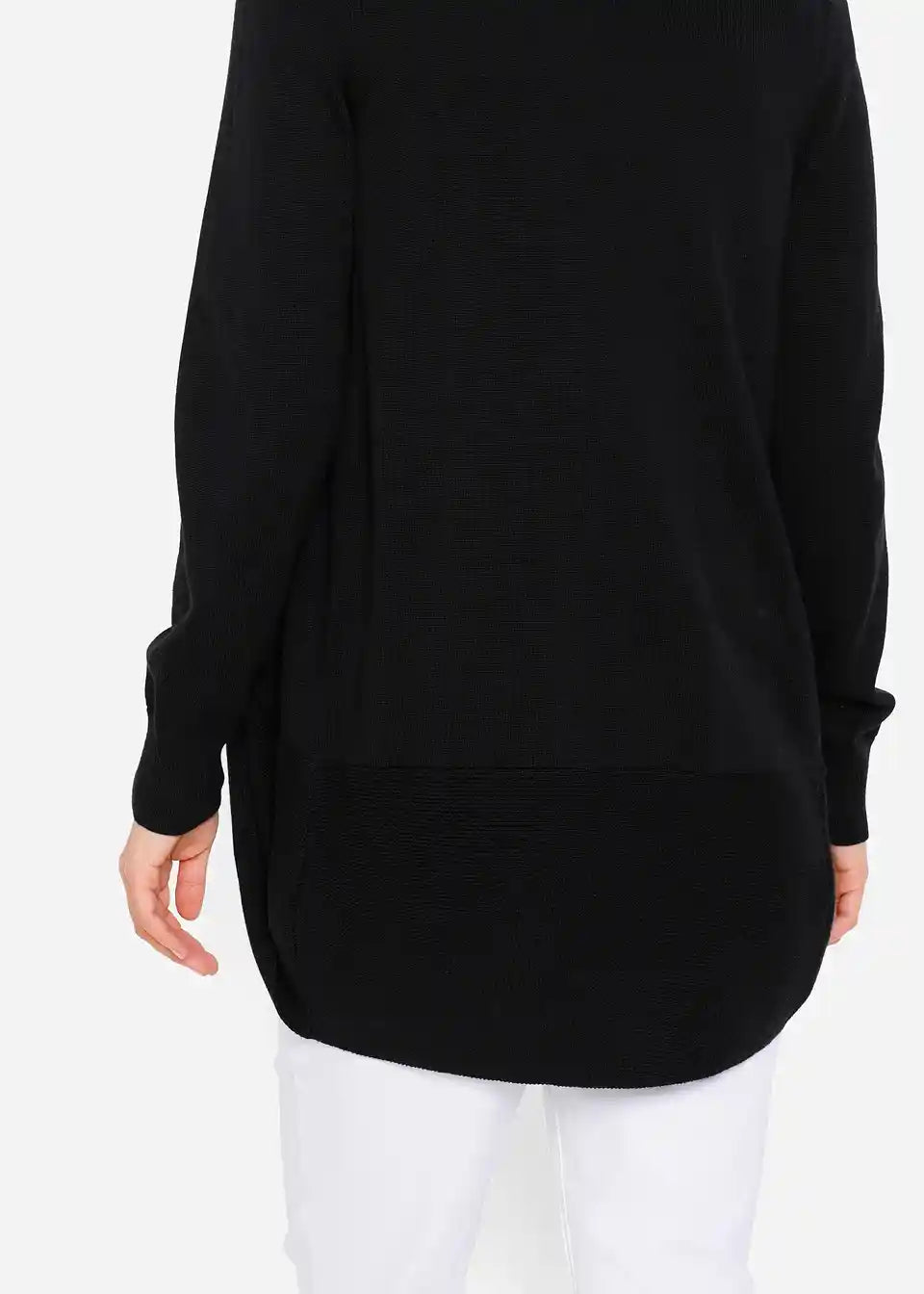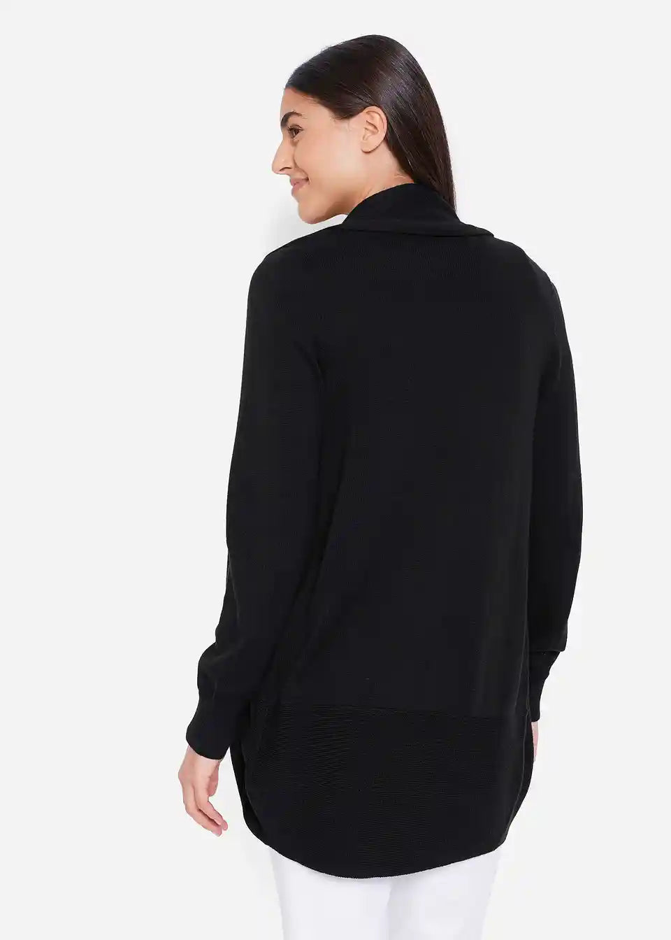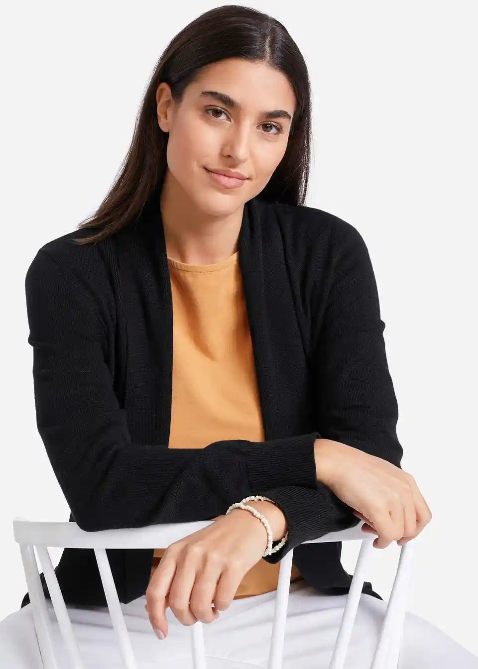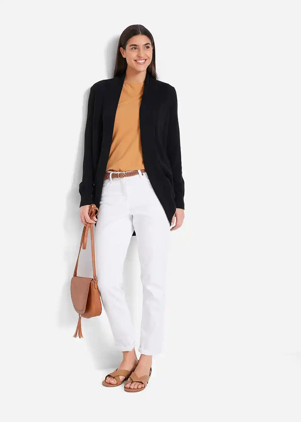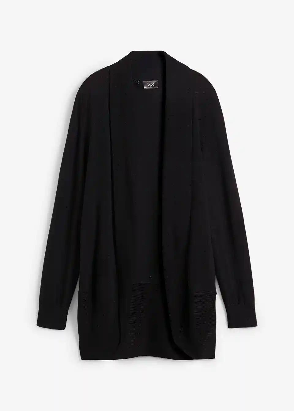 Ovaj ležerni kardigan iz aktualne kolekcije bpc oduševljava visokim stupnjem udobnosti nošenja i neobičnim krojem: Udobni kardigan ima duge rukave s finim rebrastim manžetama i zaobljenim rubom. Nosite ga otvorenog i najbolje ga kombinirajte s uskim majicama, topovima i uskim hlačama.