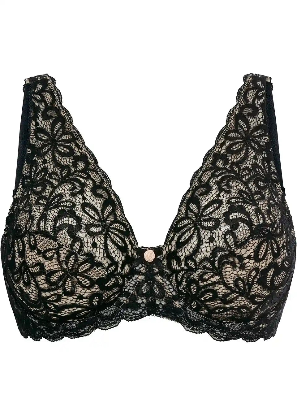 Elegantni grudnjak s žicom vješto dočarava klasičnu i sofisticiranu privlačnost. Sprijeda je ukrašen čipkom s kontrastnom podlogom za izgled nalik cvjetovima. Ovaj cvjetni uzorak završava valovitim obrubom na pojasu ispod grudi. Zahvaljujući elastičnoj kvaliteti materijala, grudnjak je izuzetno mekan na dodir. Dodatna udobnost: podstavljene naramenice i trostupanjski zatvarač postaju širi u većim cupovima. Poseban akcent daje mašnica s ukrasnom ružom na mostu. Zbog svih ovih očaravajućih i udobnih karakteristika, donje rublje poput ovog modela je omiljeno.