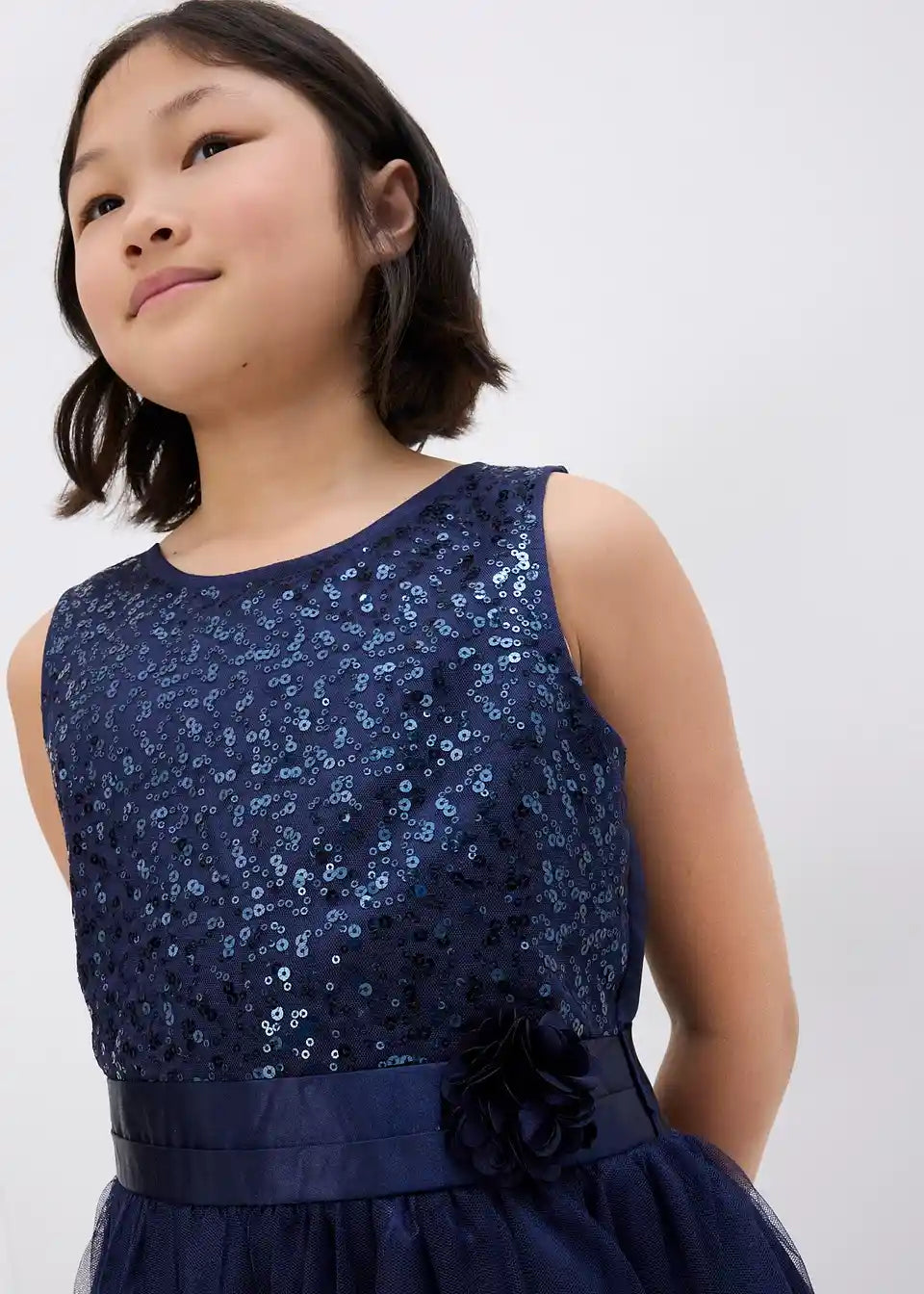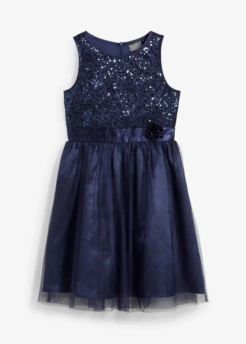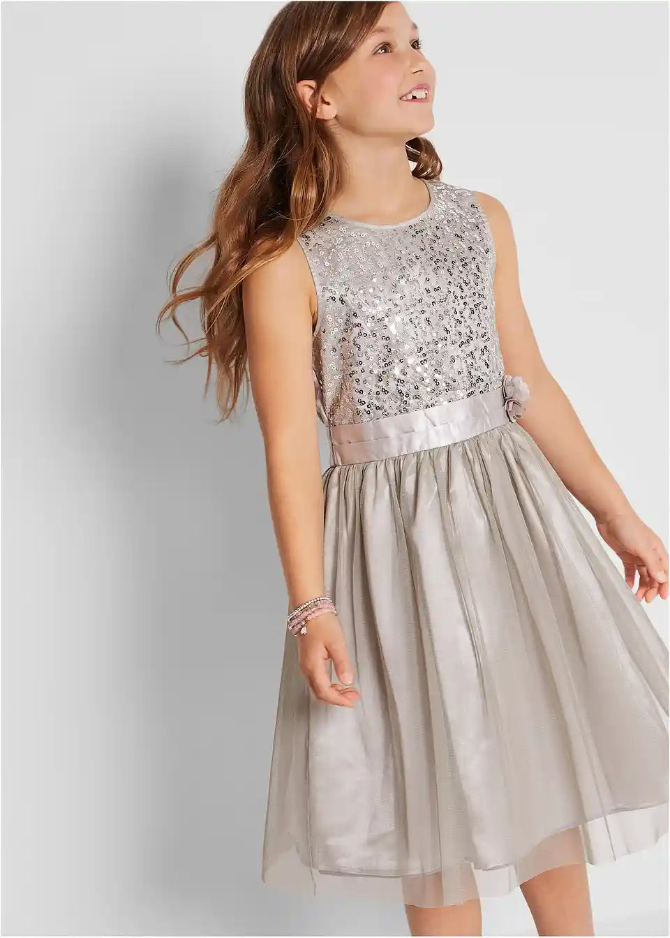Prekrasna haljina s satenskom vrpcom i velikim ukrasom. S ovom haljinom djevojčice su savršeno odjevene za posebne prigode. Višeslojni dio suknje je lepršav i izrađen s blagim naborima. Na razini struka nalazi se satenska vrpca koja se može vezati na stražnjoj strani. Široku vrpcu krasi lijepi ukras u obliku cvijeta.