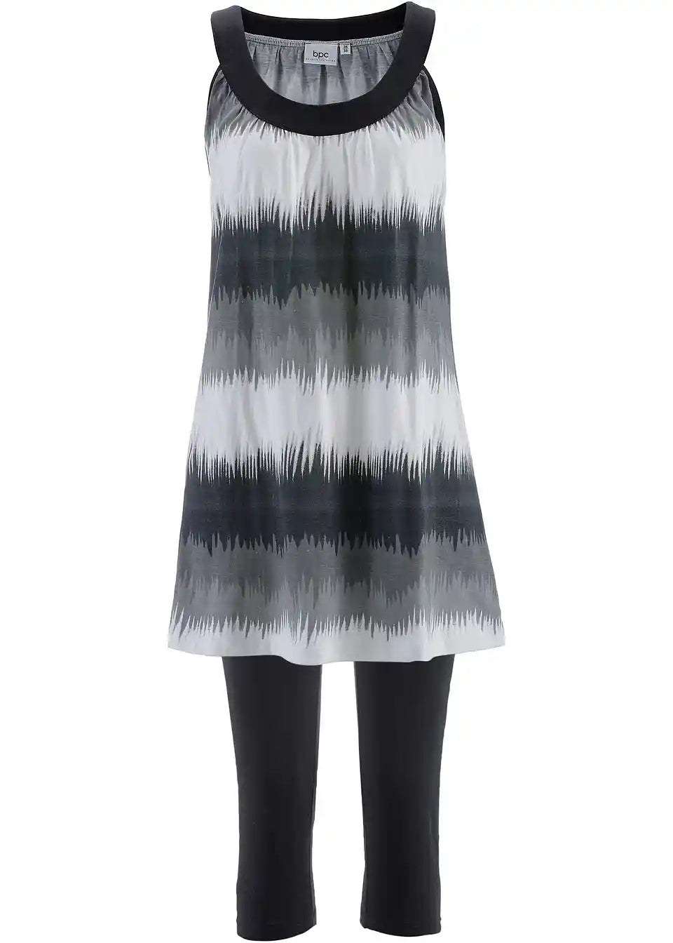 Svojim lepršavim krojem, bez rukava, haljina laska figuri. Oduševljava dubokim okruglim izrezom i batik izgledom. Svaka haljina je unikat. Haljina se kombinira s odgovarajućim modernim tajicama 3/4 dužine, koje kompletiraju ovaj dvodijelni set marke bpc. Sandale ili natikače zaokružuju ovu udobnu ležernu odjevnu kombinaciju.