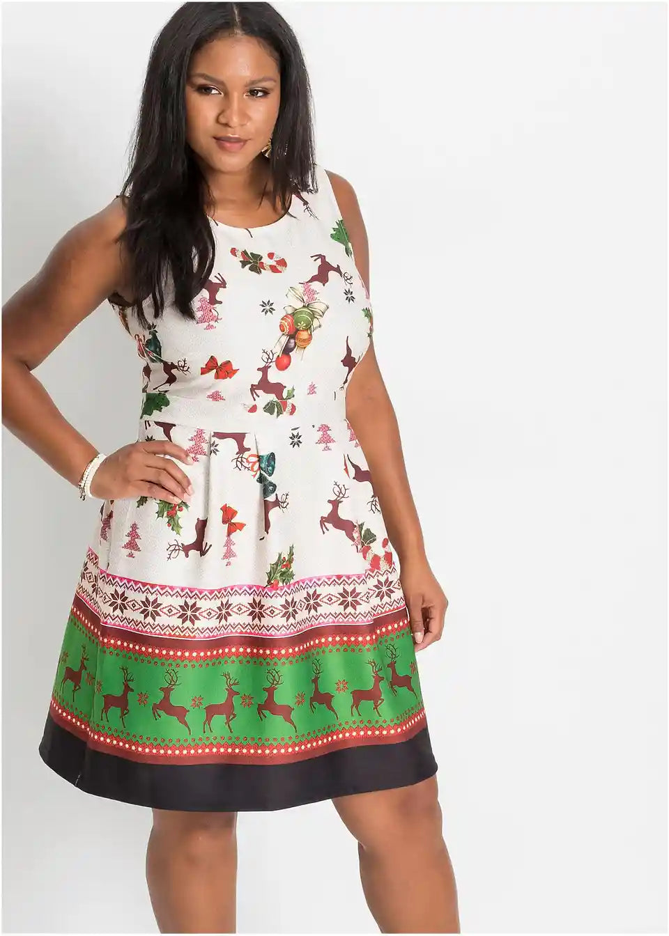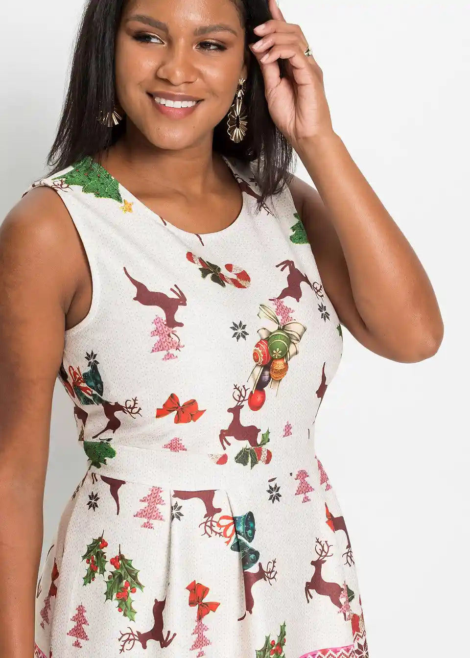 Neizostavan odabir za Božić: Haljina Etui kroja od čvrstog scuba materijala s božićnim motivom.