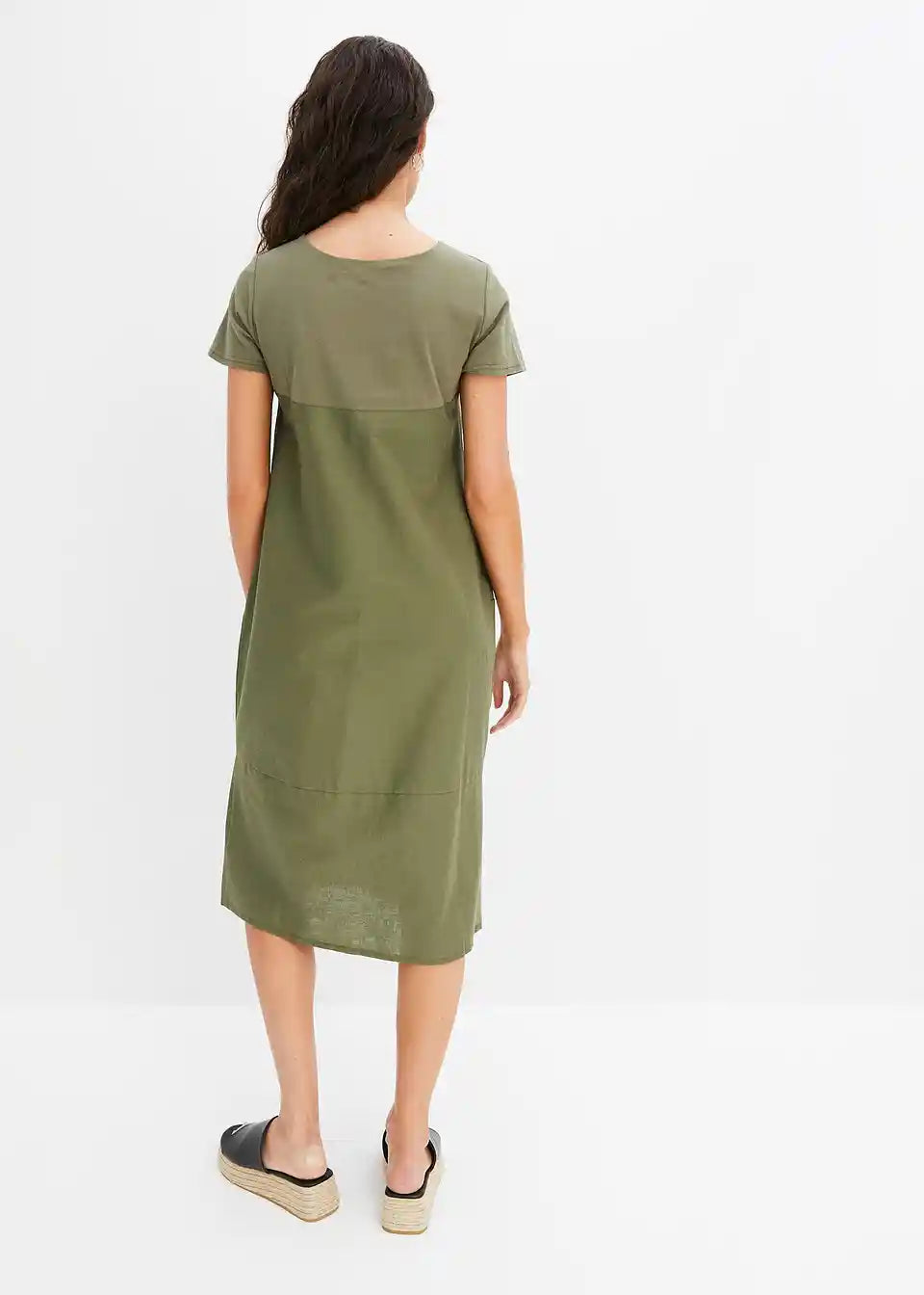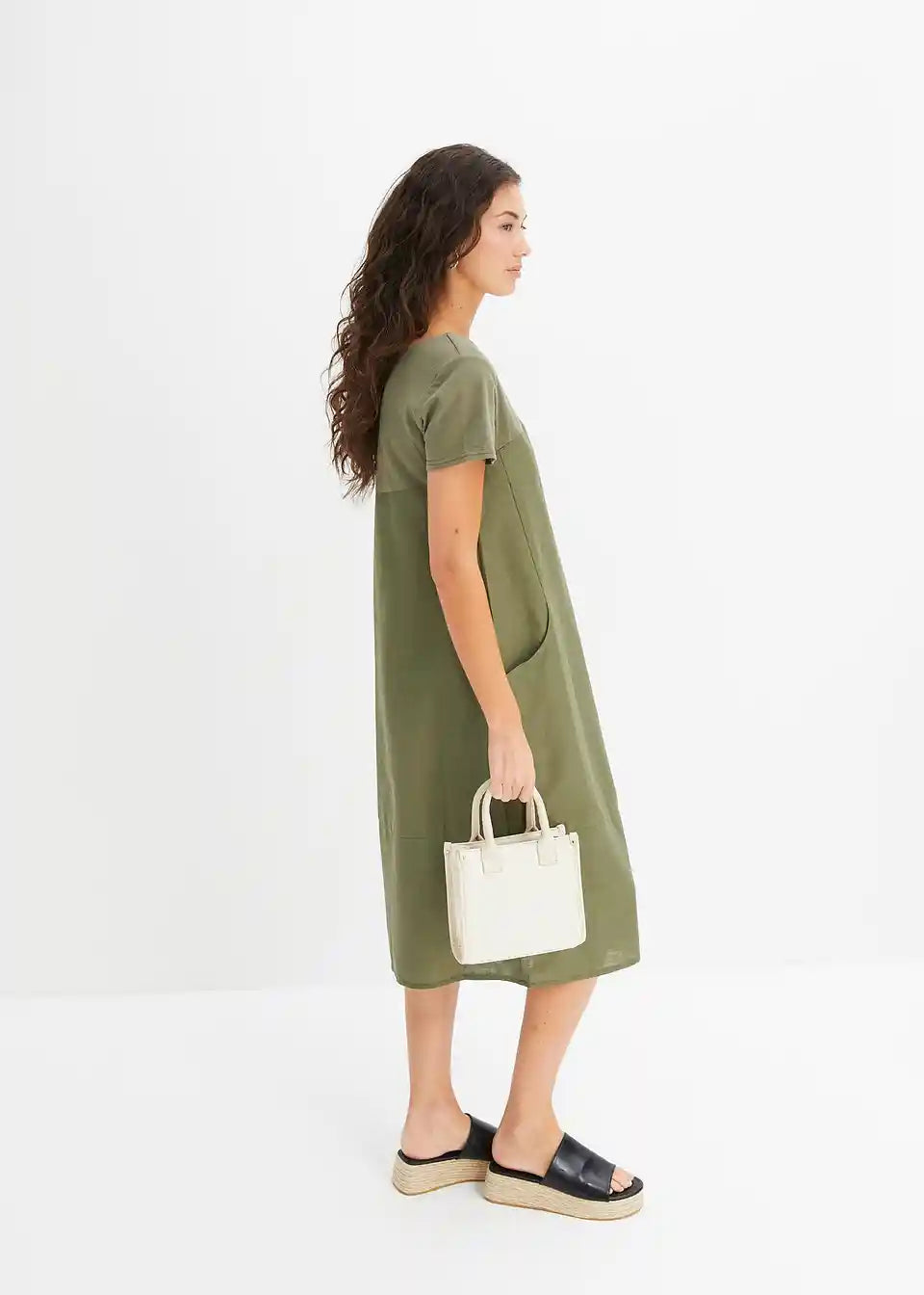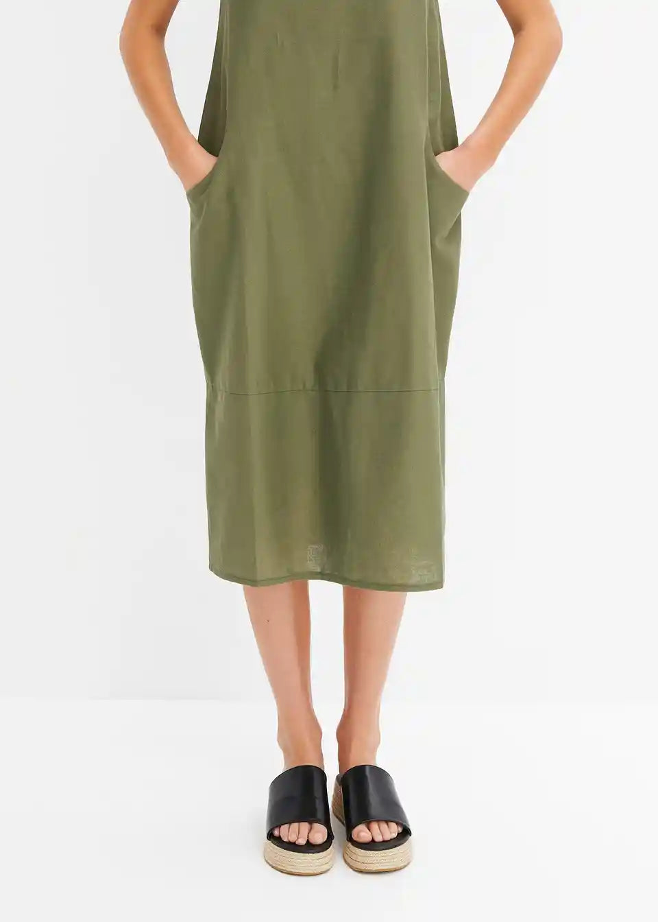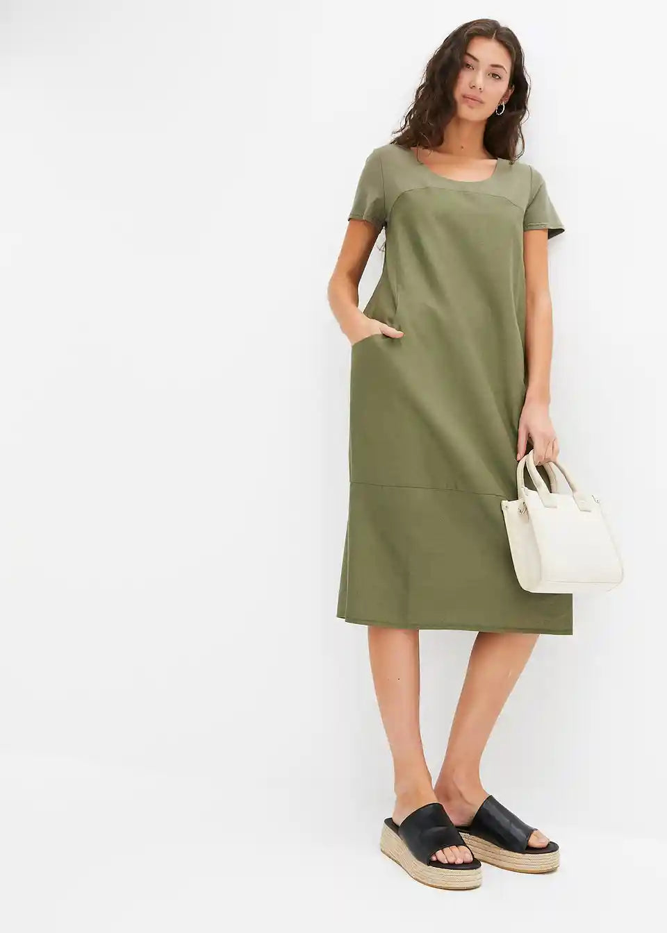 Haljina od lana u A-kroju. Ramena, rukavi, vrat i dekolte izrađeni su od mekog pamučnog materijala. Haljina ima široki okrugli izrez i velikodušne bočne džepove.