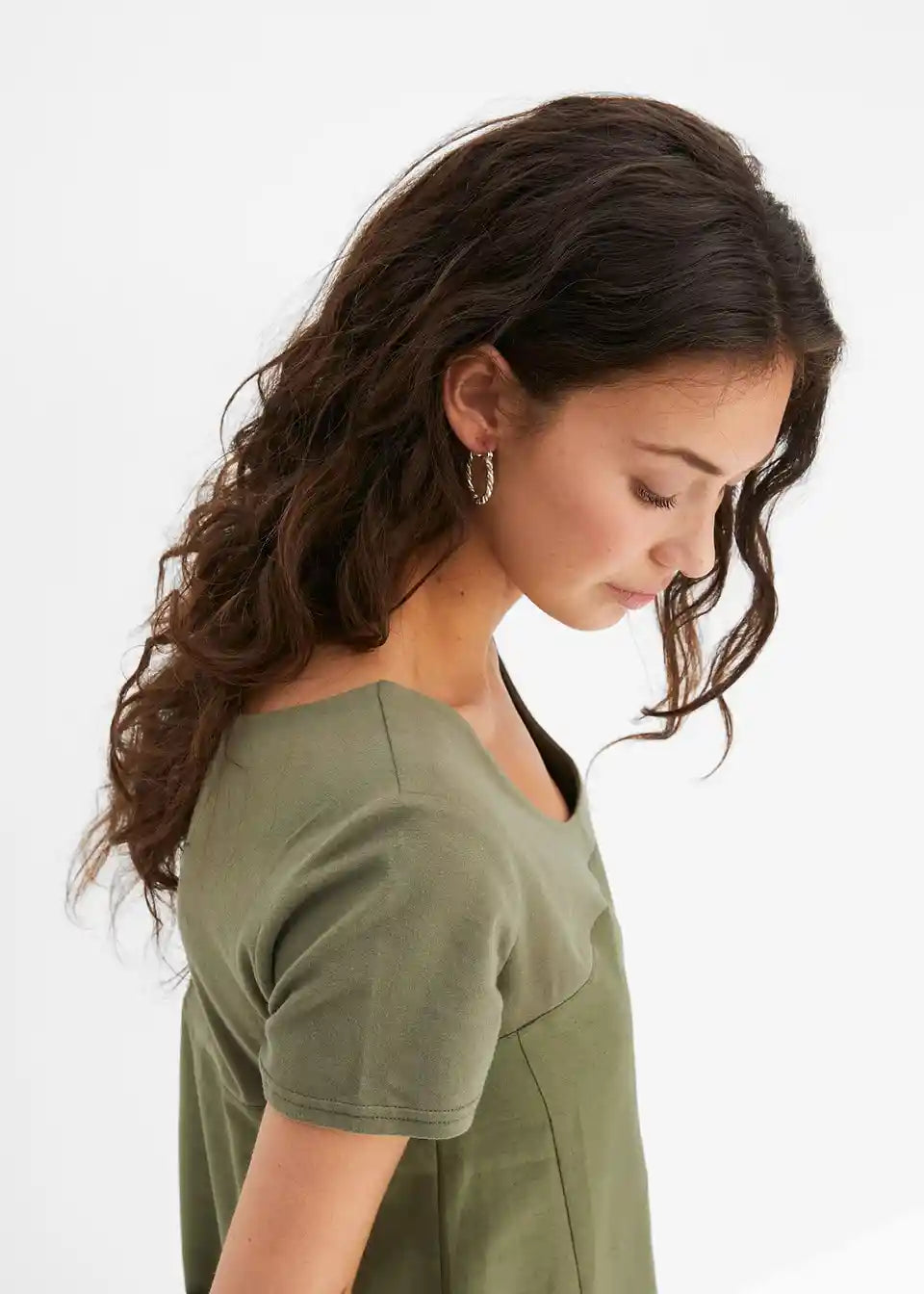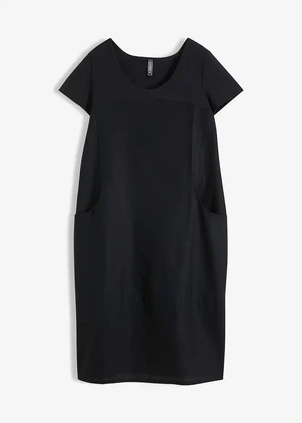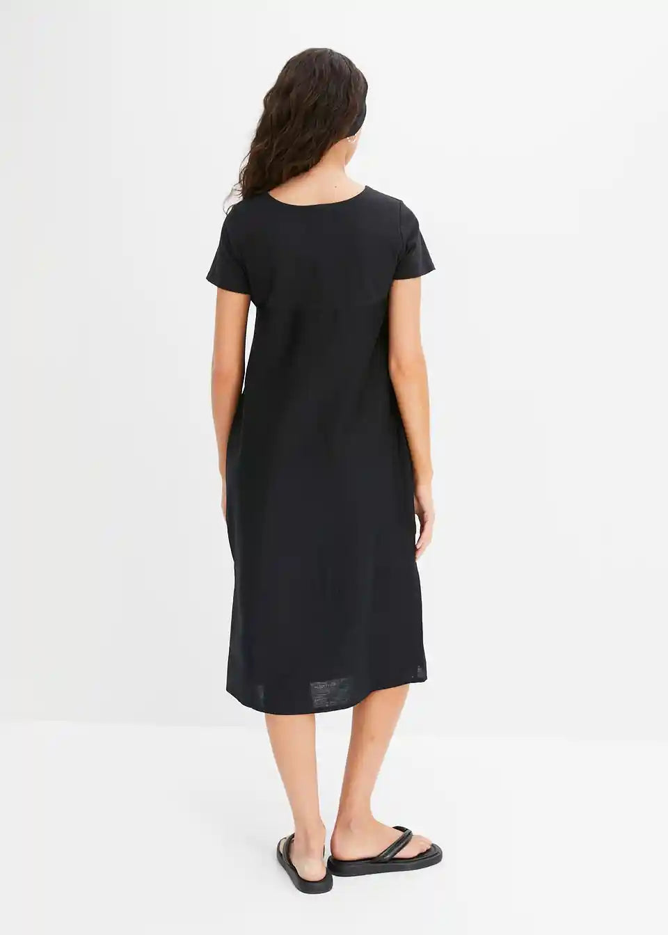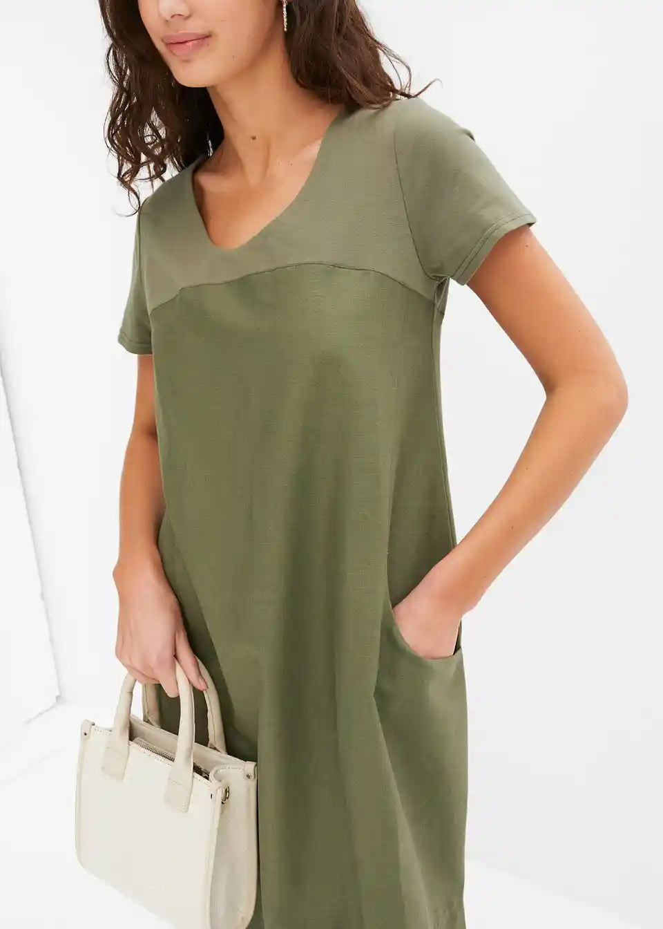 Haljina od lana u A-kroju. Ramena, rukavi, vrat i dekolte izrađeni su od mekog pamučnog materijala. Haljina ima široki okrugli izrez i velikodušne bočne džepove.