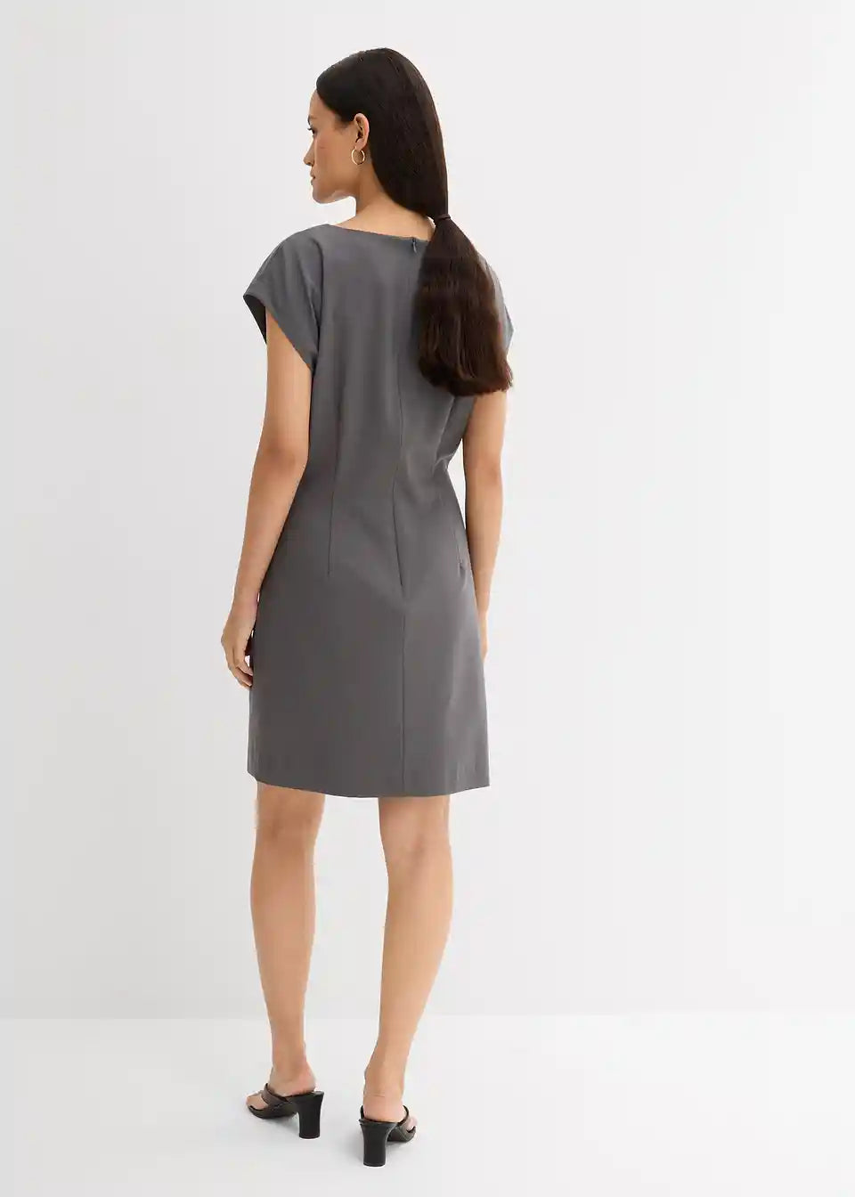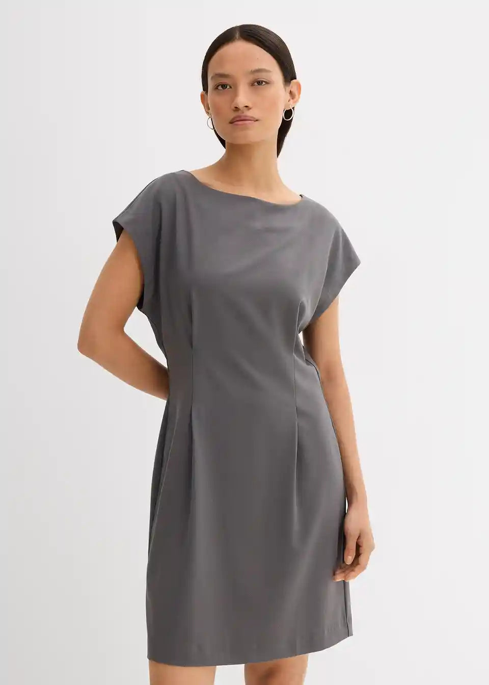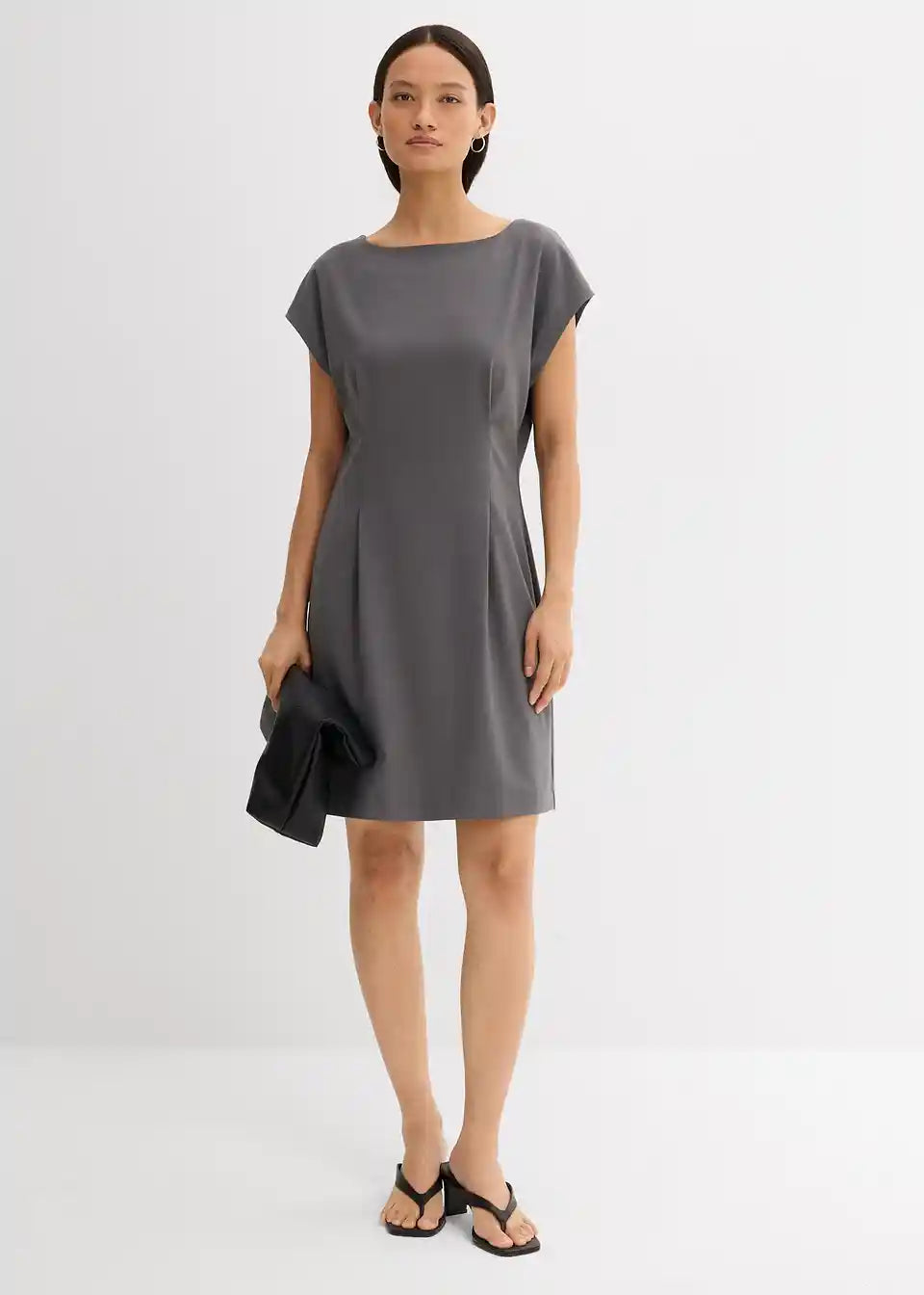 Kratka, elegantna haljina od tkanine s boat izrezom i kratkim rukavima. Princez šavovi sprijeda za oblikovanje figure i skriveni patentni zatvarač na leđima.