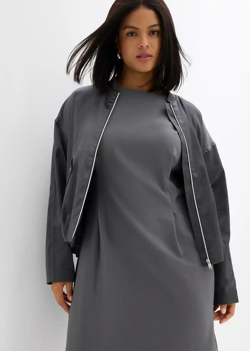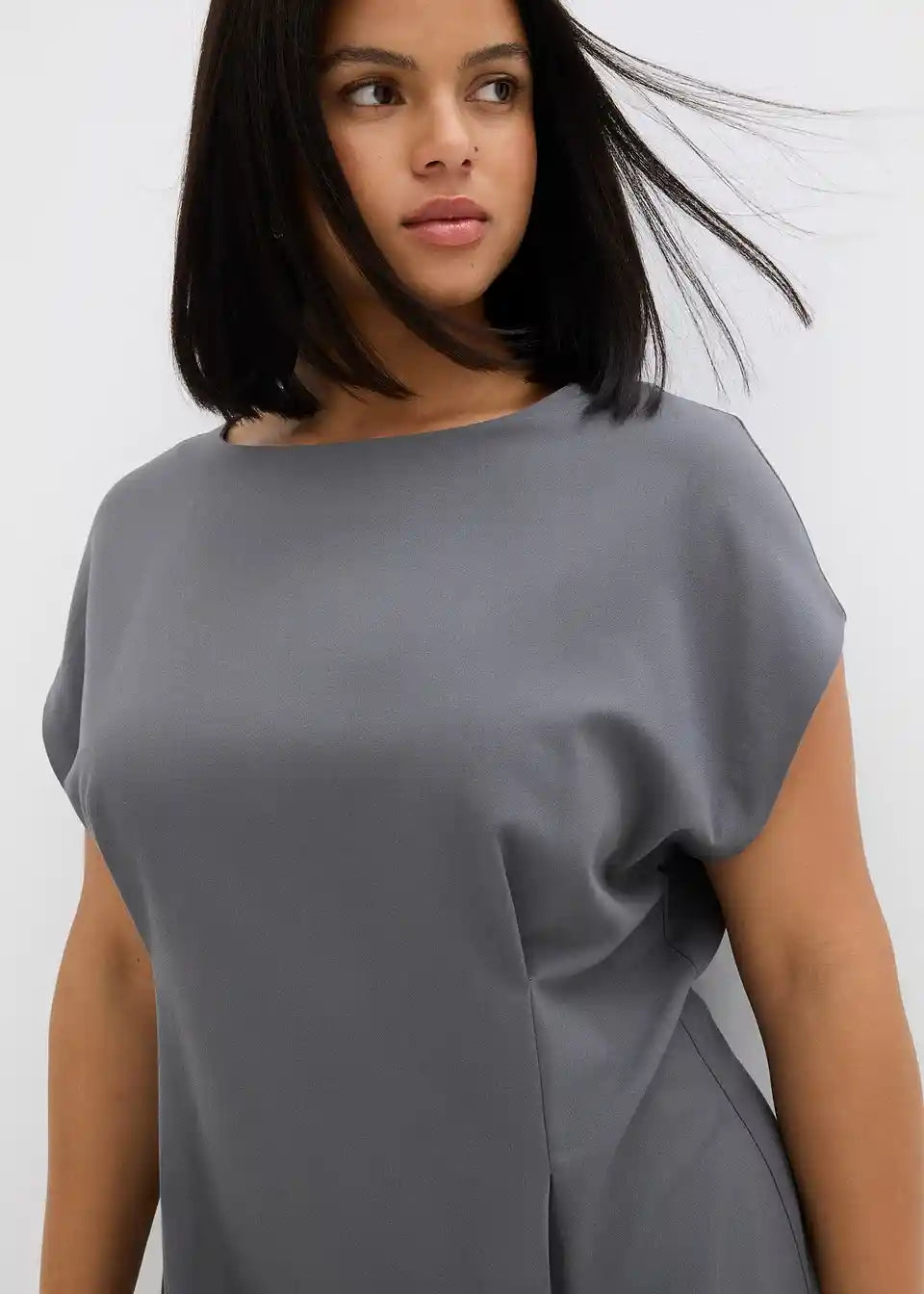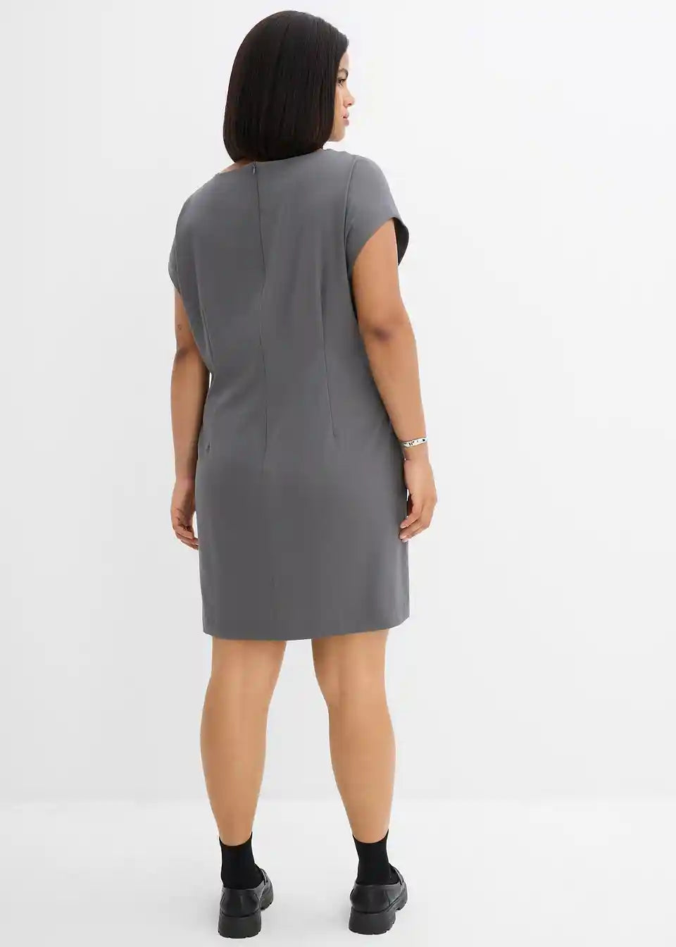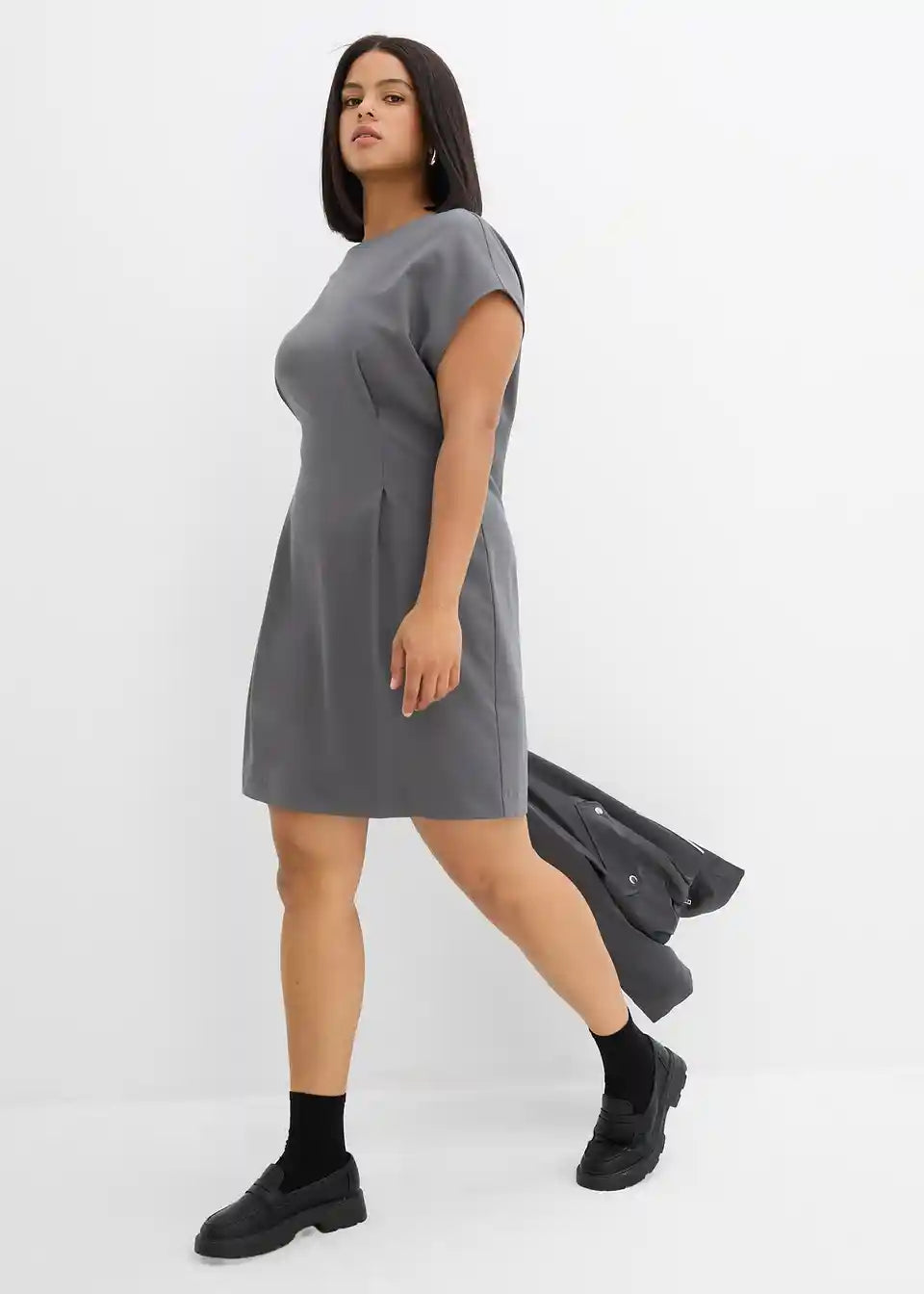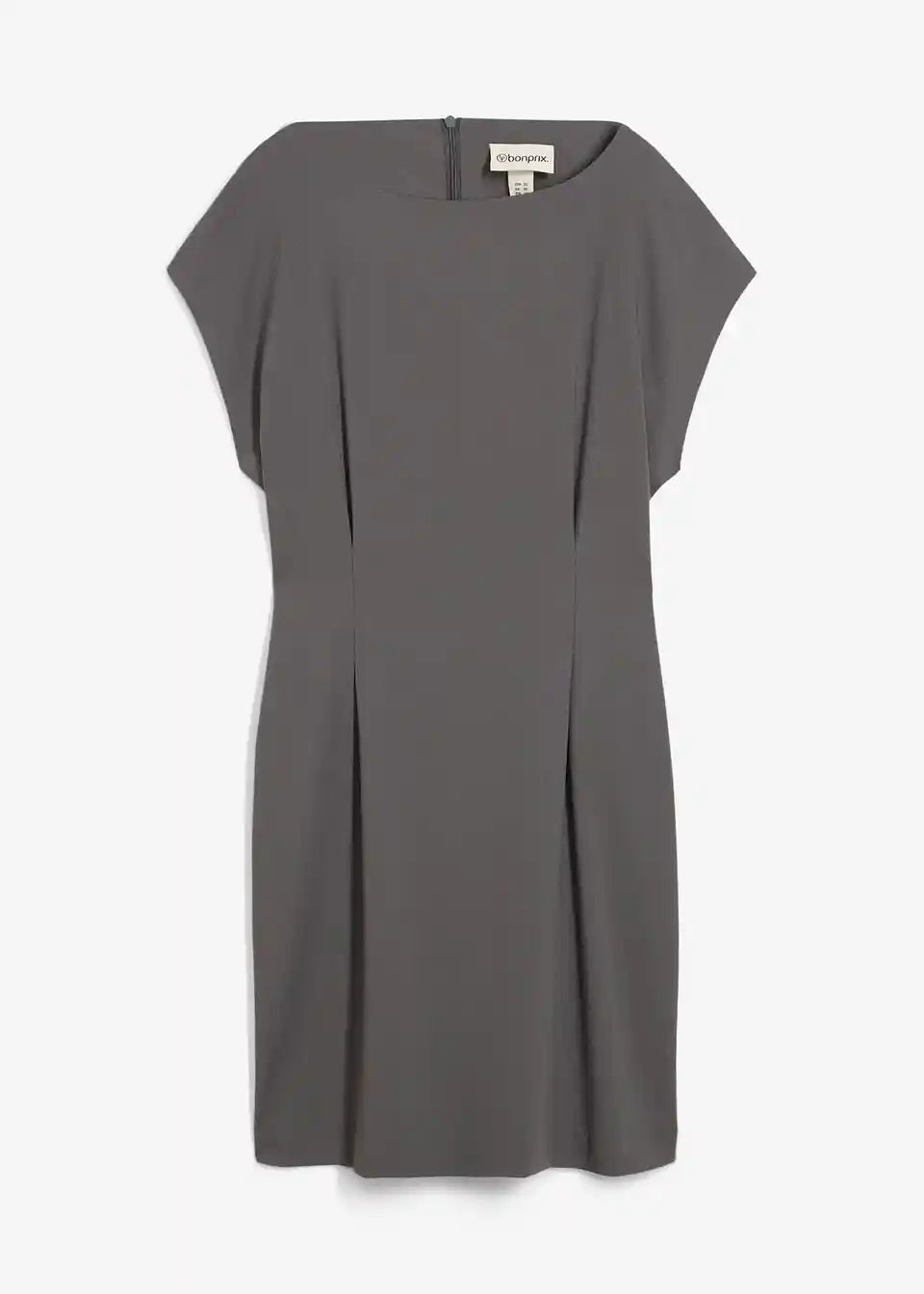 Kratka, elegantna haljina od tkanine s izrezom lađa i kratkim rukavima. Figura naglašena preklopima sprijeda i skriveni patentni zatvarač na leđima.