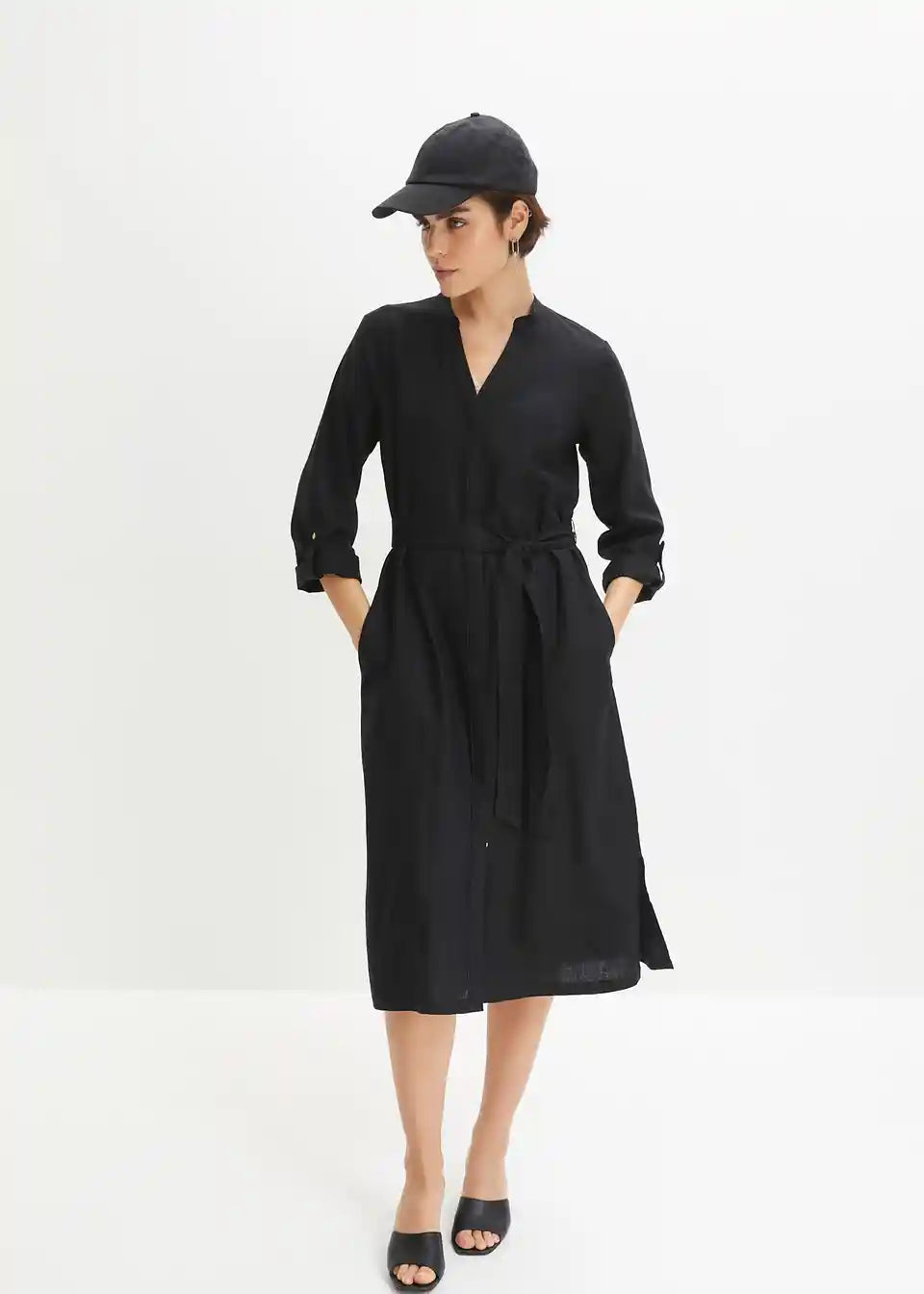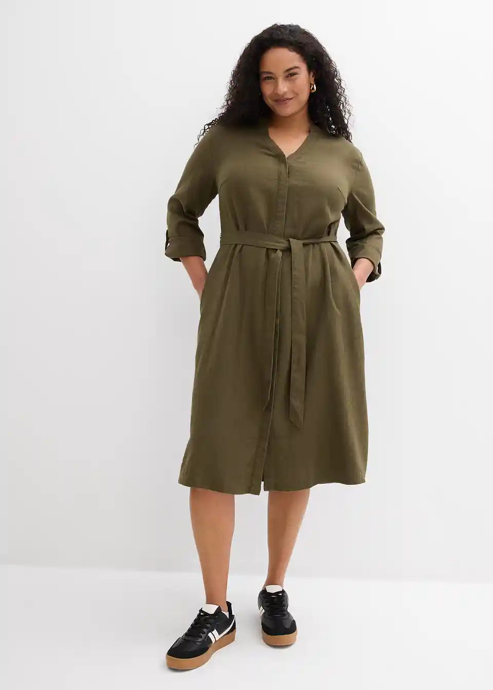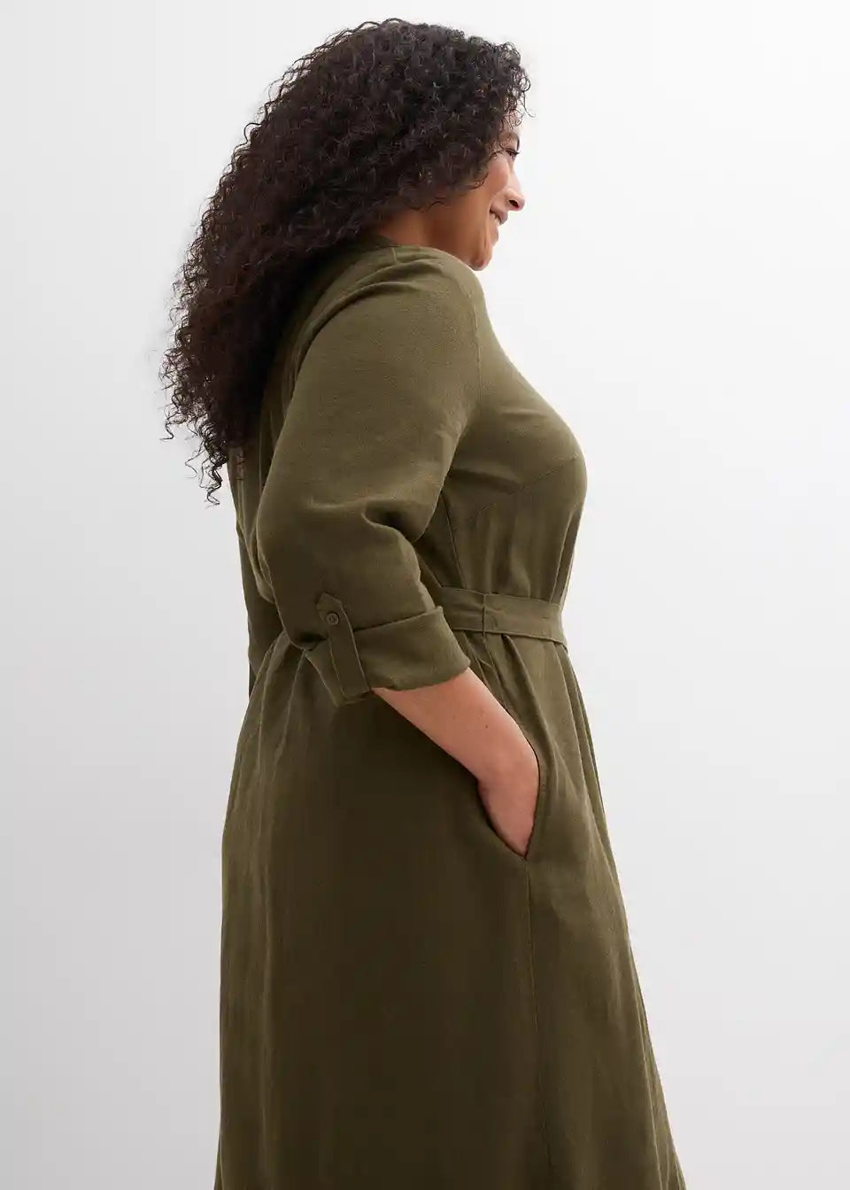Lanena haljina s džepovima i ¾ rukavima na zavrtanje