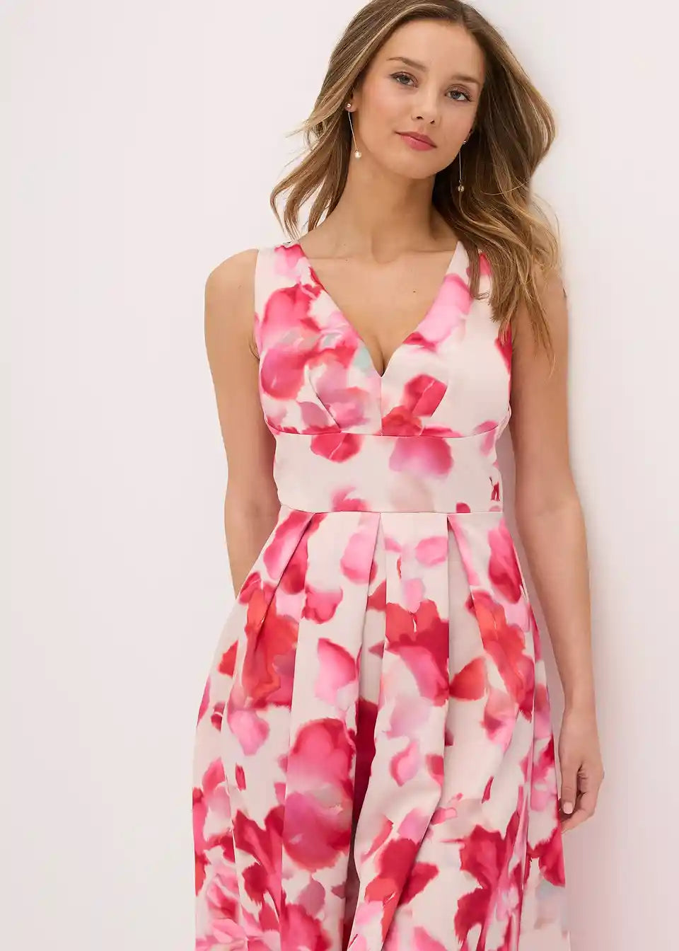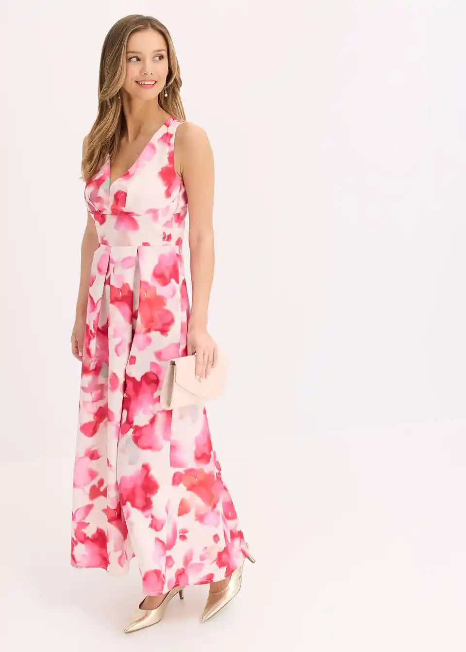 Moderna i ženstvena: Maksihaljina s pojasom u struku i suknjom s naborima od sjajnog satena s cvjetnim uzorkom