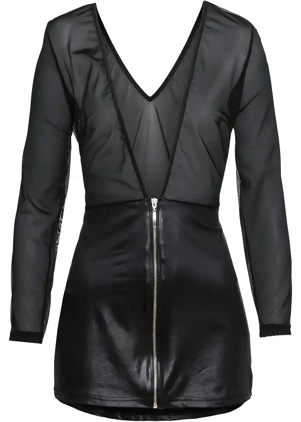 Čista erotika! Ova seksi haljina ima toliko sastavnih dijelova koji će vas očarati. Prozirni materijal na gornjem dijelu zavodljivo otkriva vaše obline. Duboki izrez savršeno naglašava vaš dekolte. Prilagodljiva uska suknja izrađena od elastičnog materijala s efektom mokrog izgleda (Wet-Look) savršeno pristaje vašem tijelu i lako se otvara pomoću patentnog zatvarača smještenog u sredini sprijeda. Ovi elementi čine seksi odjevnu kombinaciju za erotičnu večer. Dovršite izgled s crnim ili crvenim visokim potpeticama.