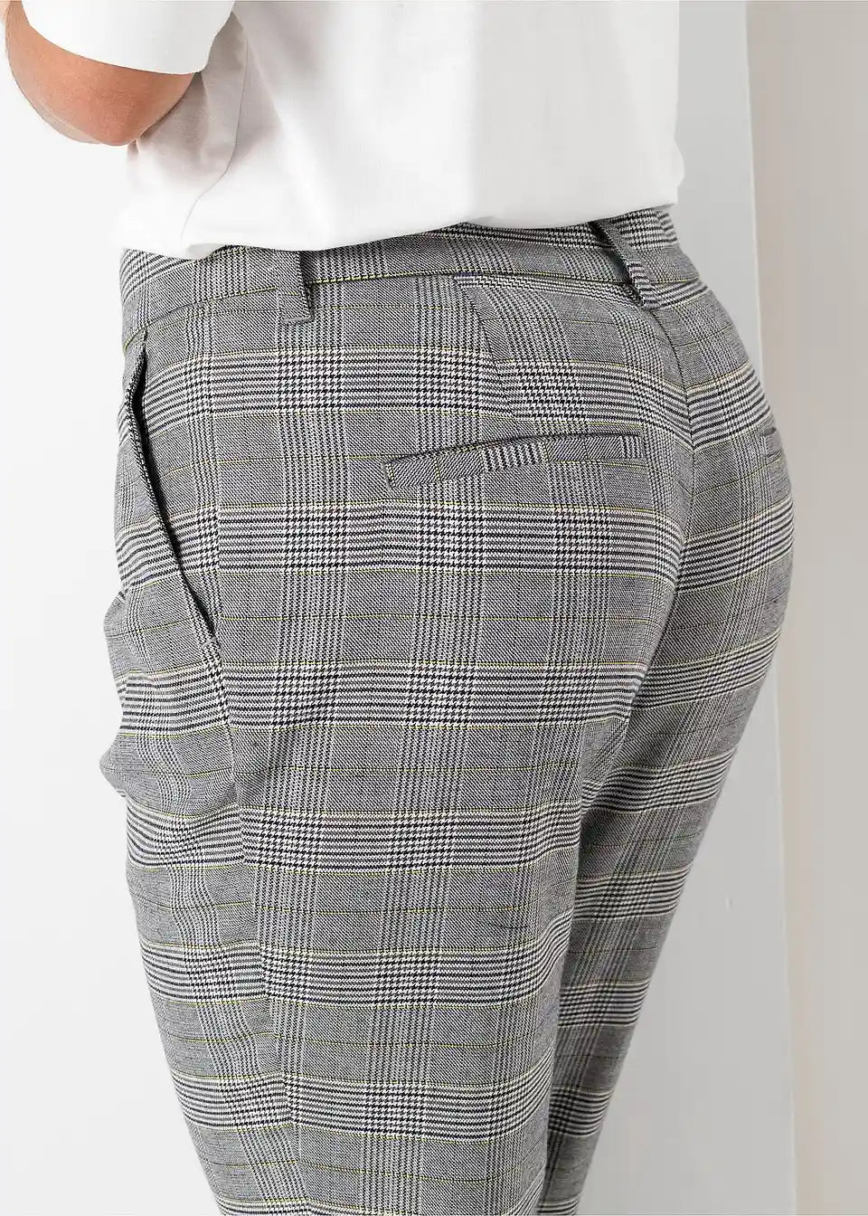 Poslovne hlače s kariranim uzorkom imaju dva bočna džepa i dva "lažna džepa" na stražnjoj strani. Unutarnja duljina nogavice u veličini 38 iznosi oko 77,5 cm.