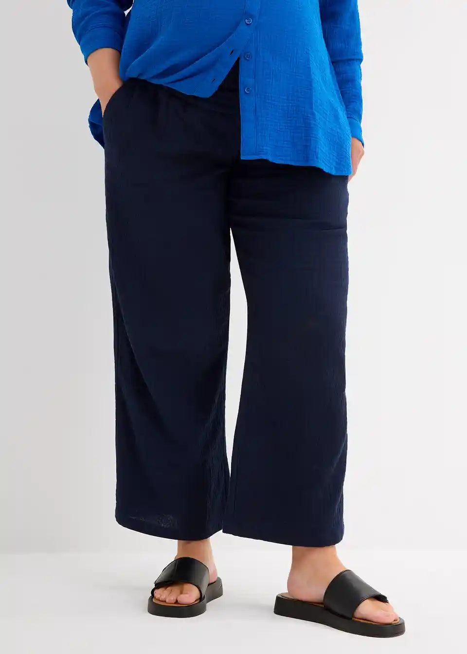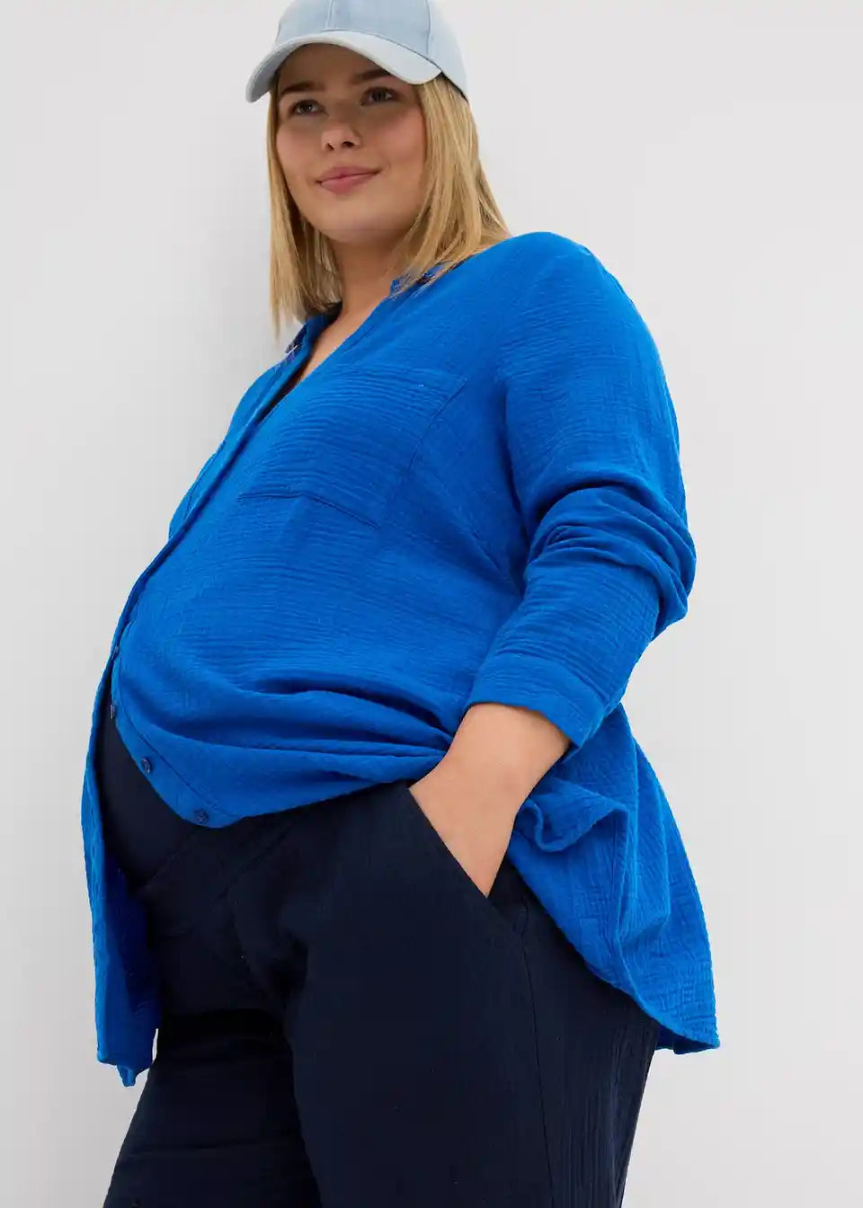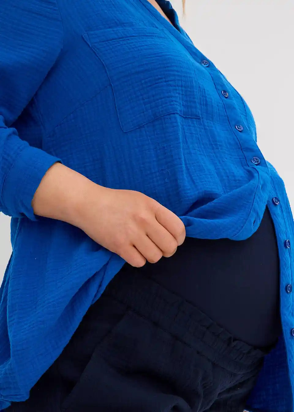 Udobne hlače za trudnice od čistog pamučnog muslina. Mekana tkanina je posebno lagana i prozračna. Široki ušiveni pojas od džerseja osigurava optimalno pristajanje na trbuhu, a pojas hlača izrađen je posebno mekano i elastično. S praktičnim prednjim džepovima. Udoban kroj na bokovima i bedrima s širokim nogavicama.