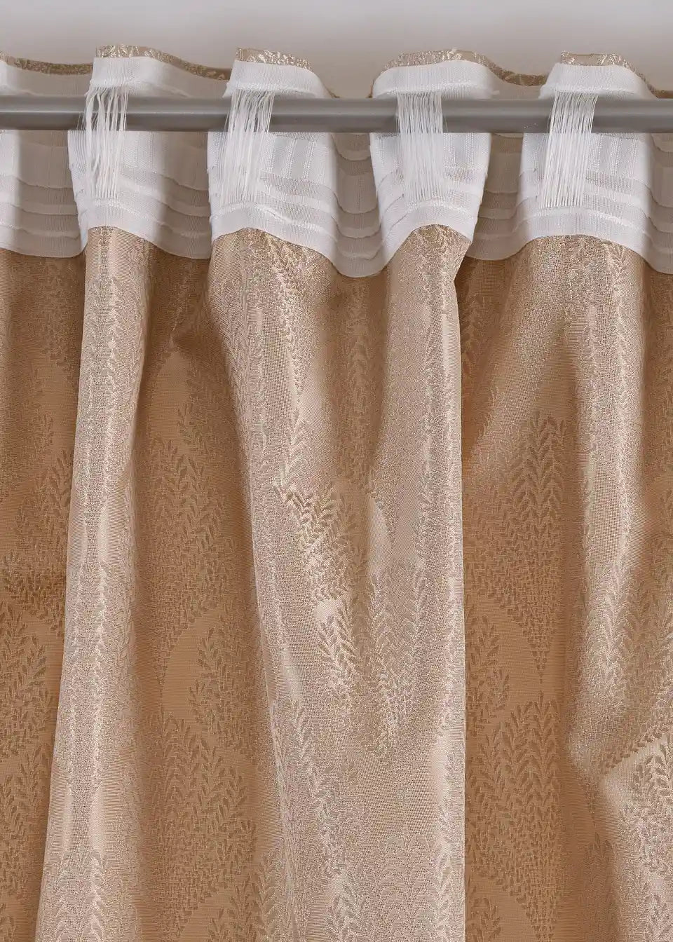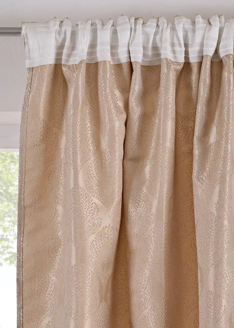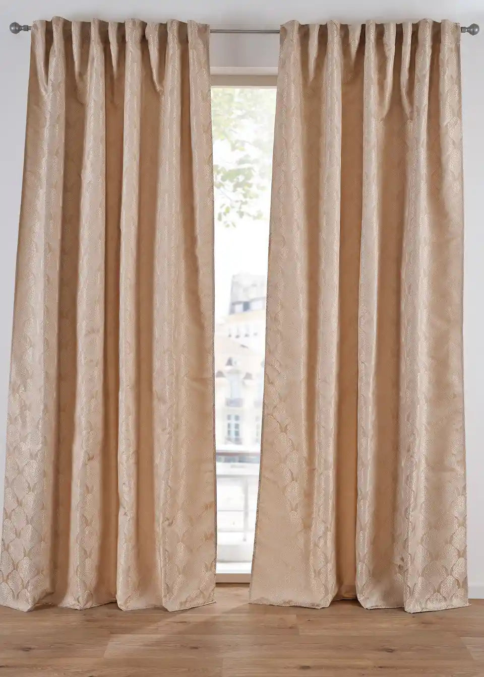 Vrlo elegantna i otmjena zavjesa od visokokvalitetnog Jacquard materijala. Zavjesa je održana u toploj boji pijeska i ima lagani sjaj.