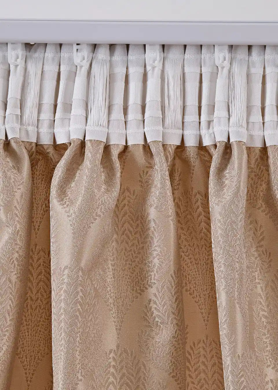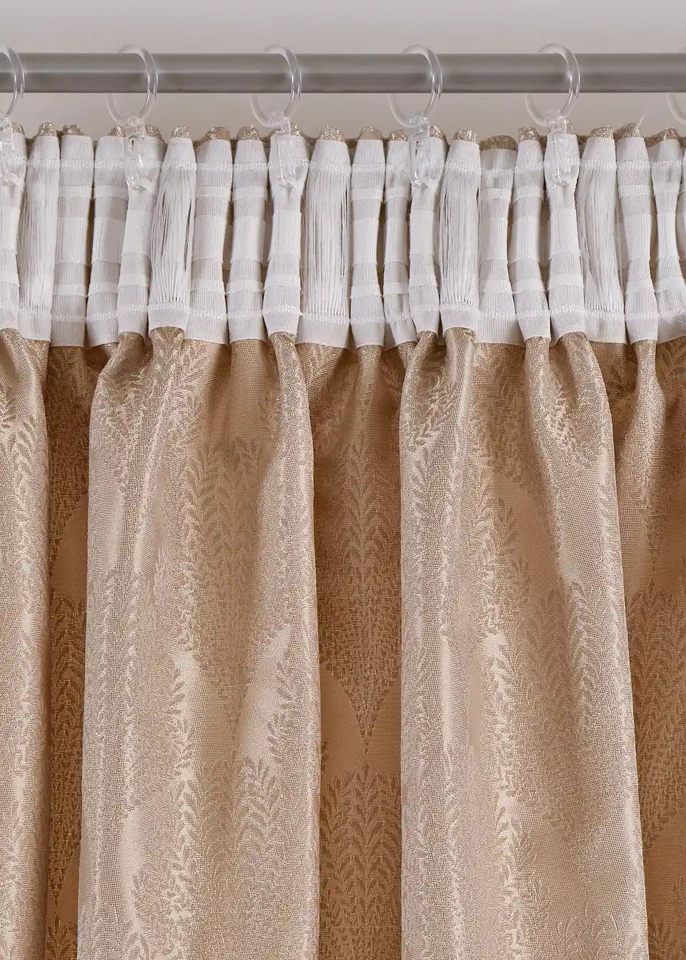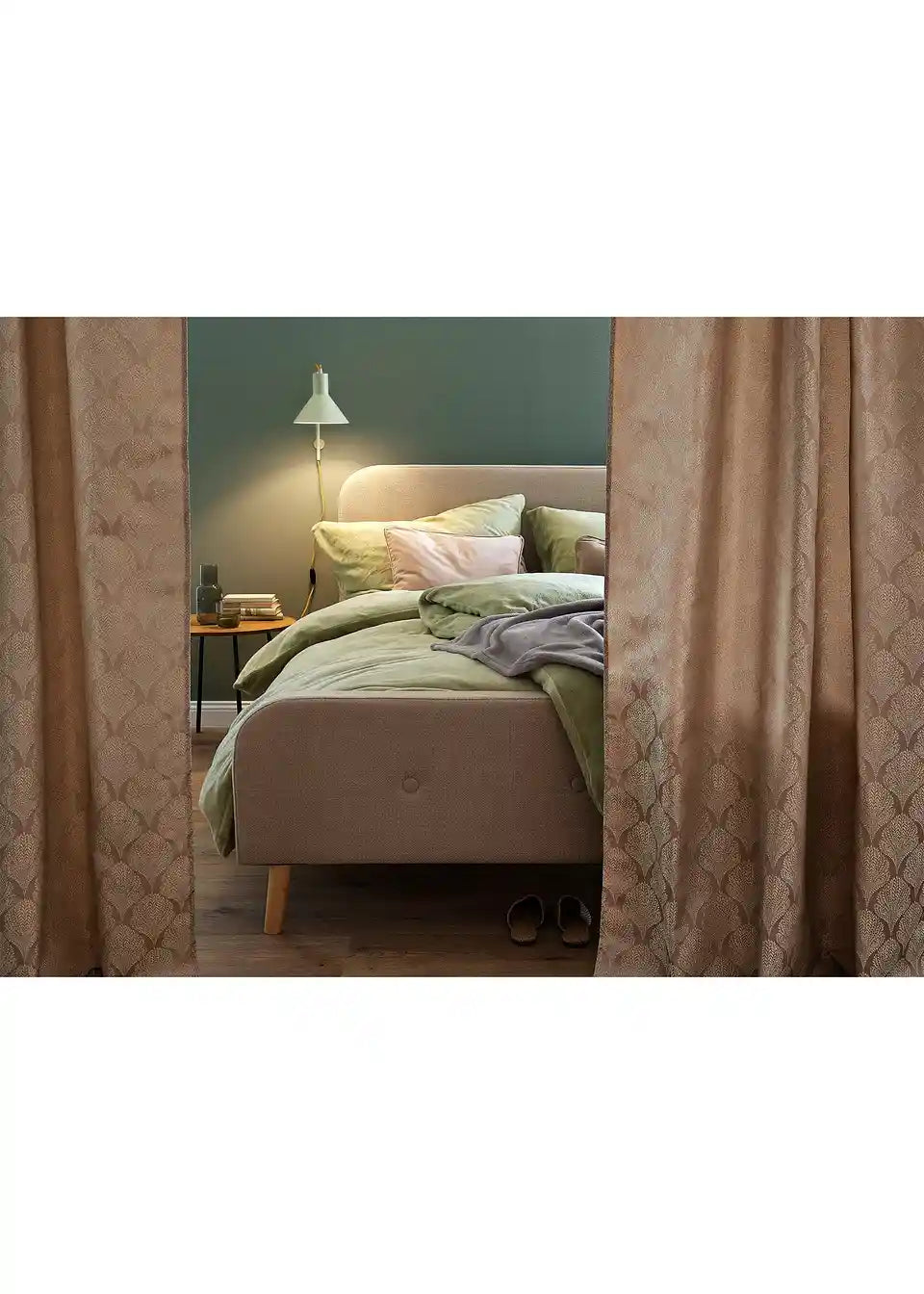 Vrlo elegantna i otmjena zavjesa od visokokvalitetnog Jacquard materijala. Zavjesa je održana u toploj boji pijeska i ima lagani sjaj.