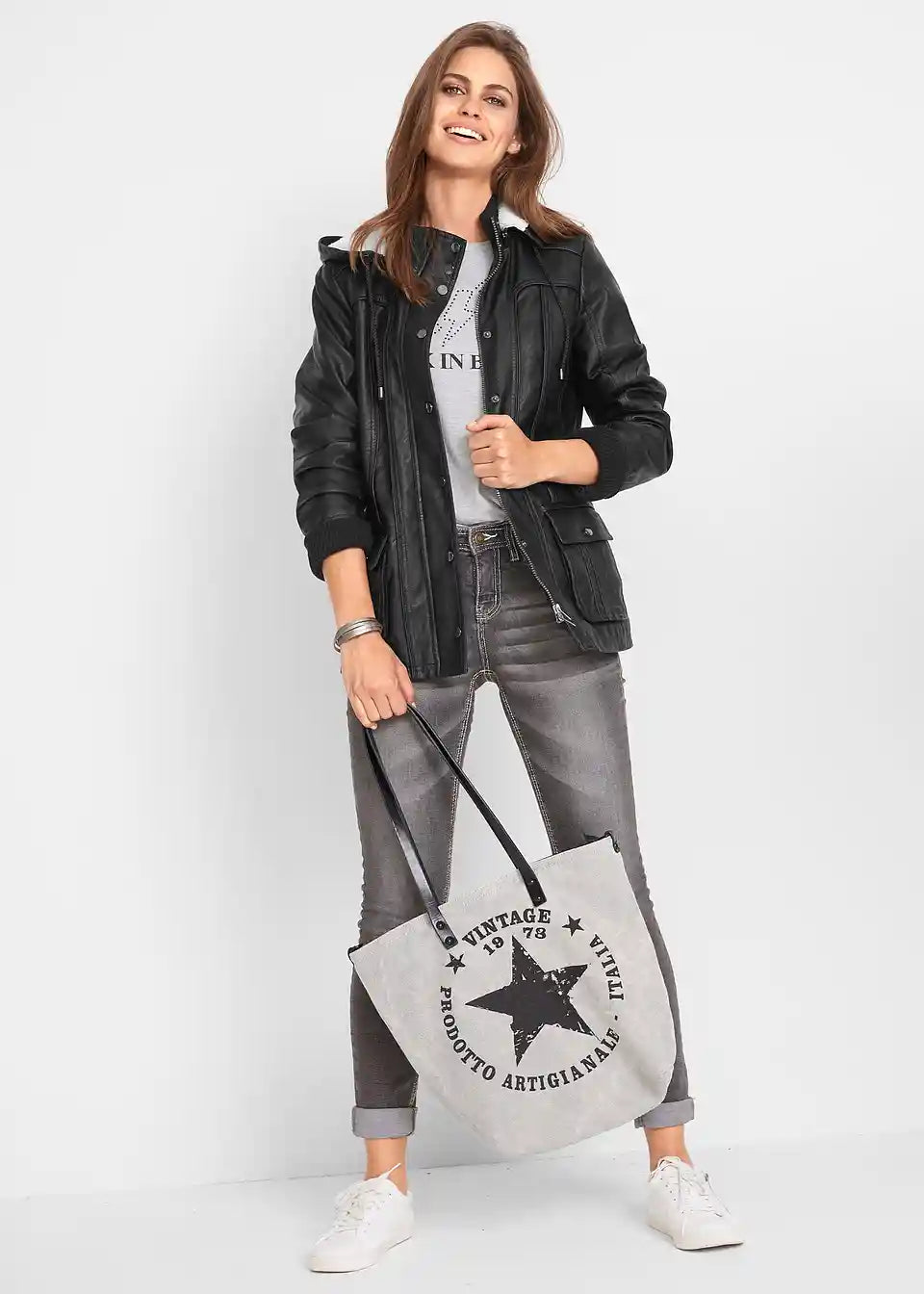Ova jakna od imitacije kože brenda John Baner je ležerni pratitelj za svakodnevni život. Jakna ima odvojivu kapuljaču s ugodnom i mekanom podstavom. Stajaći ovratnik i završeci rukava ističu se zahvaljujući rebrastim rubovima. Jakna koja naglašava figuru može se zakopčati preko skrivenog patentnog zatvarača s gumbima. Nadzemni i kosi džepovi koji se nalaze na prednjoj strani upotpunjuju ležerni dizajn jakne od imitacije kože.