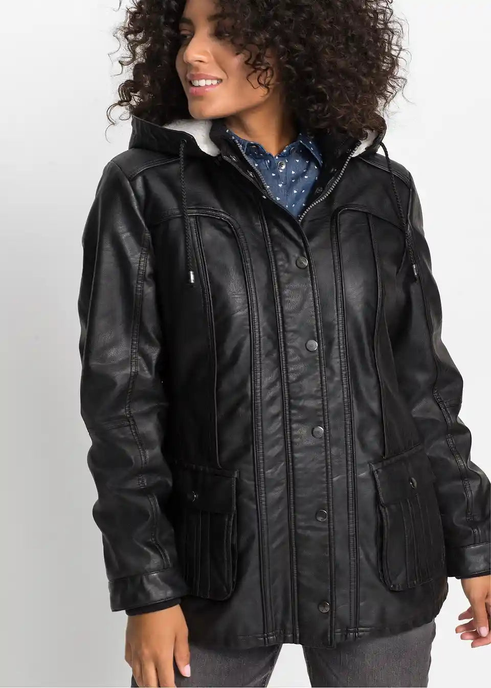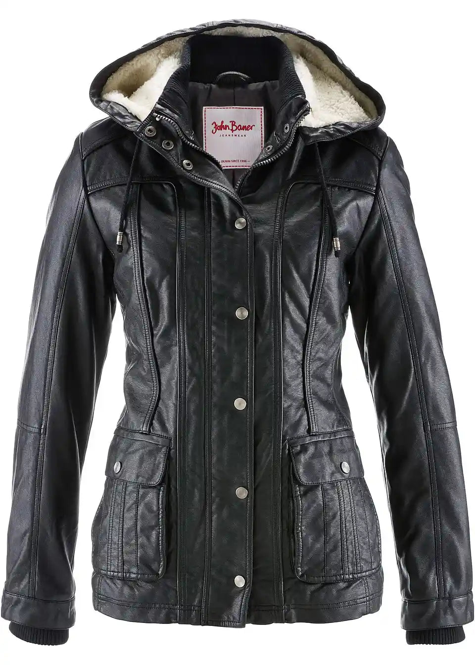 Ova jakna od imitacije kože od John Baner savršen je dodatak za svakodnevnicu. Jakna ima odvojivu kapuljaču s ugodno-mekom podstavom. Ovratnik i završeci rukava ističu se rebrastim rubovima. Jakna se zatvara skrivenim patentnim zatvaračem s drukerima, čime se postiže naglasak na figuri. Džepovi s preklopom i ušiveni džepovi na prednjoj strani zaokružuju ležeran dizajn jakne od imitacije kože.