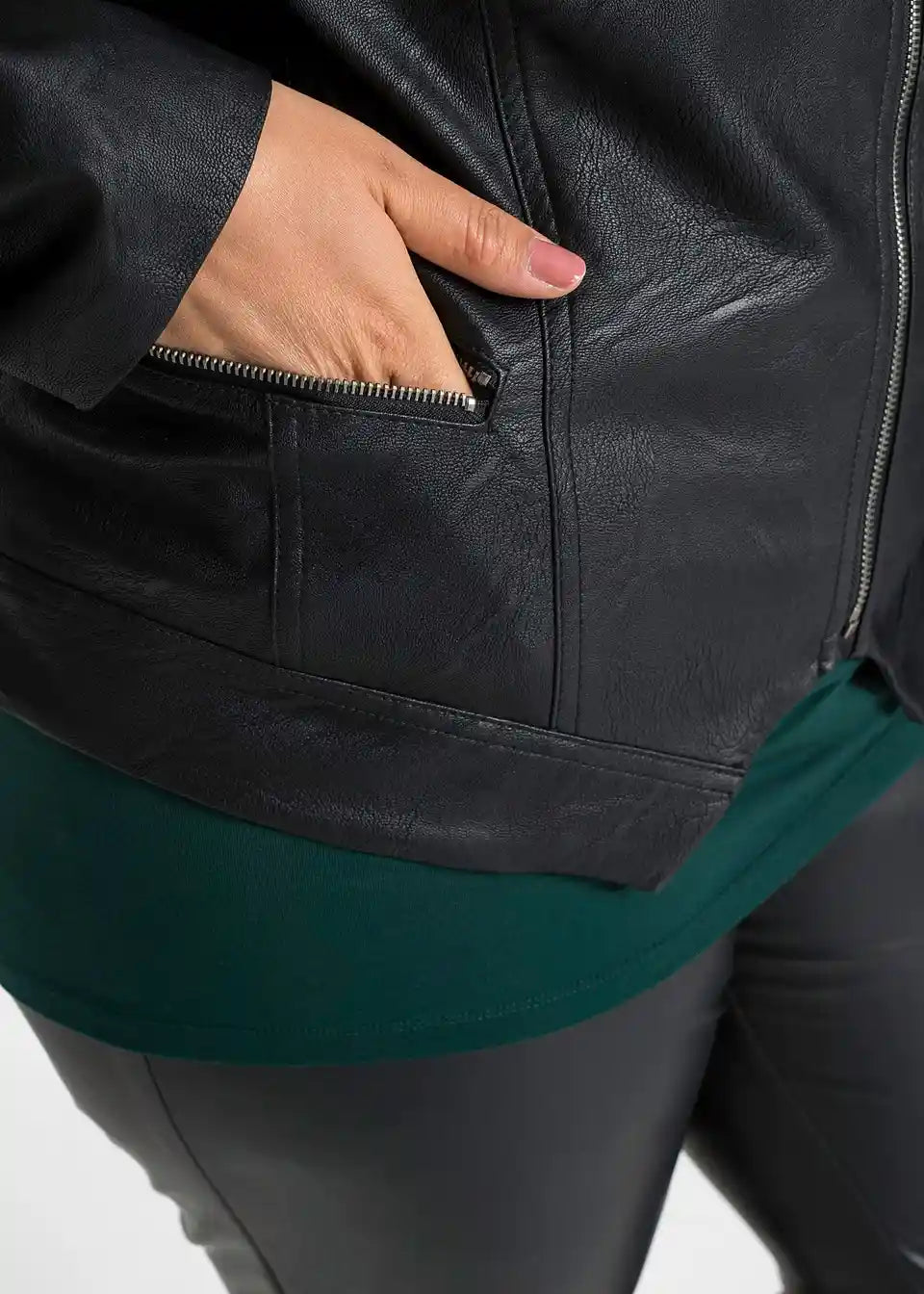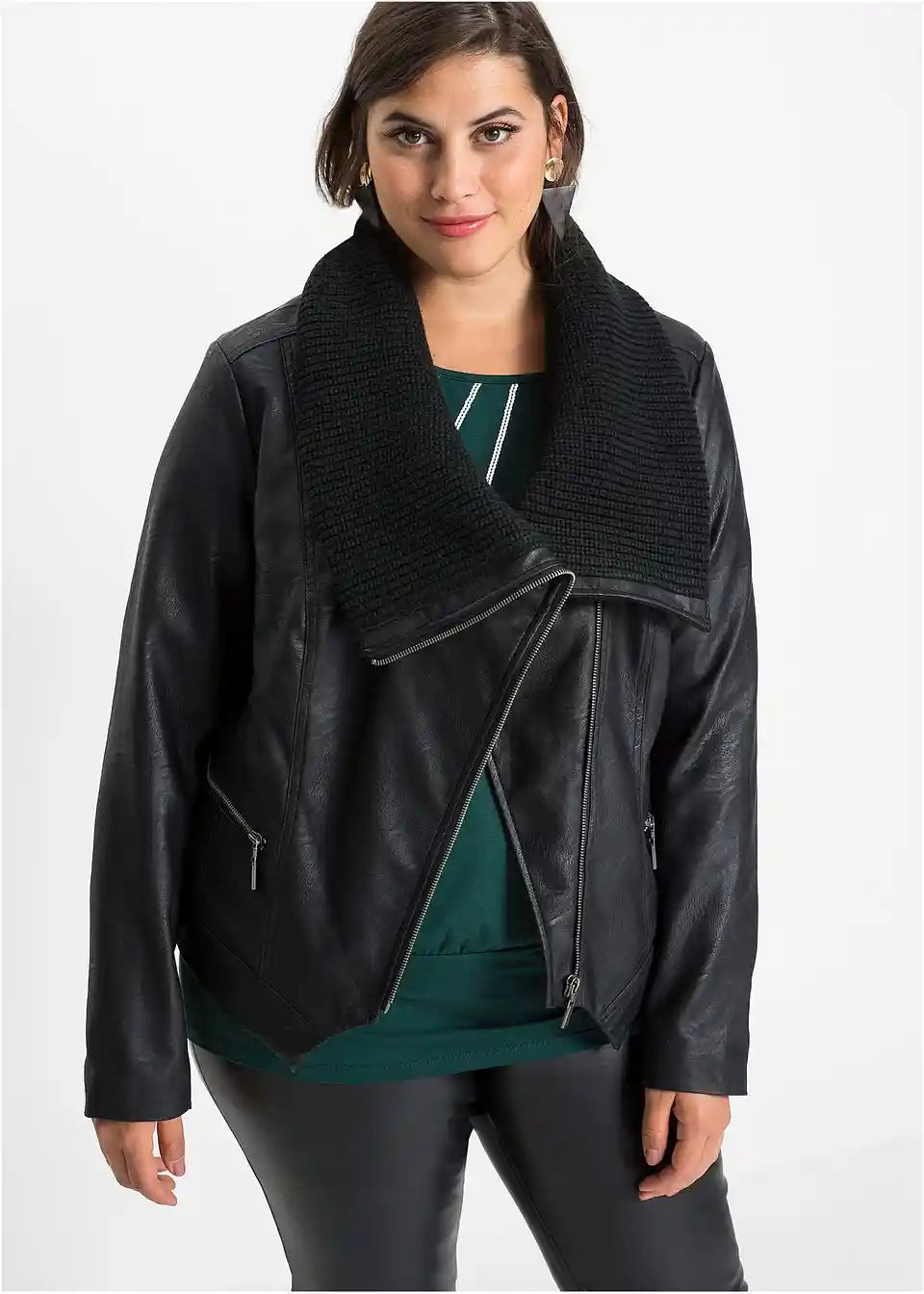 Ova jakna od imitacije kože marke BODYFLIRT lijepo oblikuje gornji dio tijela. Veliki šal ovratnik optički sužava sredinu tijela i grije vrat kada je zakopčan. Pojas s središnjim izrezom vizualno izdužuje struk. Jakna se zakopčava koso postavljenim patentnim zatvaračem. Dva džepa s patentnim zatvaračima i promišljeno postavljeni šavovi upotpunjuju elegantan, ali ležeran dojam ove prijelazne jakne u glatkom kožnom izgledu.