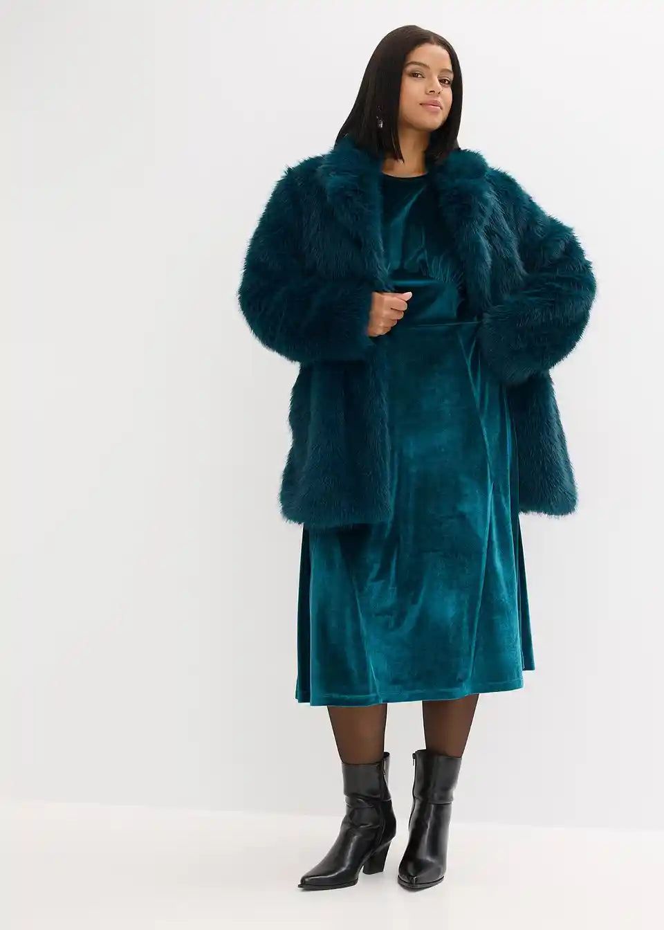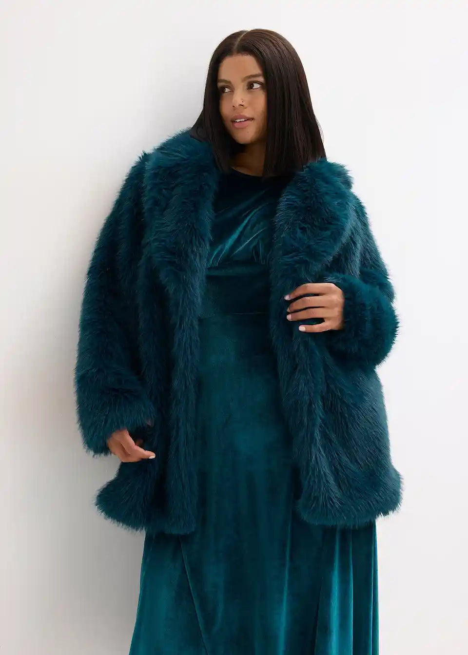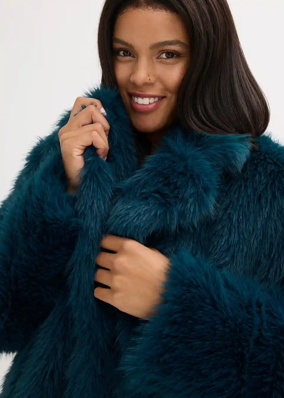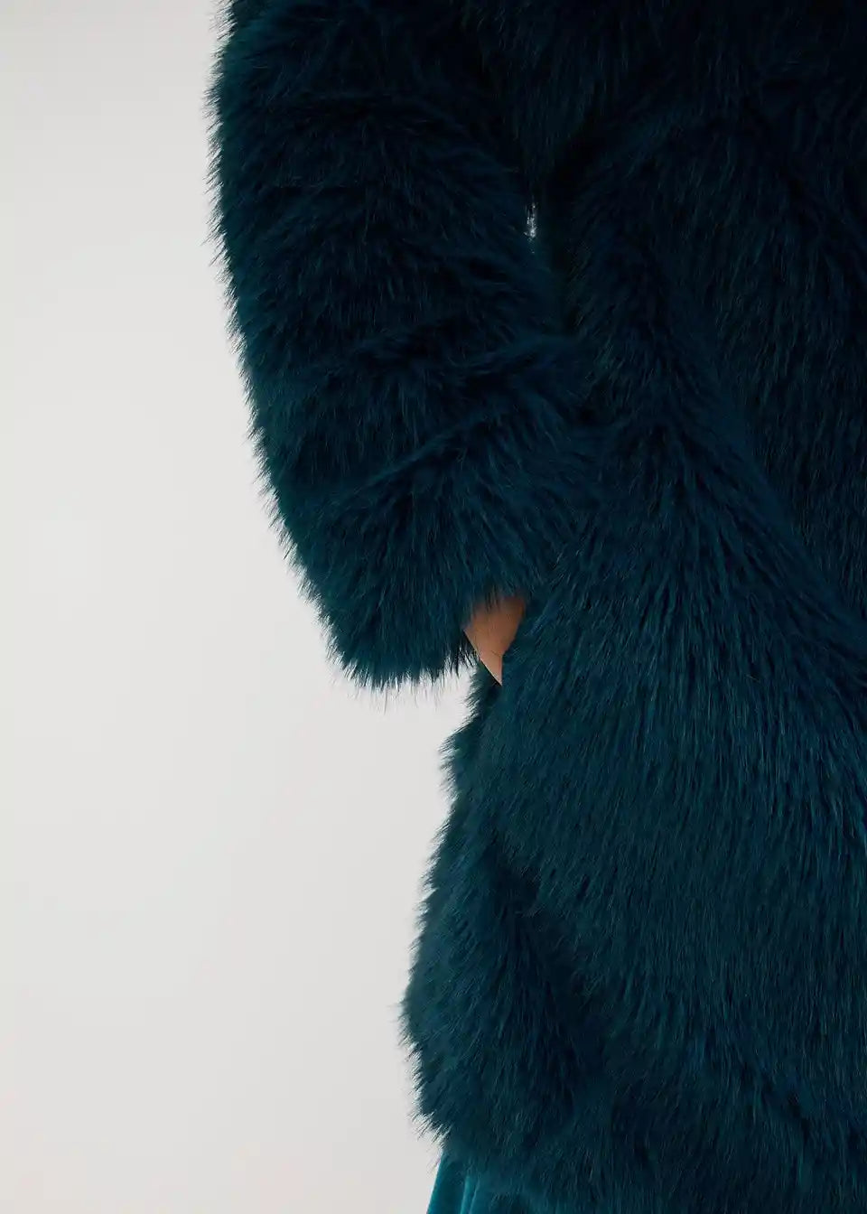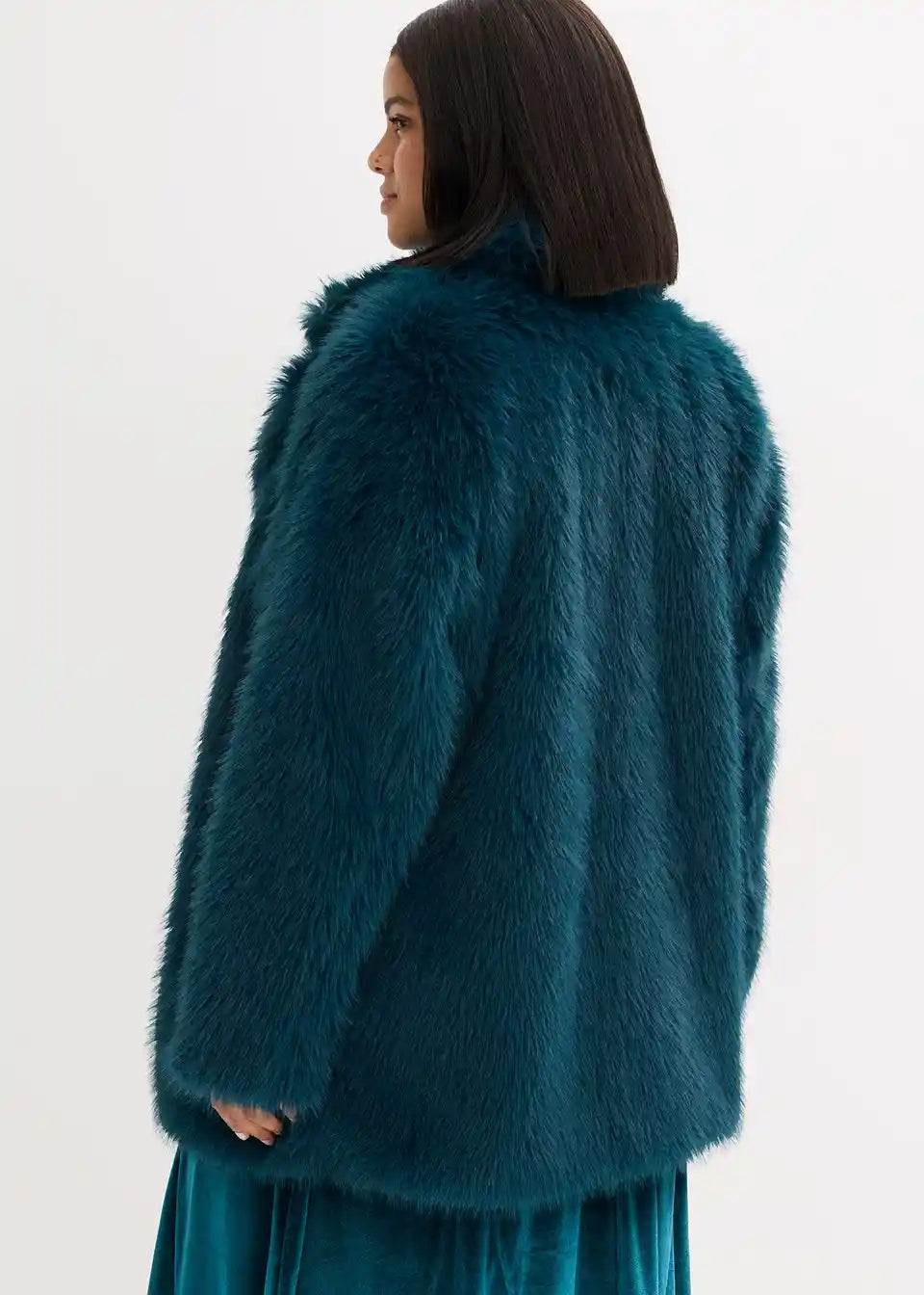Moderna jakna od umjetnog krzna s rever ovratnikom i kopčanjem na druker sprijeda.
