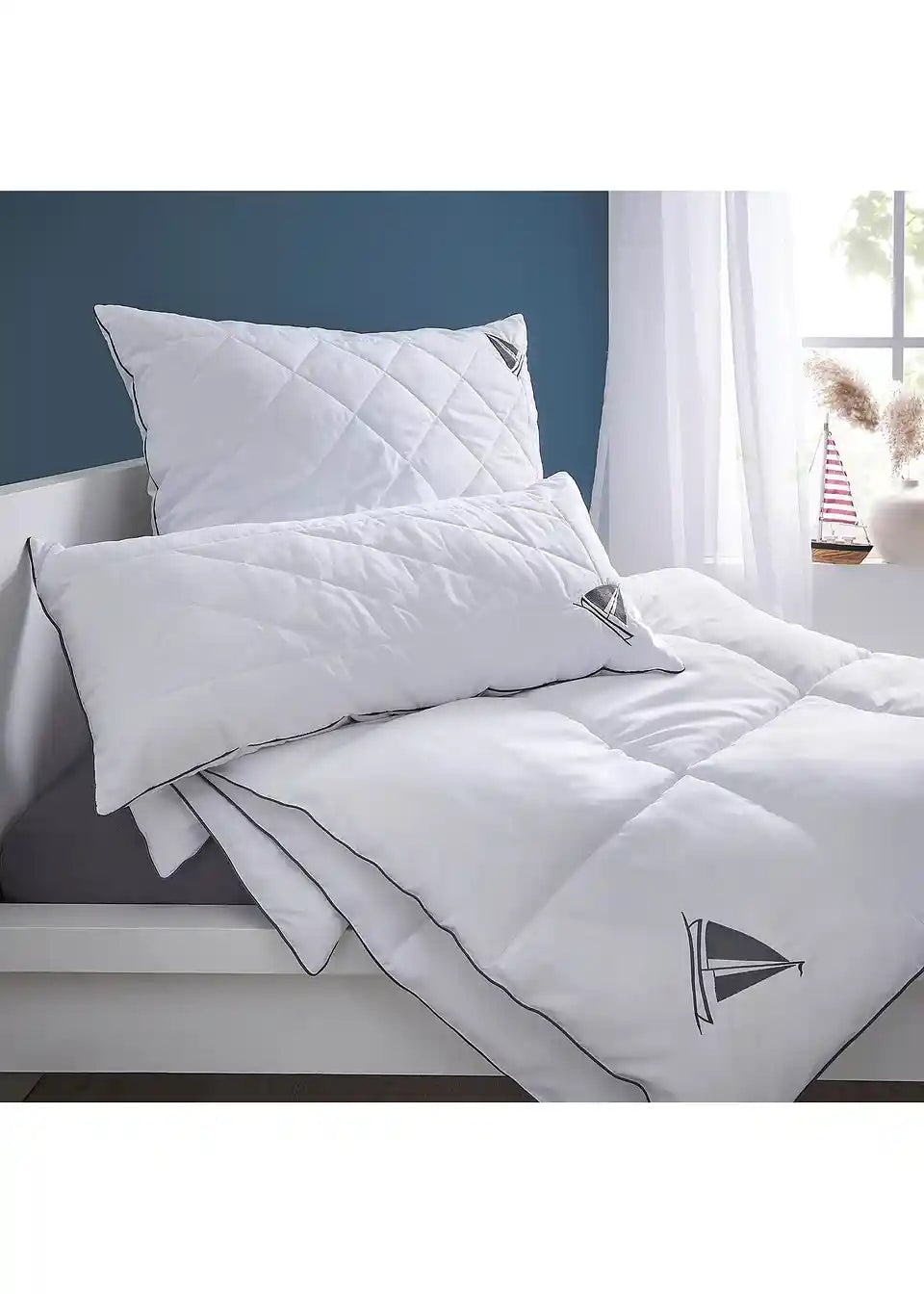 Ovaj jastuk je čvrste kvalitete, ali i dalje udoban. Osjeća se poput pravog jastuka s perjem, ali je ispunjen poliesterskim punjenjem. Ukrašen vezenim motivom jedrenjaka.