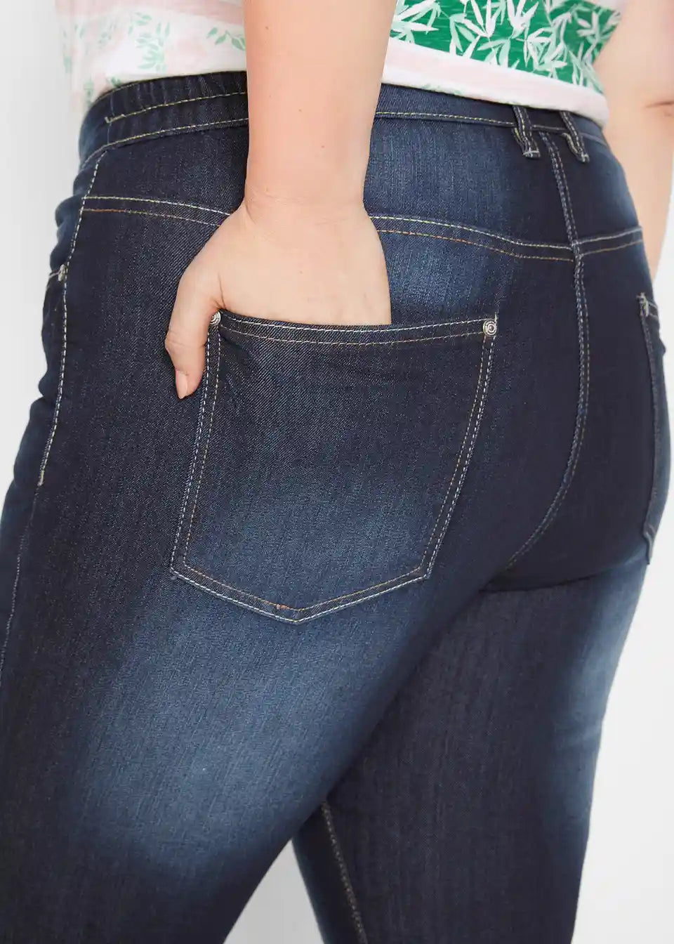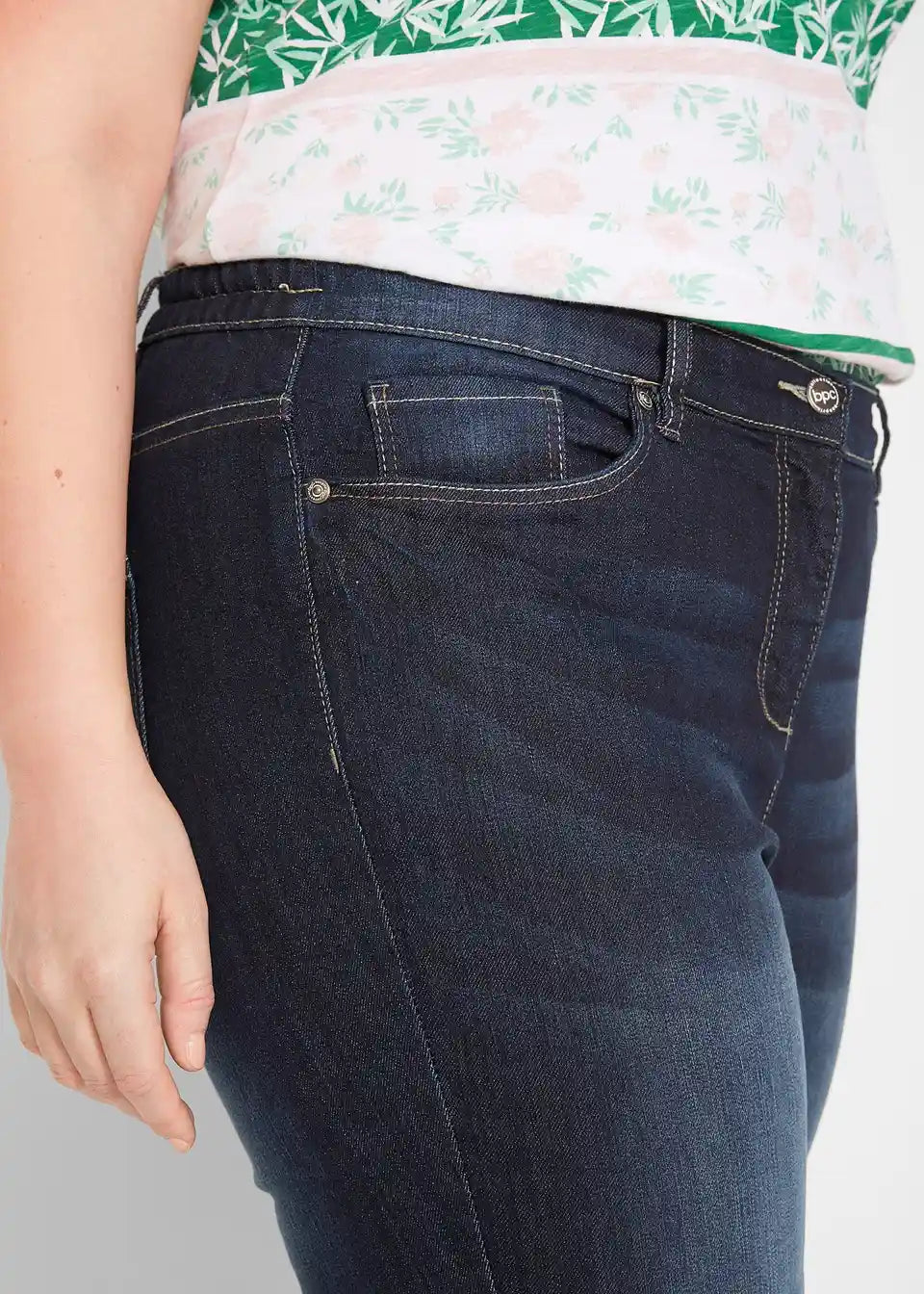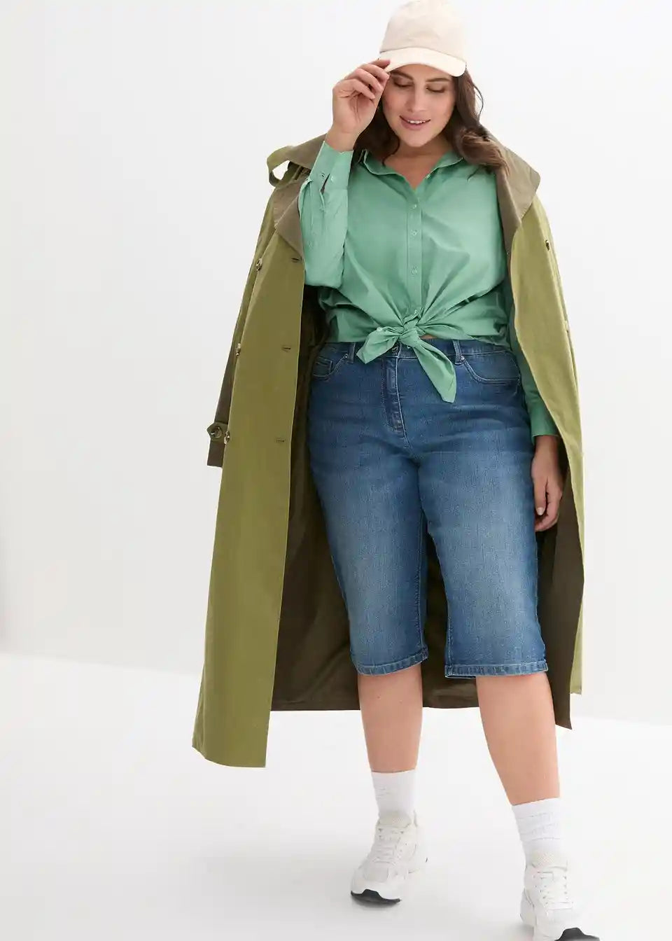 Udobne Stretch Jeans Bermuda hlače iz kolekcije bpc višenamjenski su modni artikl. Zahvaljujući visokom dijelu elastične pasice i praktičnom zatvaranju s gumbom i patentnim zatvaračem, model je vrlo ugodan za nošenje. Dekorativni detalj hlača u stilu s pet džepova i pojasnim petljama je podvrnuti završetak nogavica. Elastična tkanina osigurava ugodno prianjanje i figuri prilagodljiv oblik Bermudi.