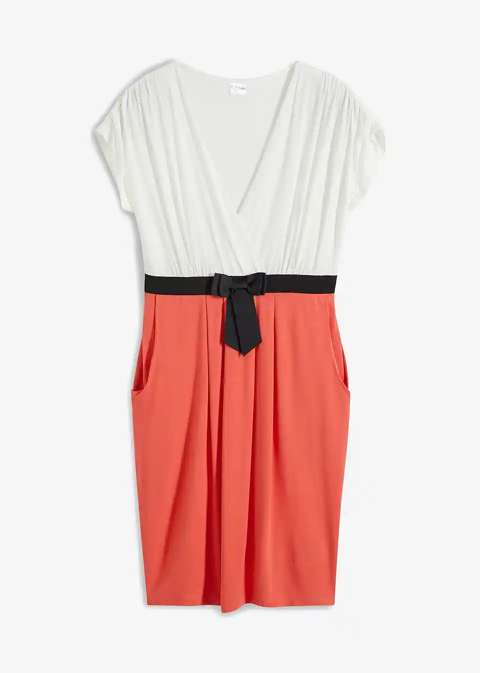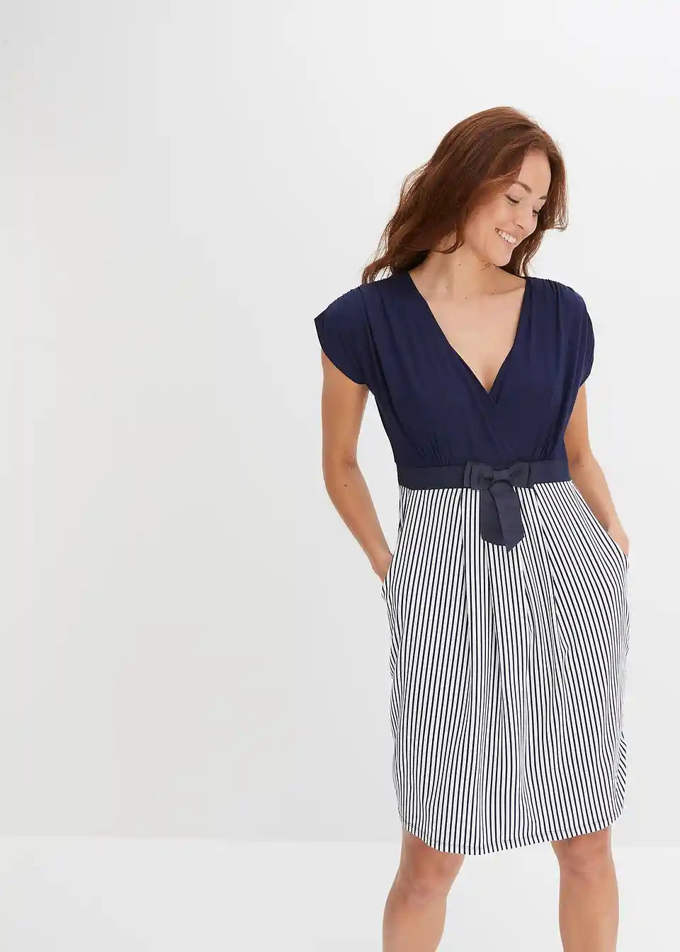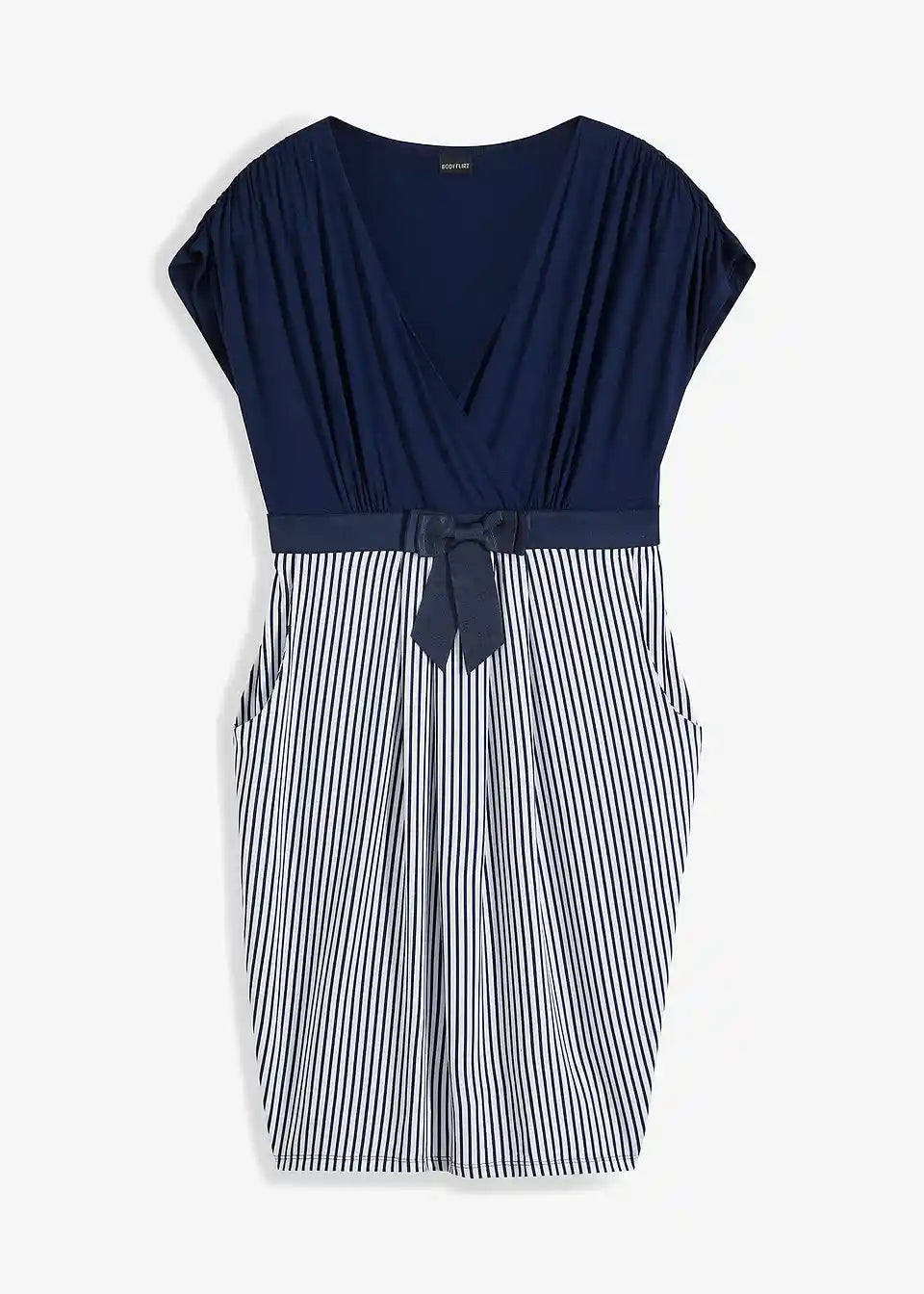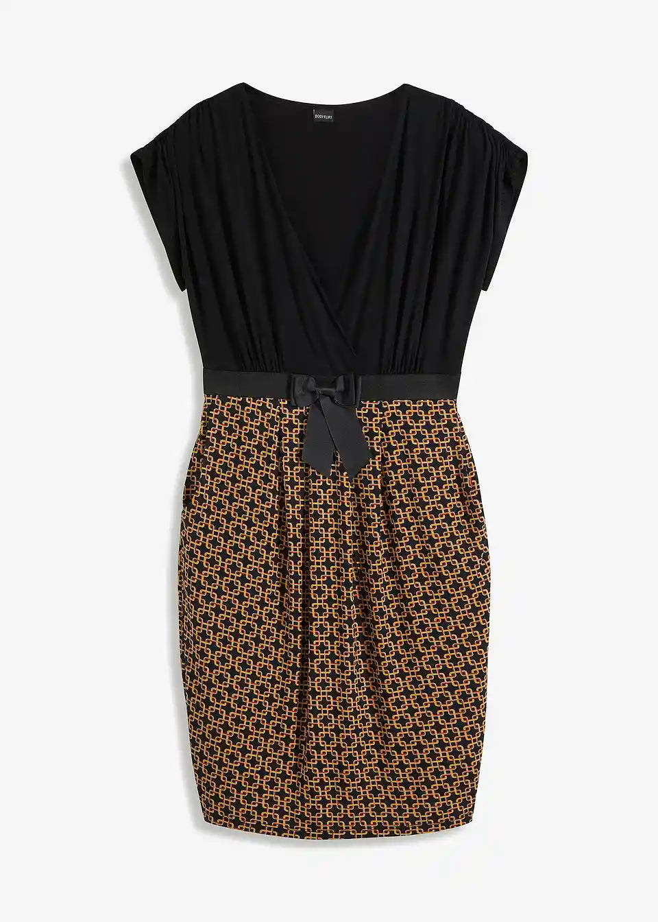 Ova haljina od majice BODYFLIRT očarava ženstvenim detaljima. Podignuti struk i laskavi kroj čine haljinu privlačnim izborom za mnoge prilike. Moderan naglasak je našiveni, u kontrastnoj boji remen s mašnom, koji haljini daje sofisticirani izgled i omogućuje optimalno pristajanje. Gornji dio u omotač stilu savršeno ističe dekolte. Naborani rukavi i suknja nabrana u faldama skladno upotpunjuju izgled ove pripijene haljine koja privlači poglede.