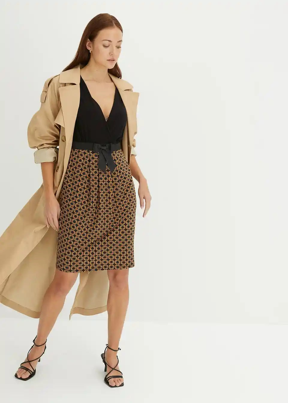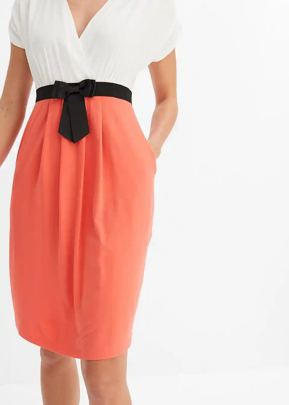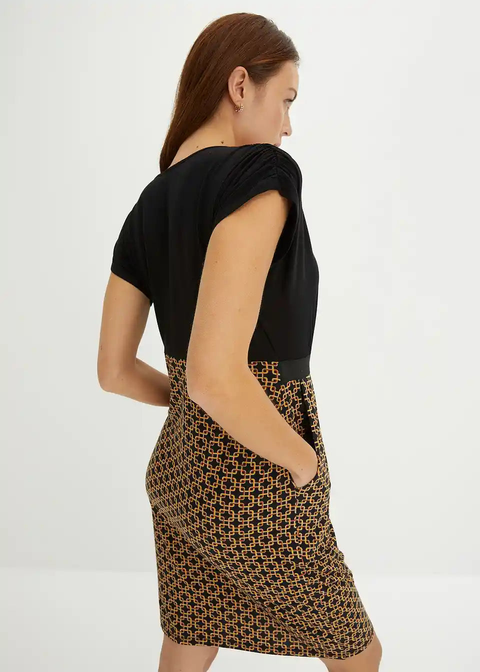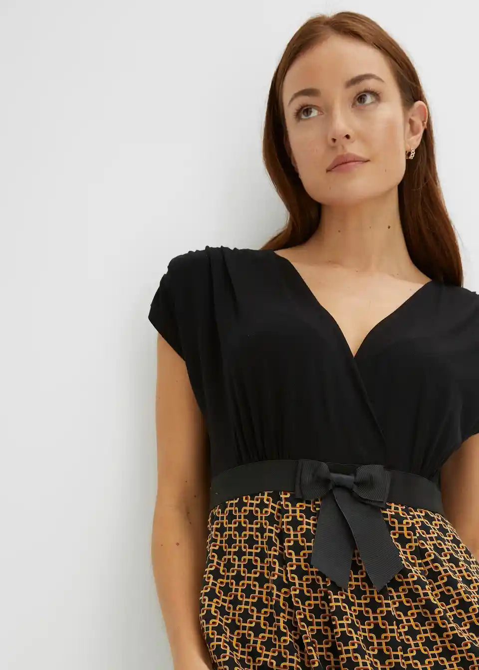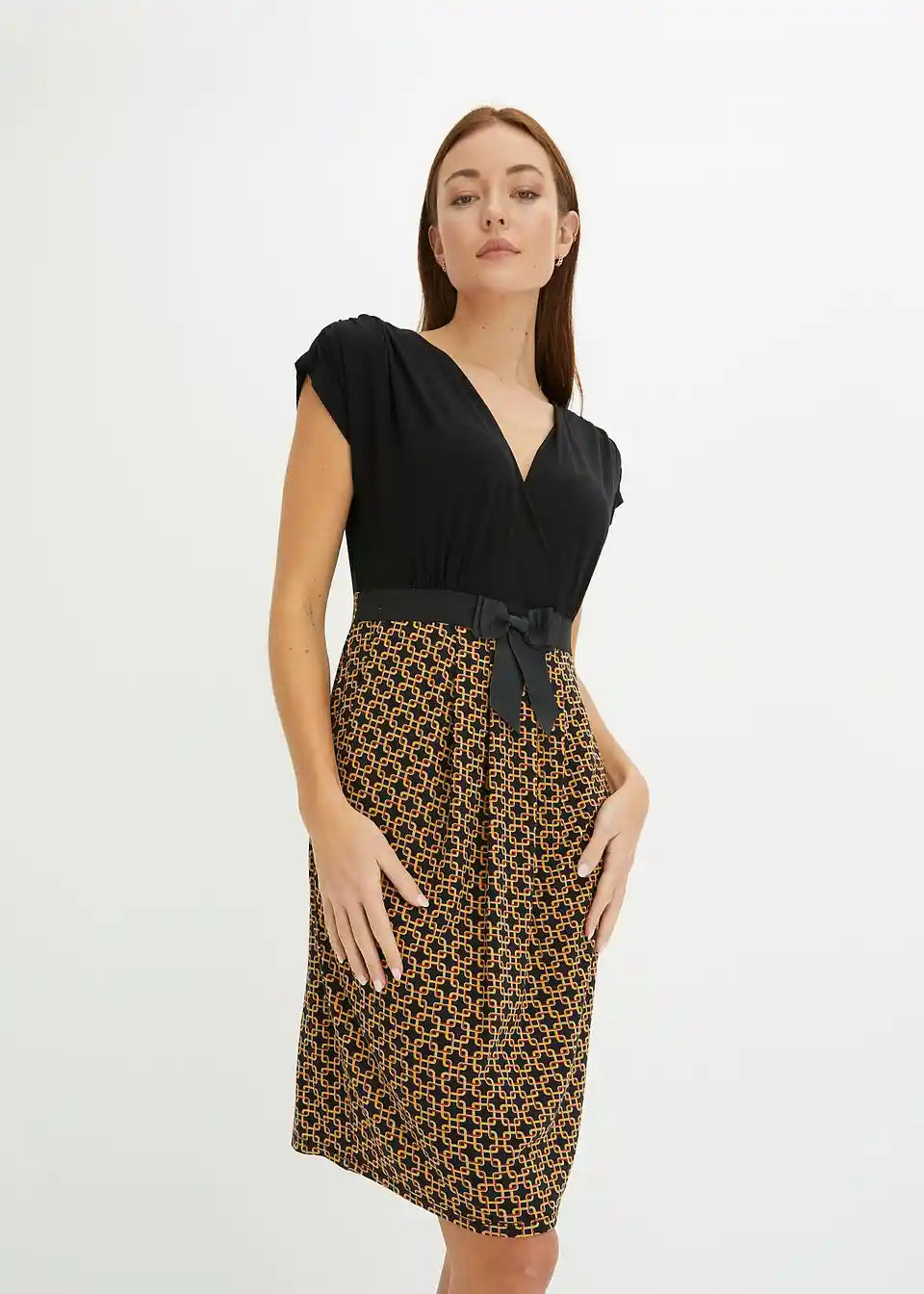 Ova haljina od majice BODYFLIRT očarava ženstvenim detaljima. Podignuti struk i laskavi kroj čine haljinu privlačnim izborom za mnoge prilike. Moderan naglasak je našiveni, u kontrastnoj boji remen s mašnom, koji haljini daje sofisticirani izgled i omogućuje optimalno pristajanje. Gornji dio u omotač stilu savršeno ističe dekolte. Naborani rukavi i suknja nabrana u faldama skladno upotpunjuju izgled ove pripijene haljine koja privlači poglede.