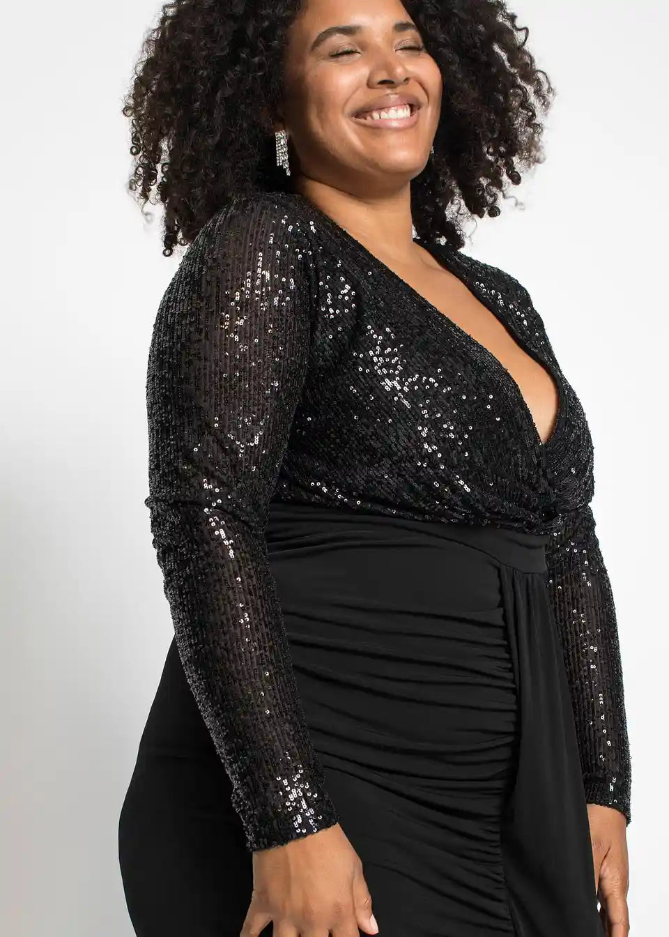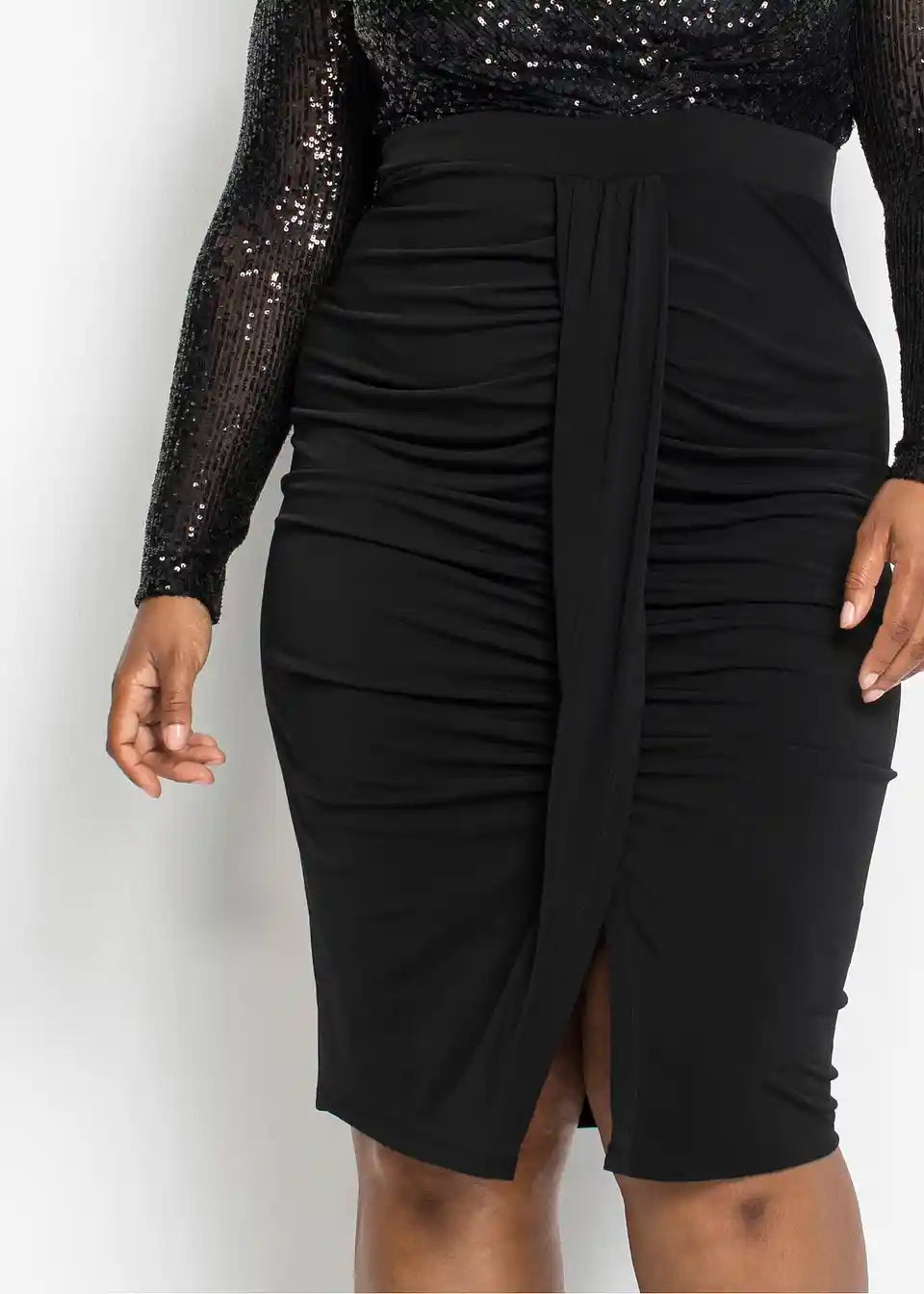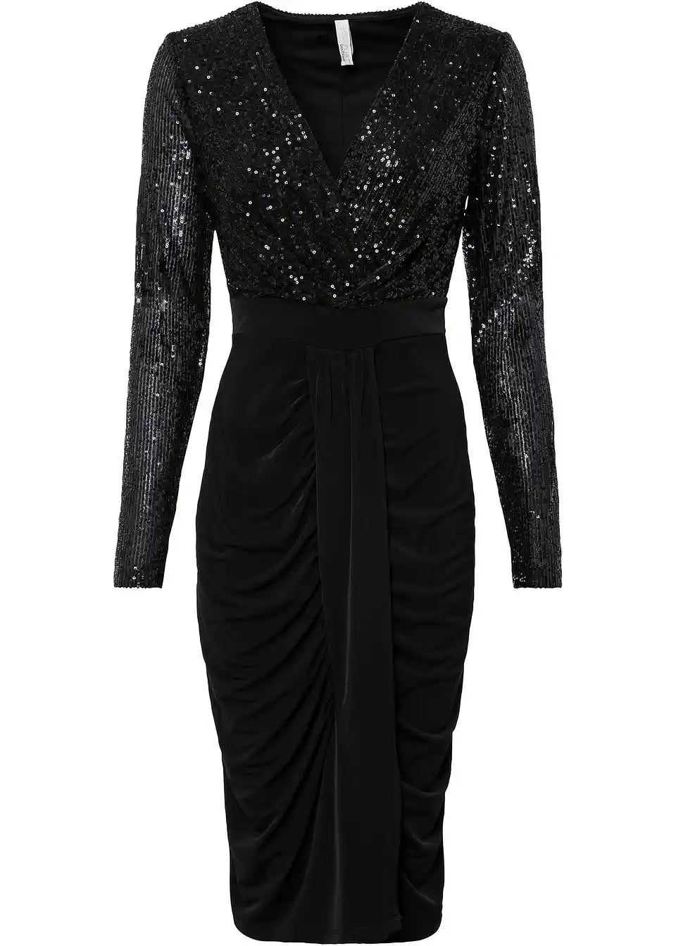 Ženstvena i svečana: haljina sa šljokicama, nabiranjem i drapiranjem pregače na suknji