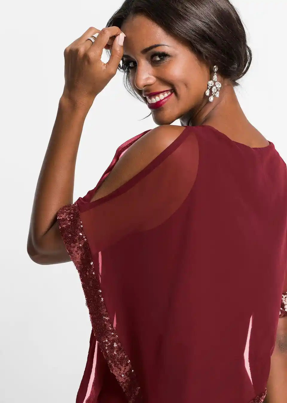 Žene će postati središte pozornosti u ovoj očaravajućoj večernjoj haljini brenda BODYFLIRT. Usko krojena haljina oduševljava širokim volanom koji poput stole leži na ramenima. Rub volana je raskošno ukrašen sjajnim šljokicama. Profinjeni prorez na nozi i izrezi na ramenima ističu zavodljiv stil haljine sa šljokicama.