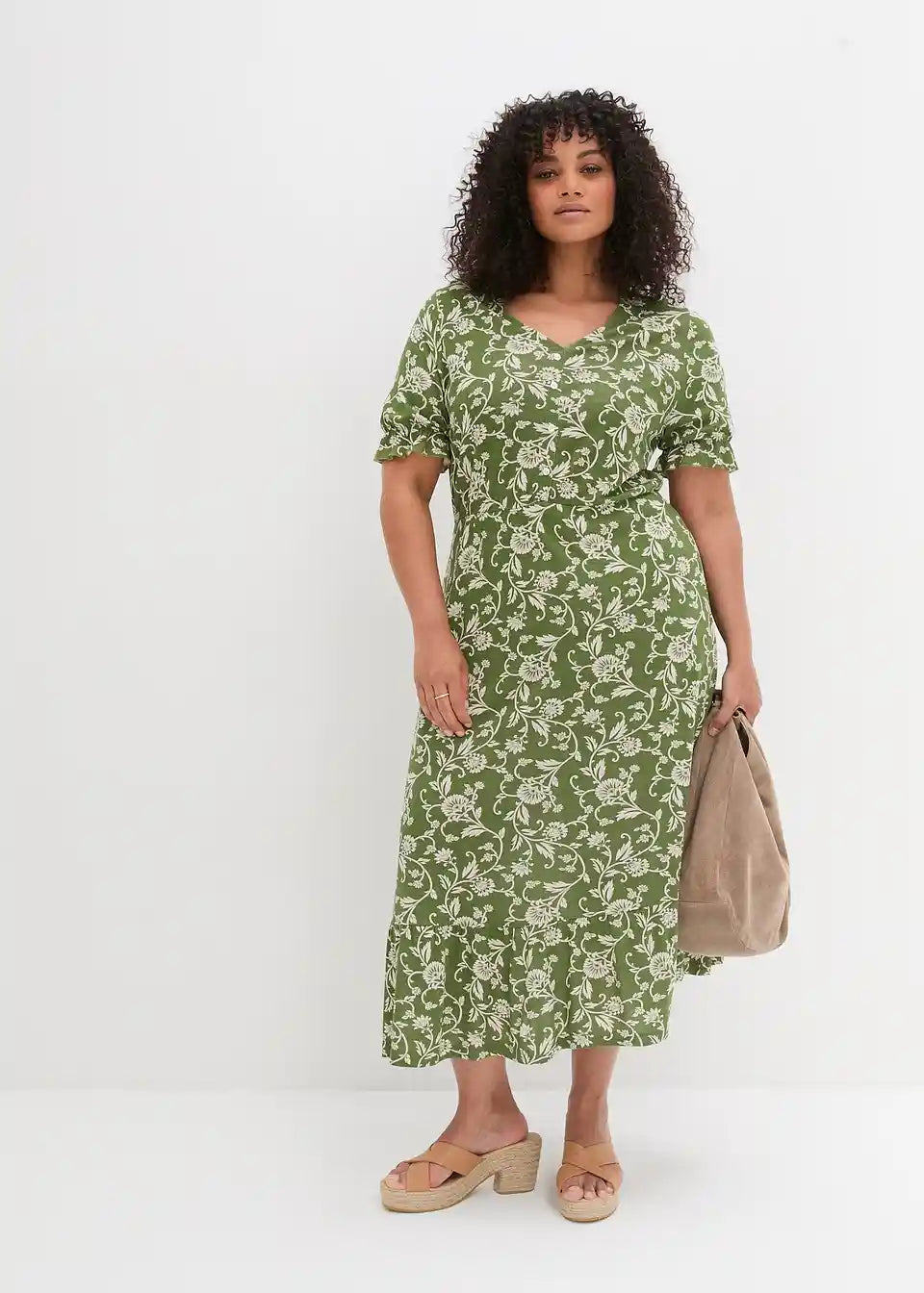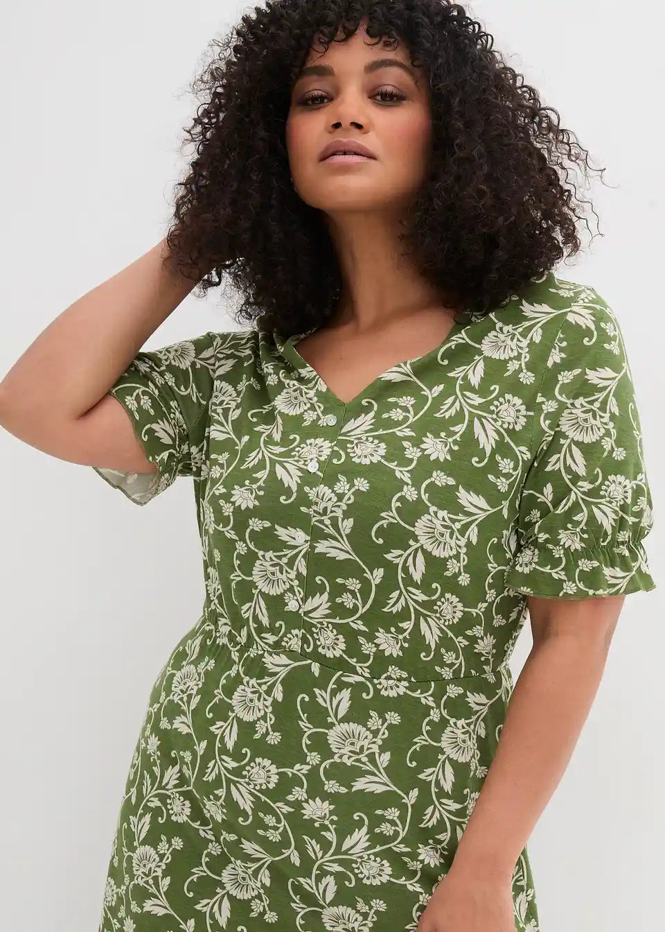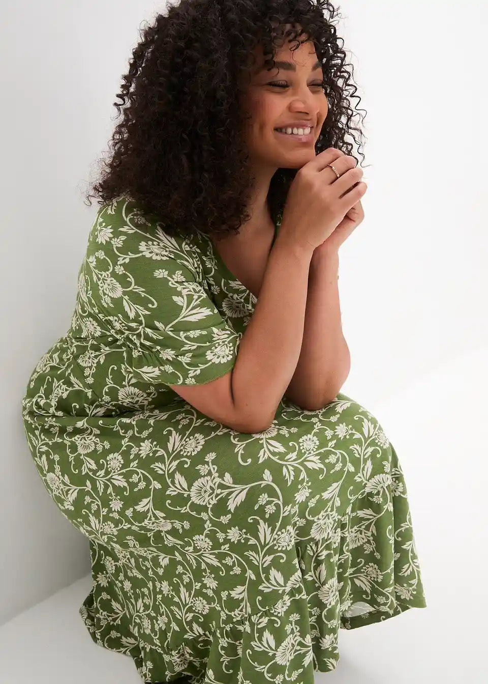 Haljina s cvjetnim uzorkom od jerseya s napuhanim rukavima i volanima