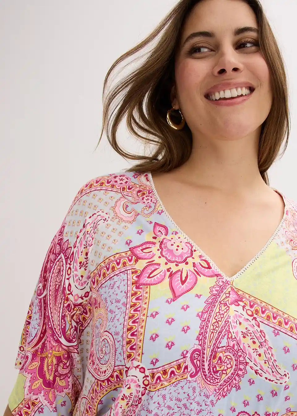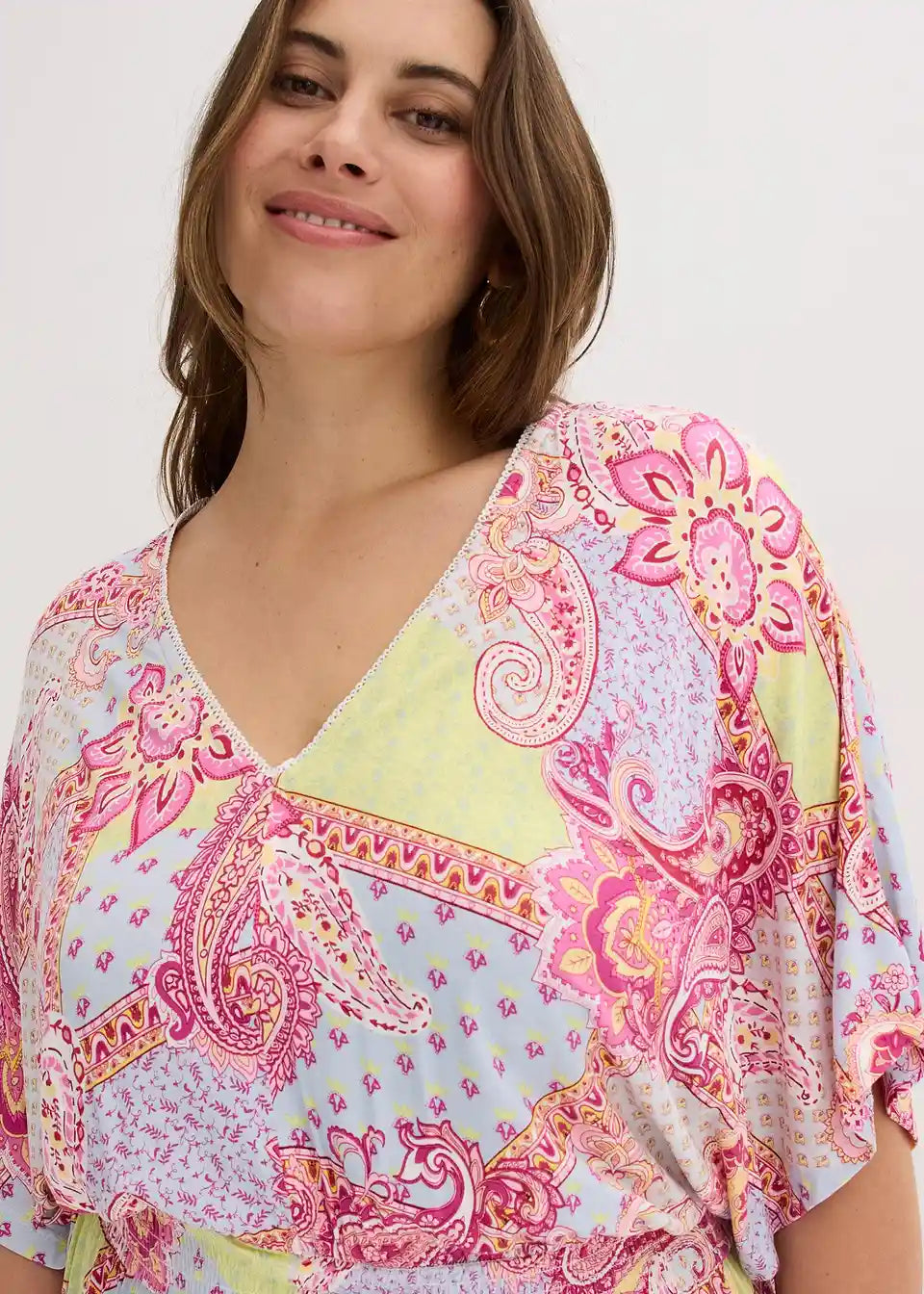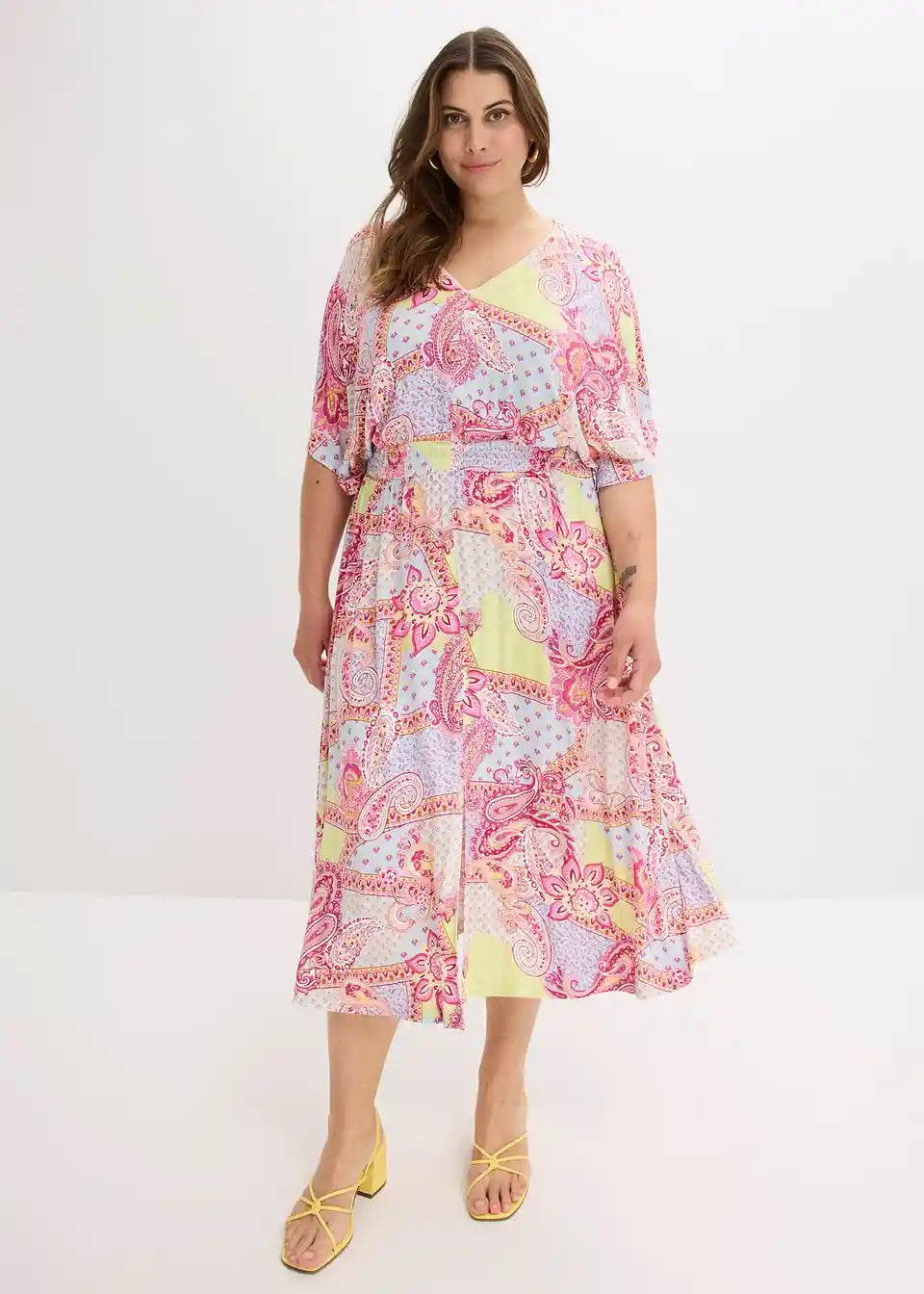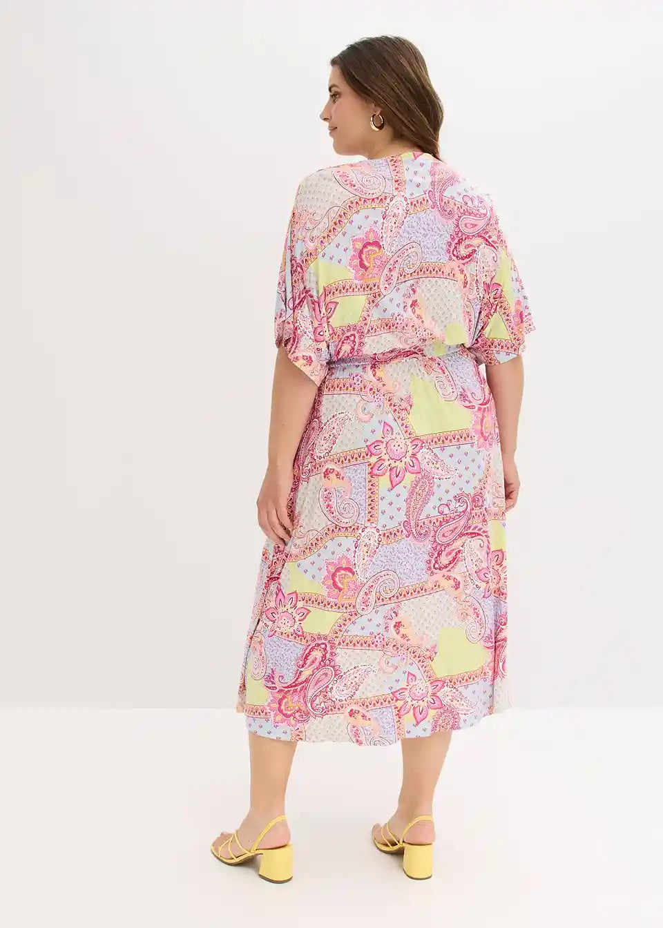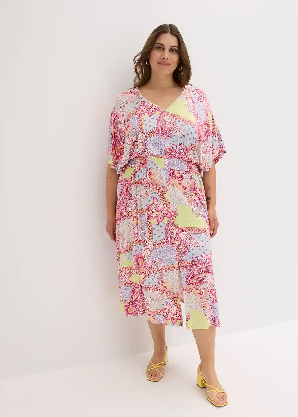 moderno printana jersey haljina midi duljine od mekane viskozne mješavine s elastičnim smok detaljem u struku i dekorativnom čipkom na izrezu