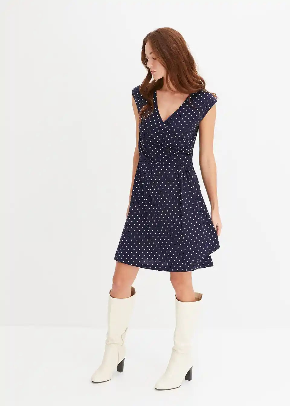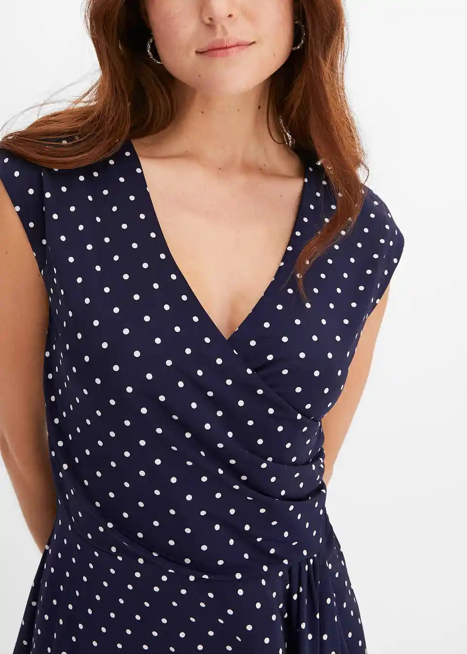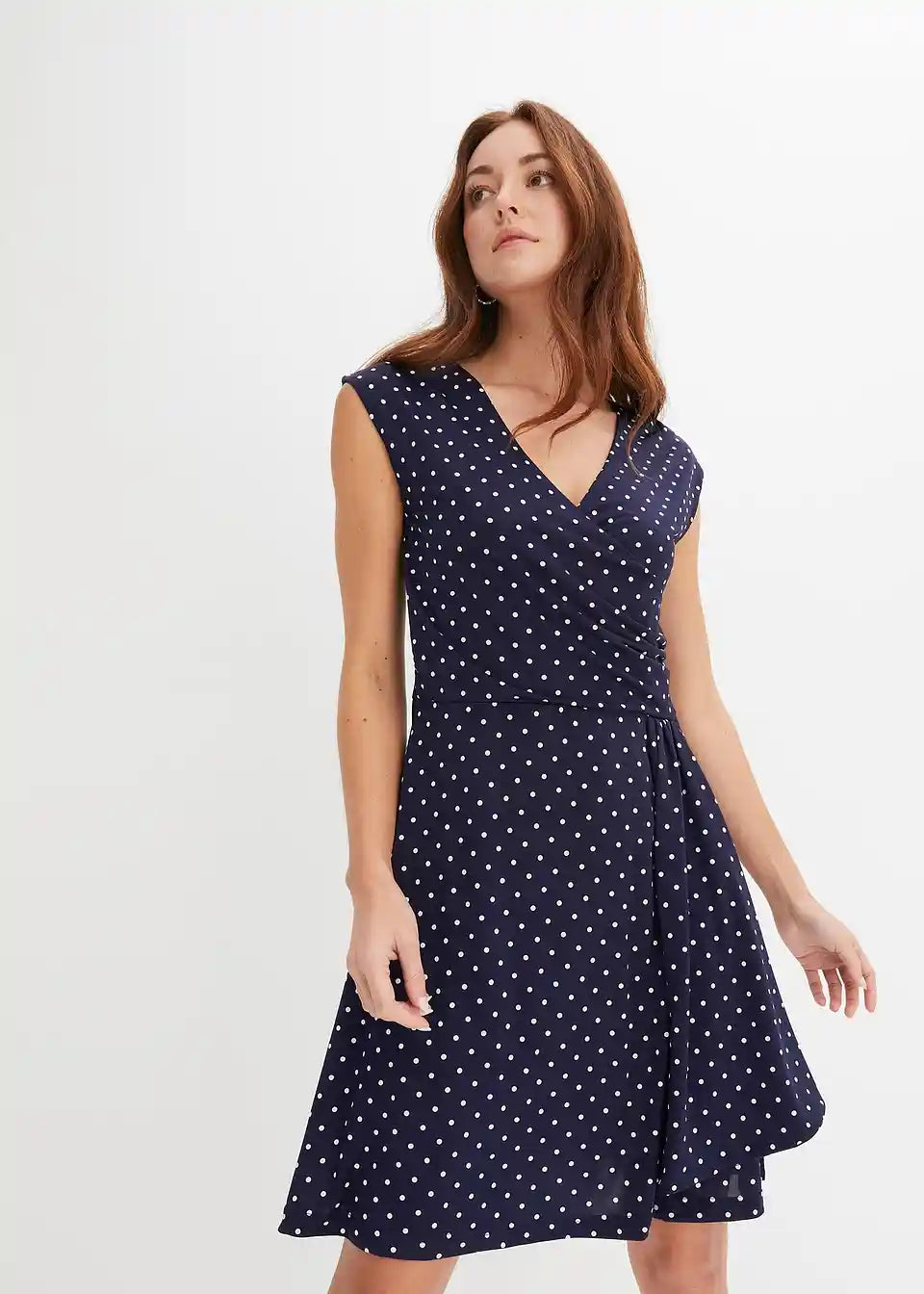 Za šetnju gradom ženstvena haljina s točkicama od BODYFLIRT-a čini odličan izbor. Bočni nabori donose lakoću haljini bez rukava i oblikuju tekuću siluetu. Uzorak s točkicama daje razigran izgled. Optika omota i duboki V-izrez ističu dekolte. Sandale na platformu s pletivom idealan su izbor za ovu ljetnu haljinu i zaokružuju ženstveni izgled.