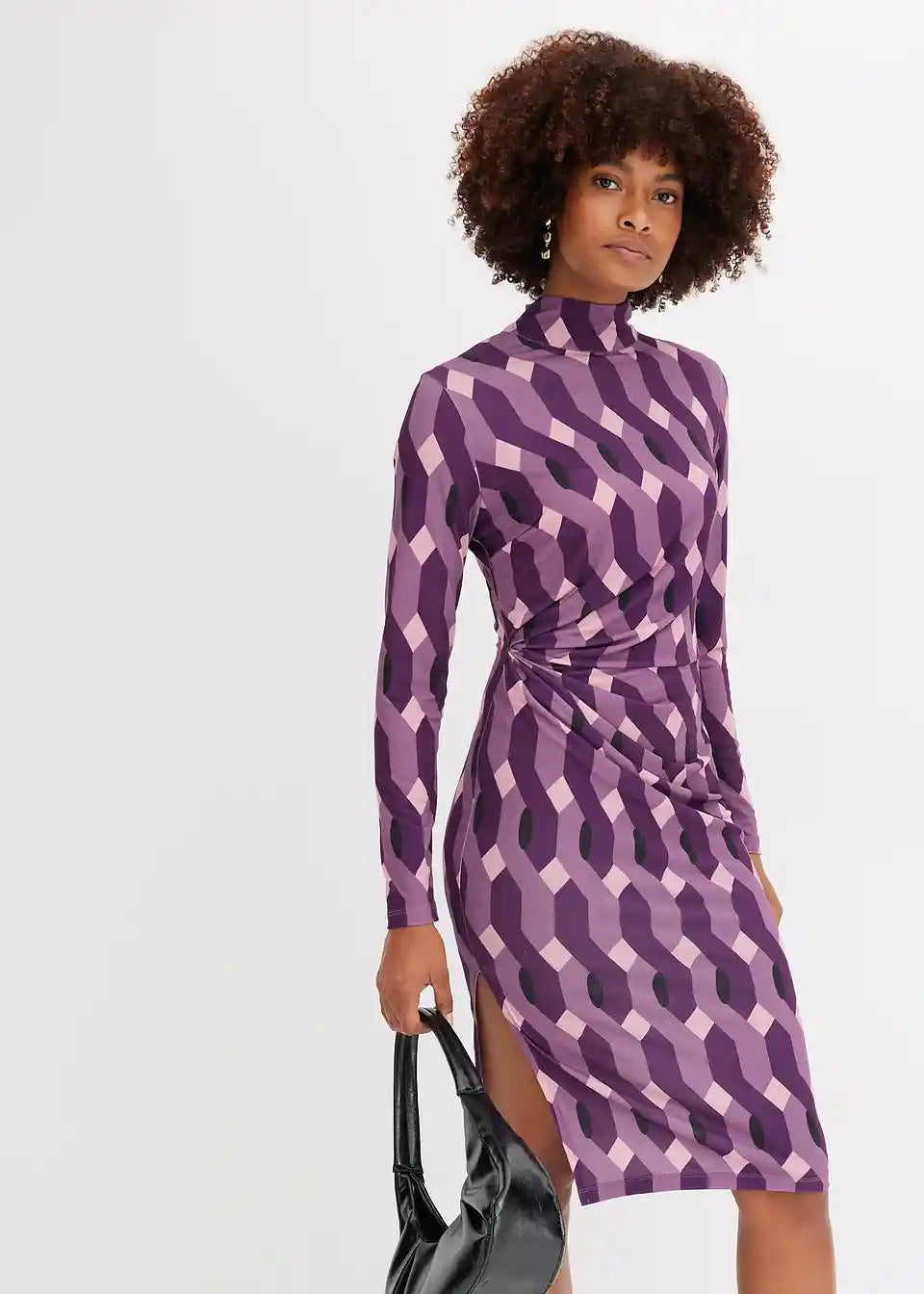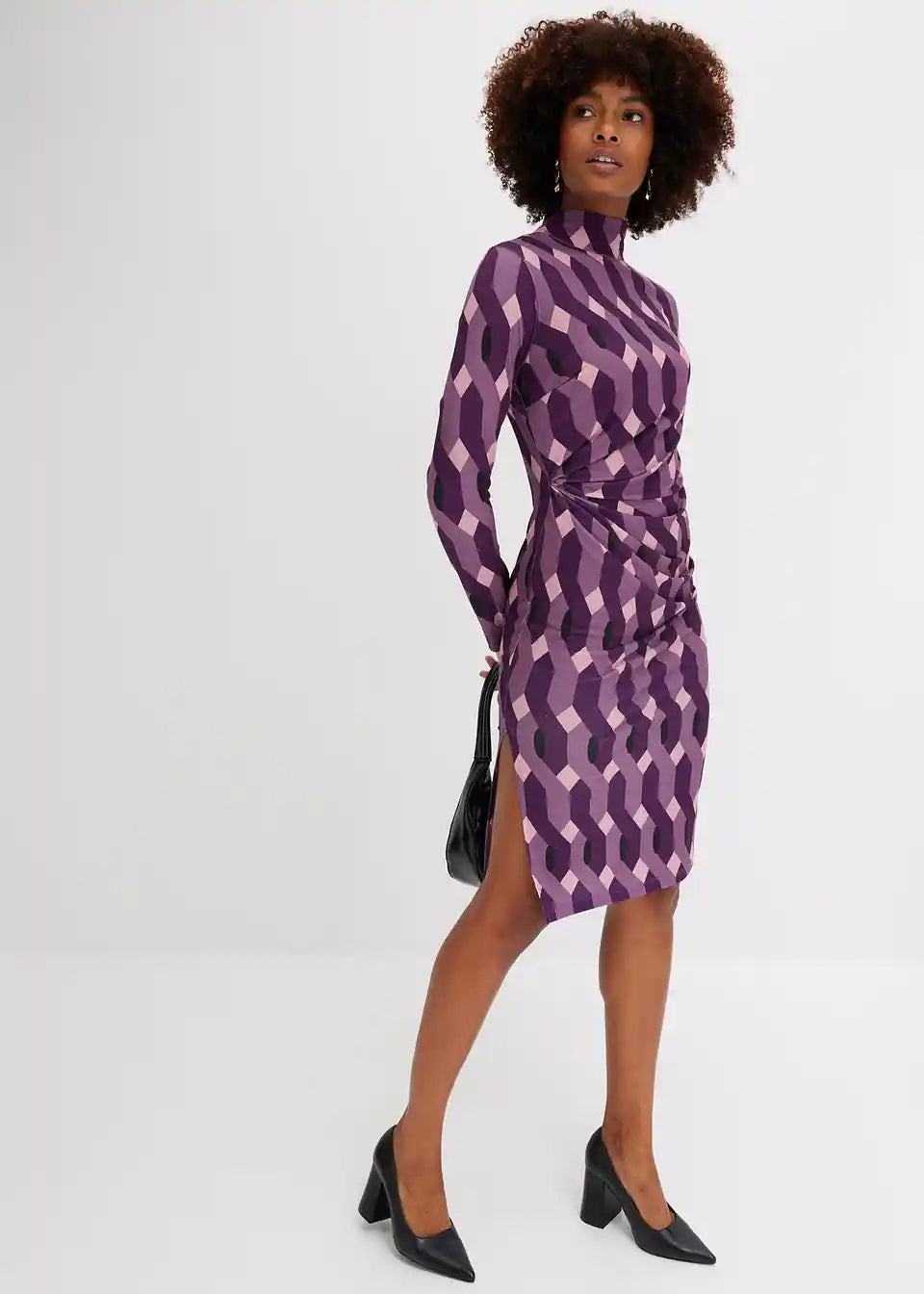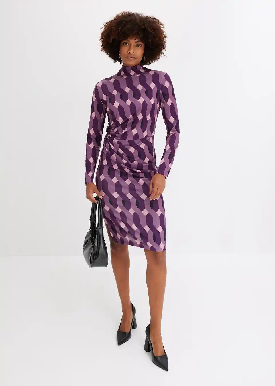 Moderno i profinjeno: Jersey haljina s visokim ovratnikom i nabiranjem na bočnom šavu.