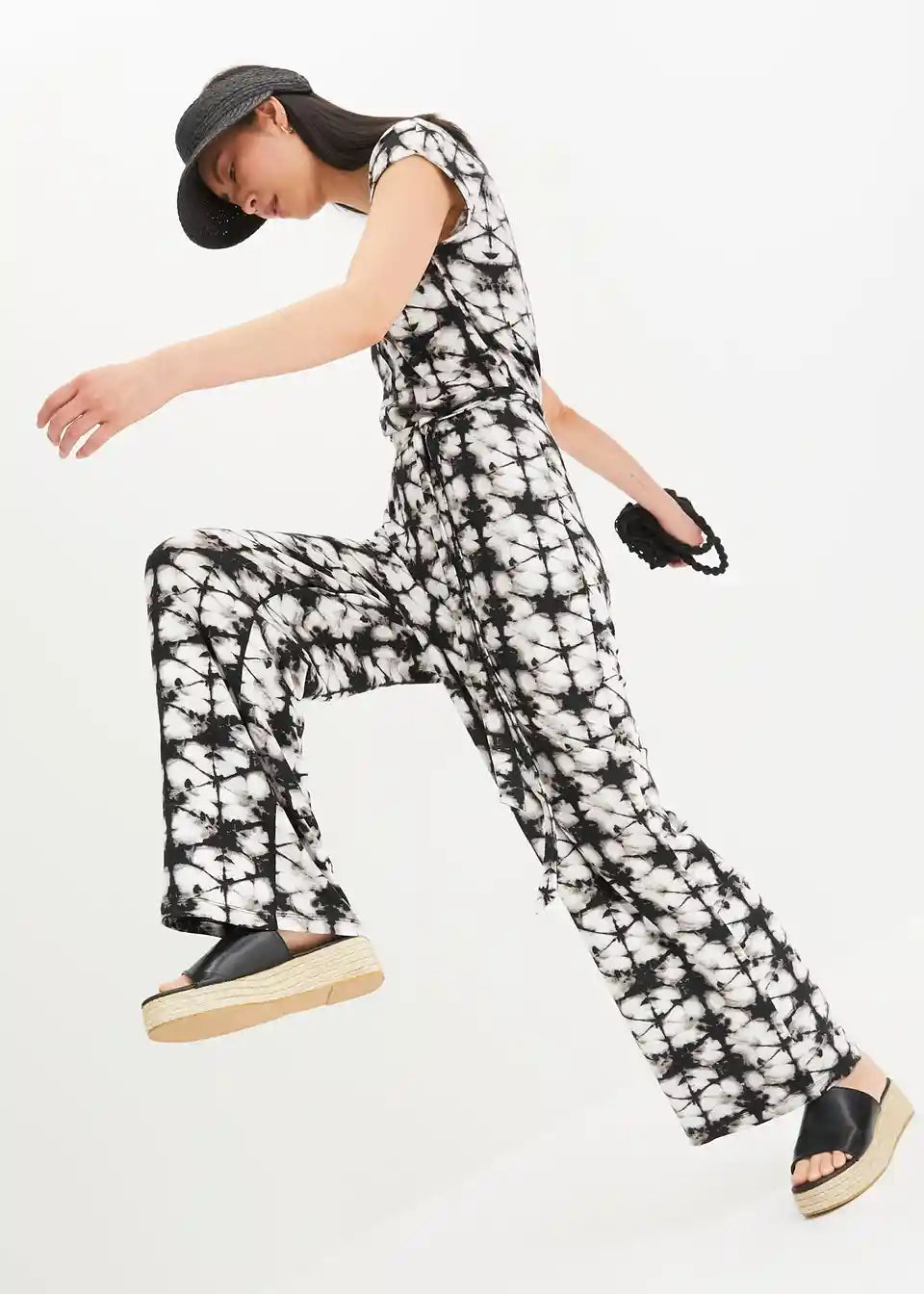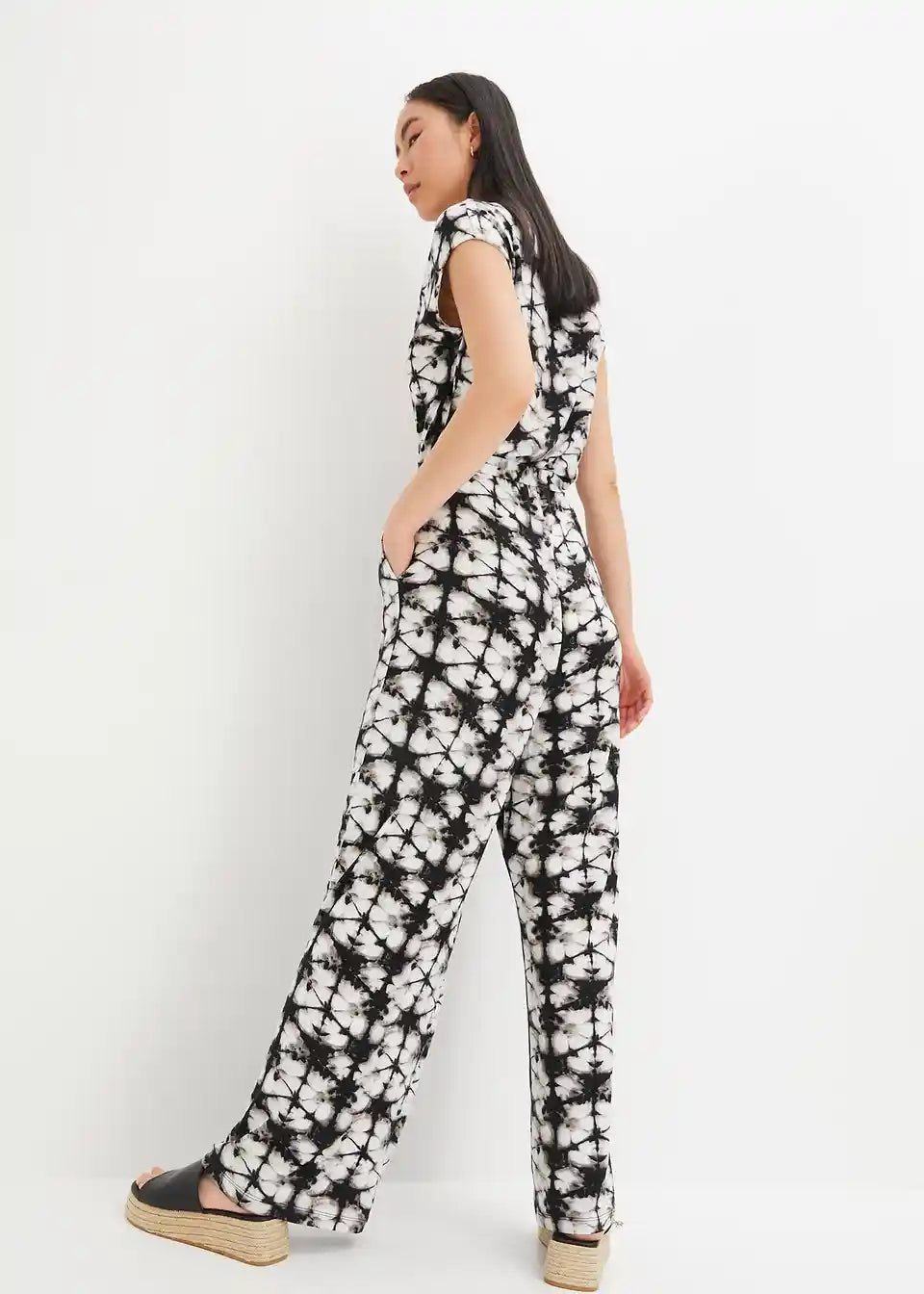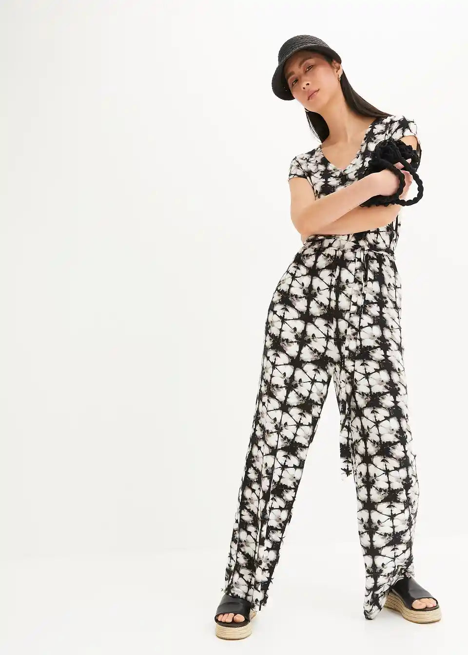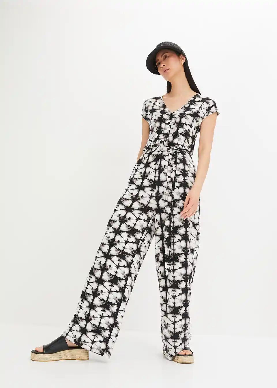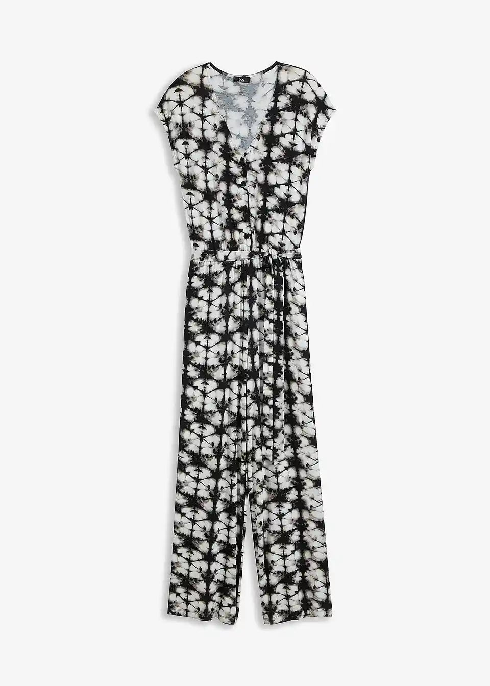 Modni jumpsuit od udobne jersey tkanine s V-izrezom i elastičnom gumom u struku