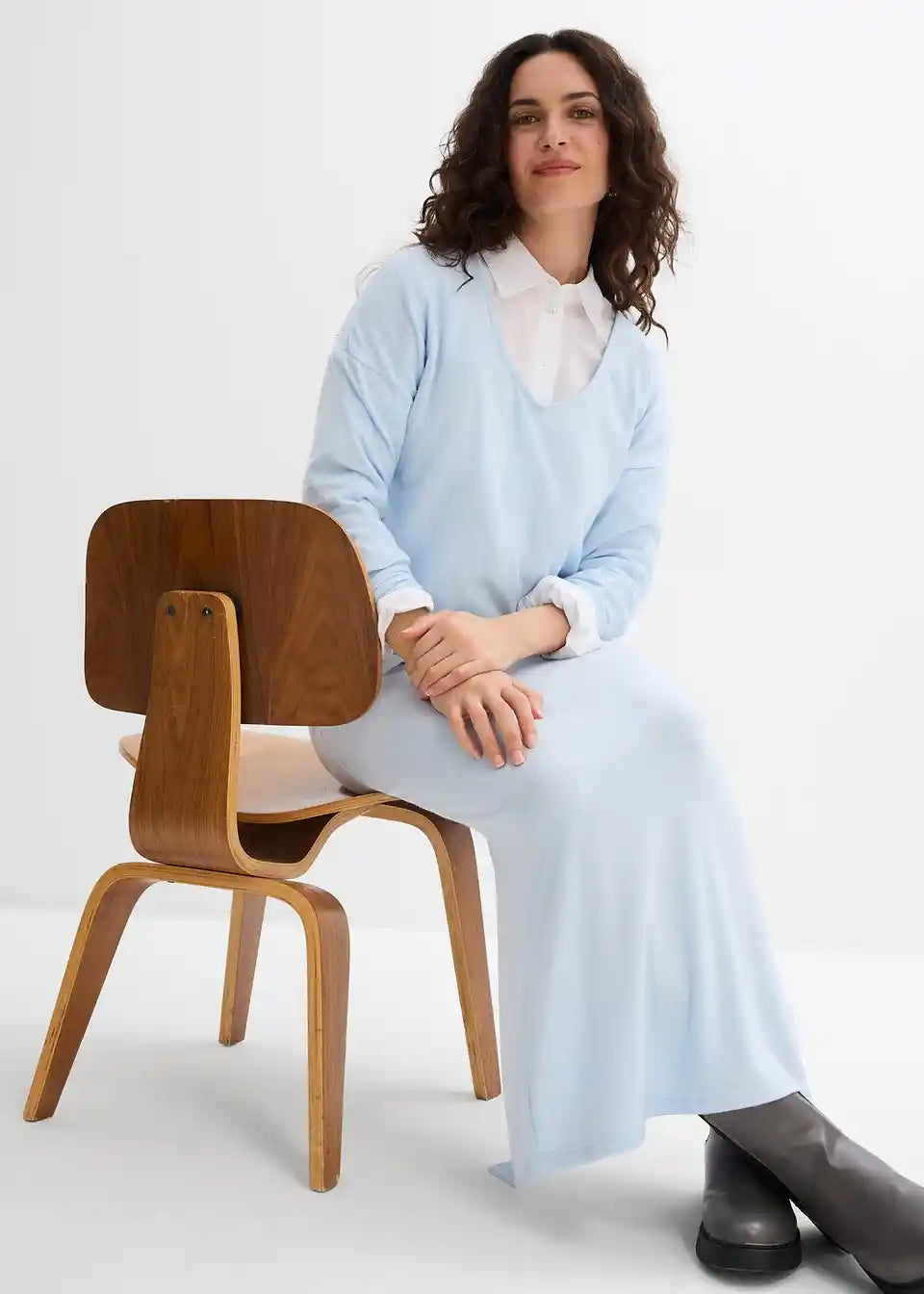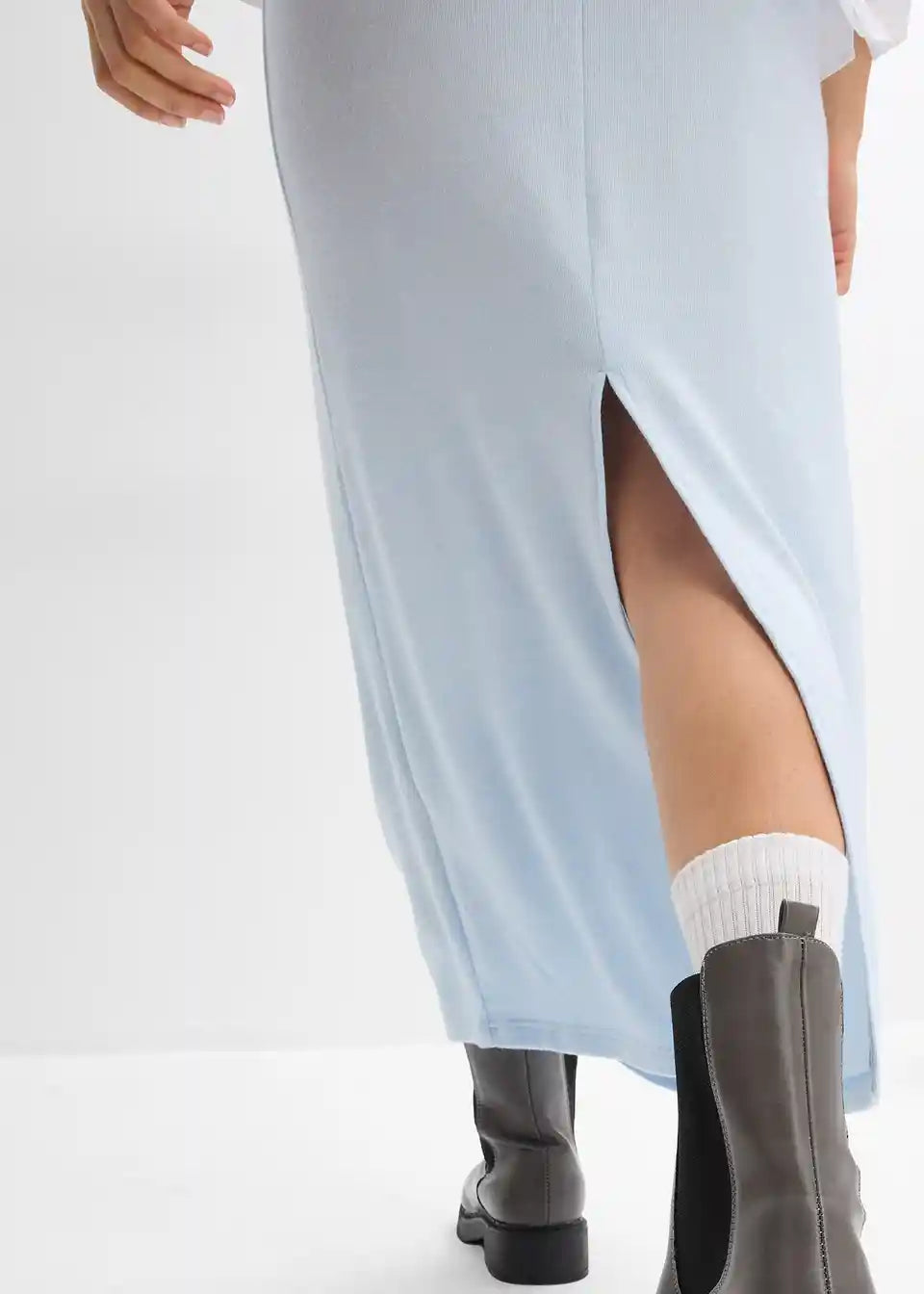 Maxi suknja u pletenom izgledu s visokim, elastičnim pojasom i stražnjim prorezom.