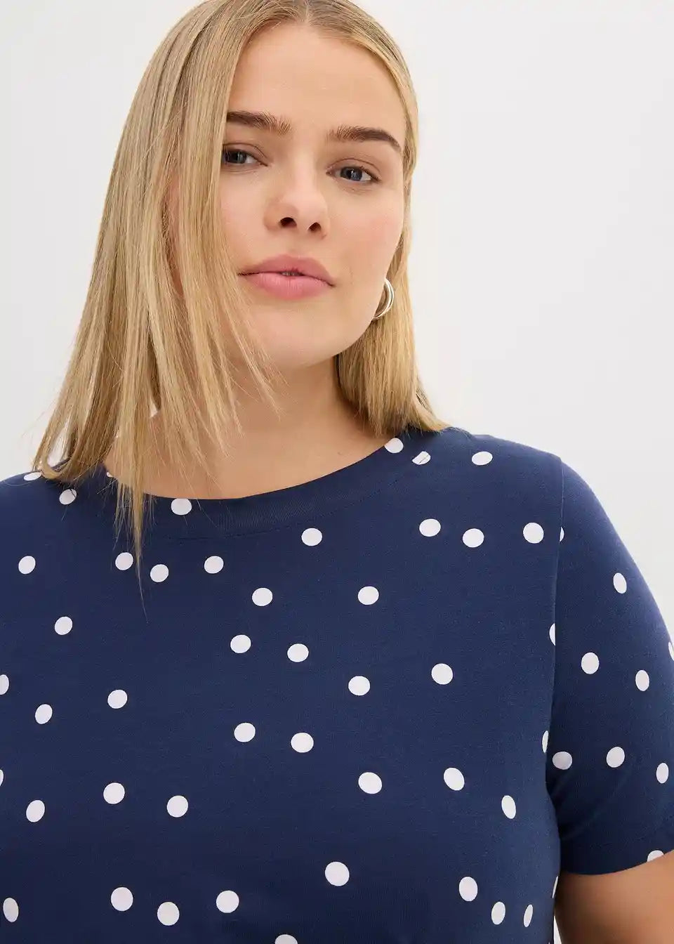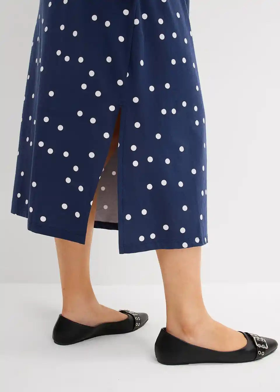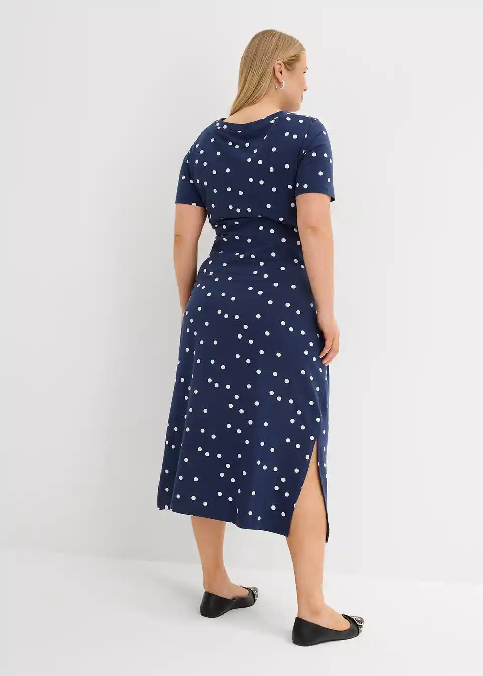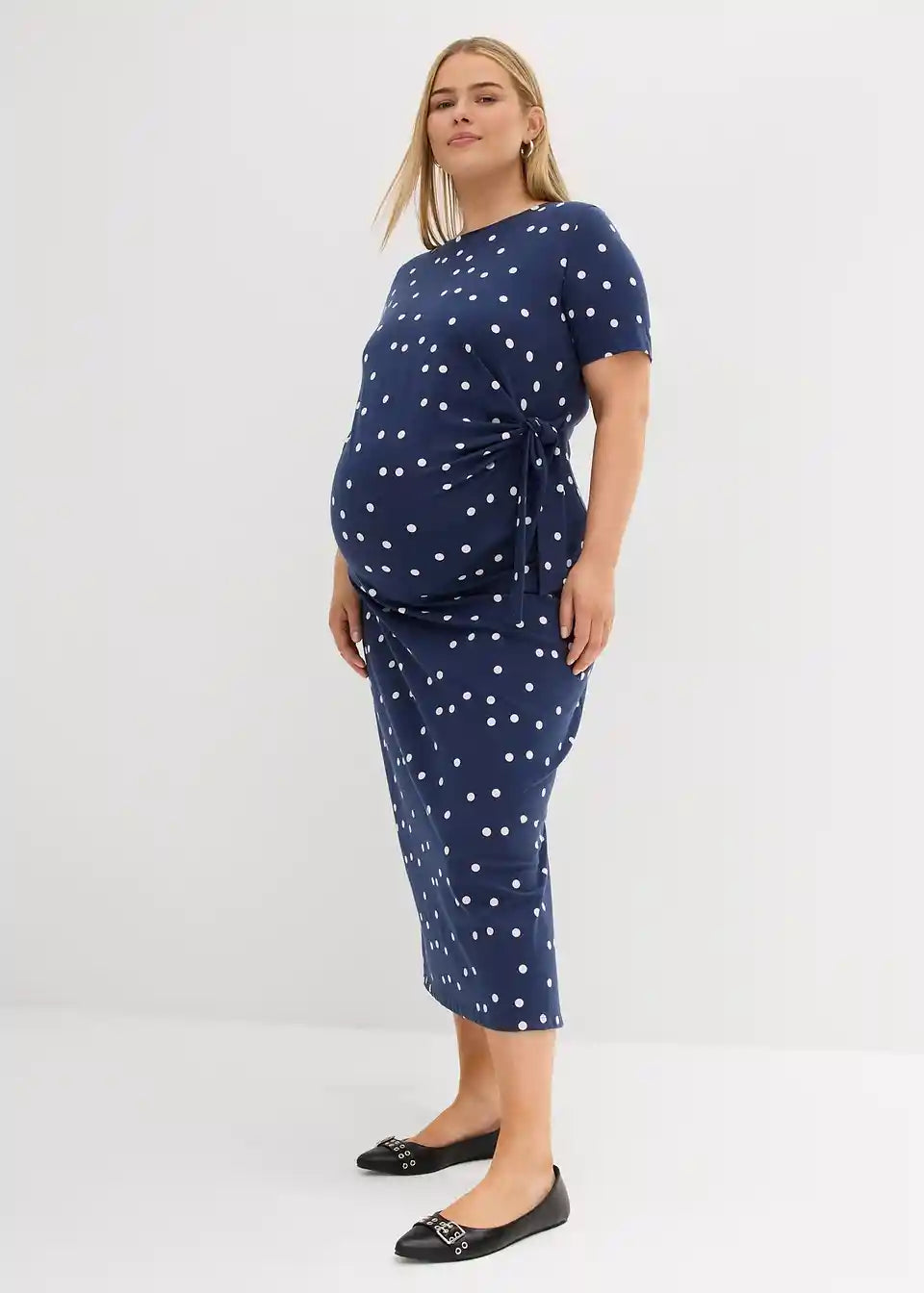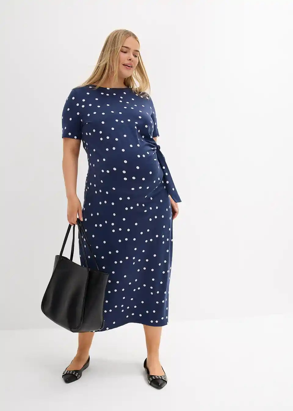 Mekana jersey trudnička haljina od organskog pamuka s okruglim izrezom i kratkim rukavima ugodne dužine. Ljetna haljina ima lijepi uzorak na točkice i bočne proreze na rubu za lakše kretanje. Dekorativni čvor naglašava slatki trudnički trbuščić.