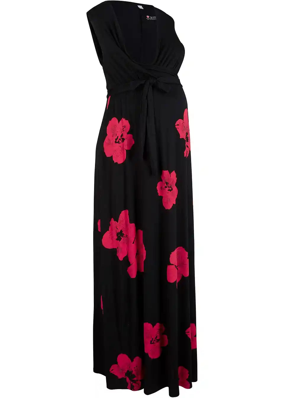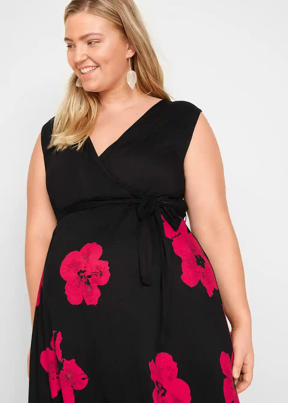 Ova svečana trudnička haljina s cvjetnim printom raste zajedno s trbuhom, omogućavajući nošenje tijekom i nakon trudnoće. Preklop sprijeda omogućava jednostavno dojenje.