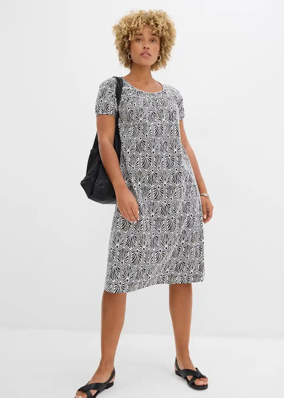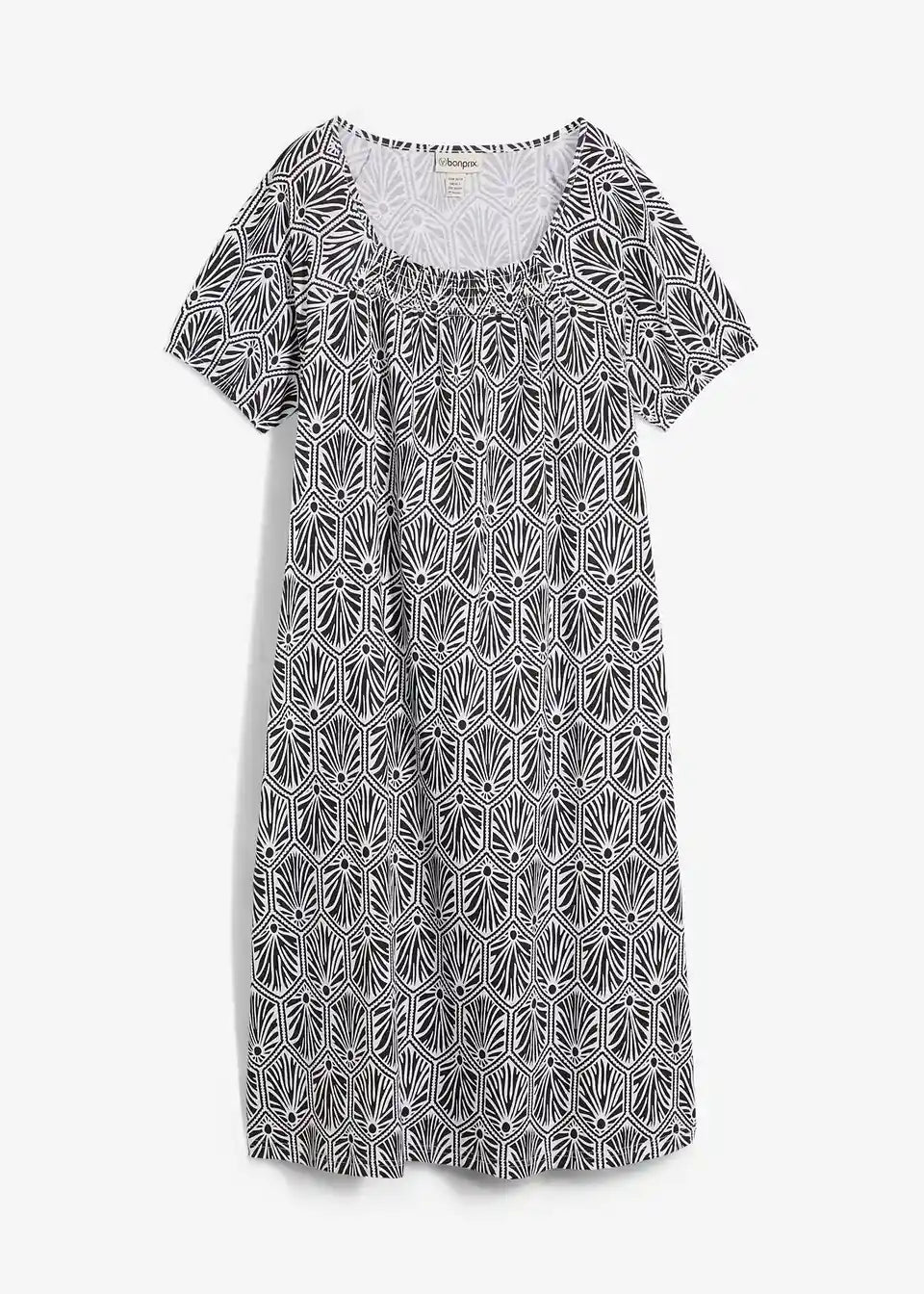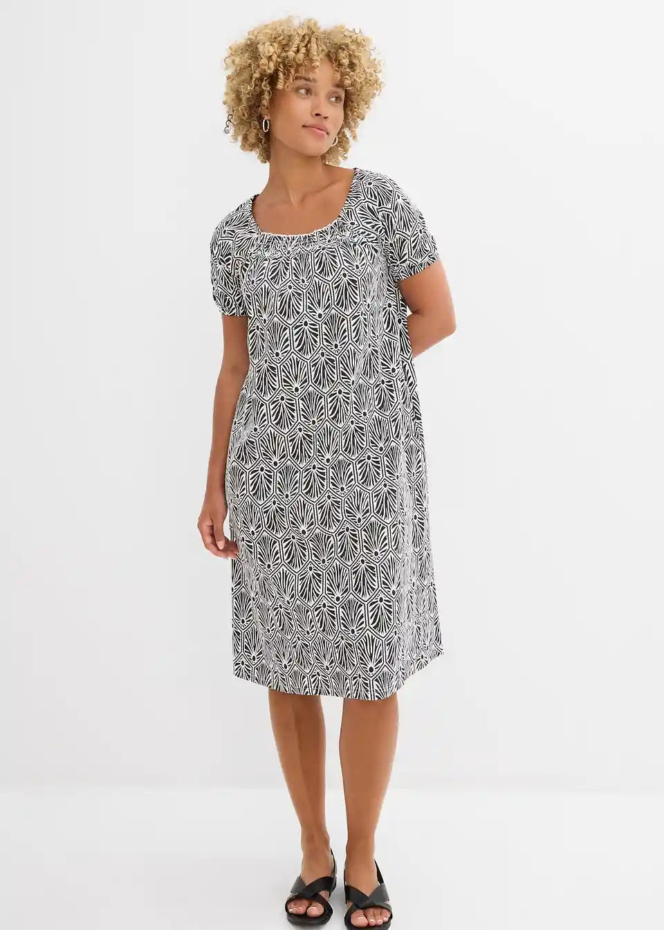 Pamučna haljina u laganoj A-liniji s elastičnim carré izrezom te kratkim rukavima s elastičnim rubom.