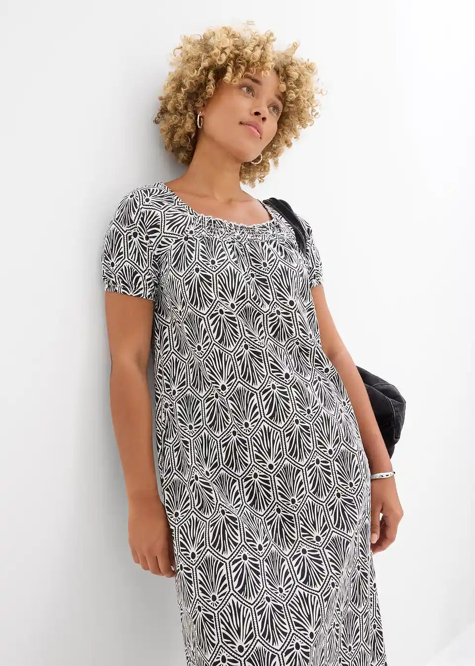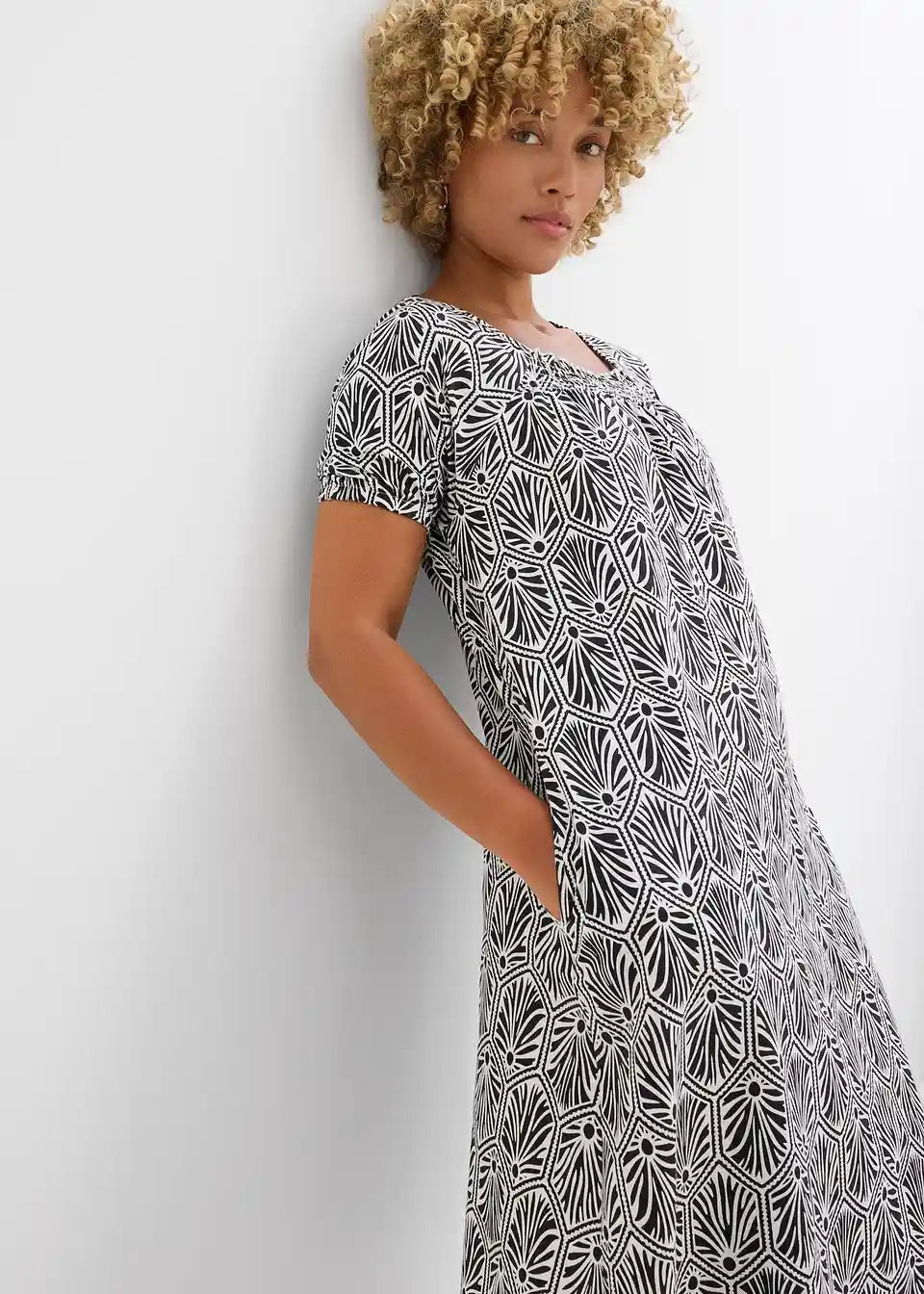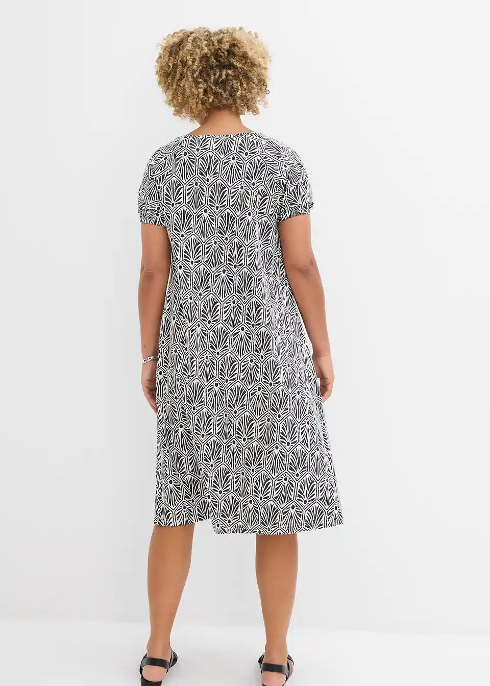 Pamučna haljina u laganoj A-liniji s elastičnim carré izrezom te kratkim rukavima s elastičnim rubom.
