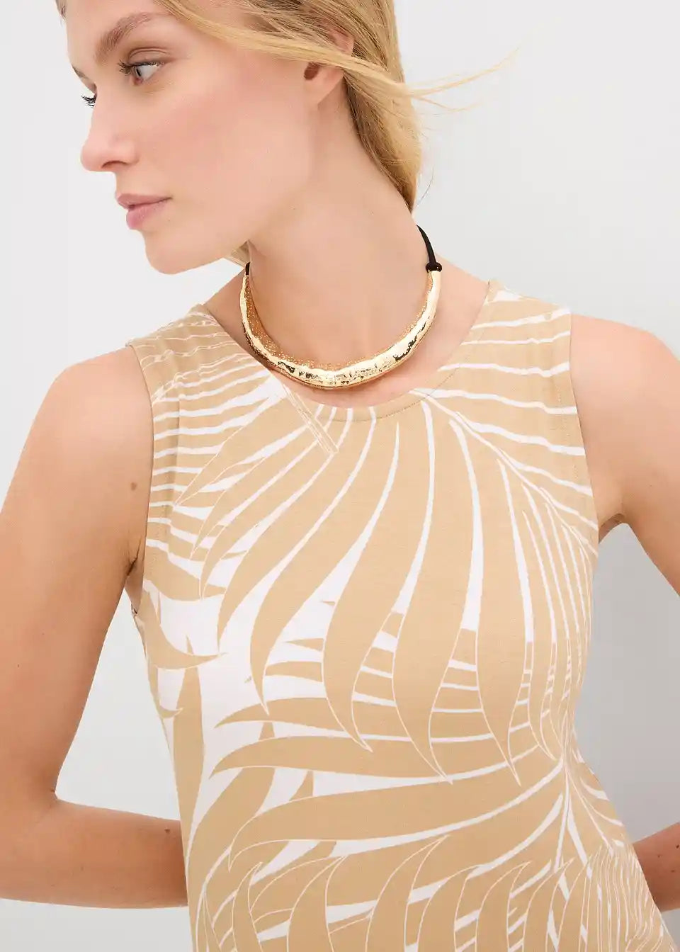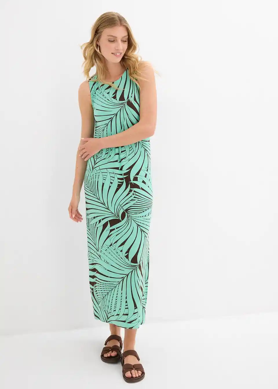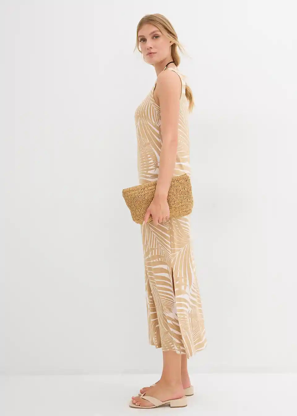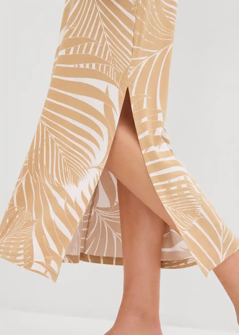 Midi haljina s printom palmi i bočnim prorezom.