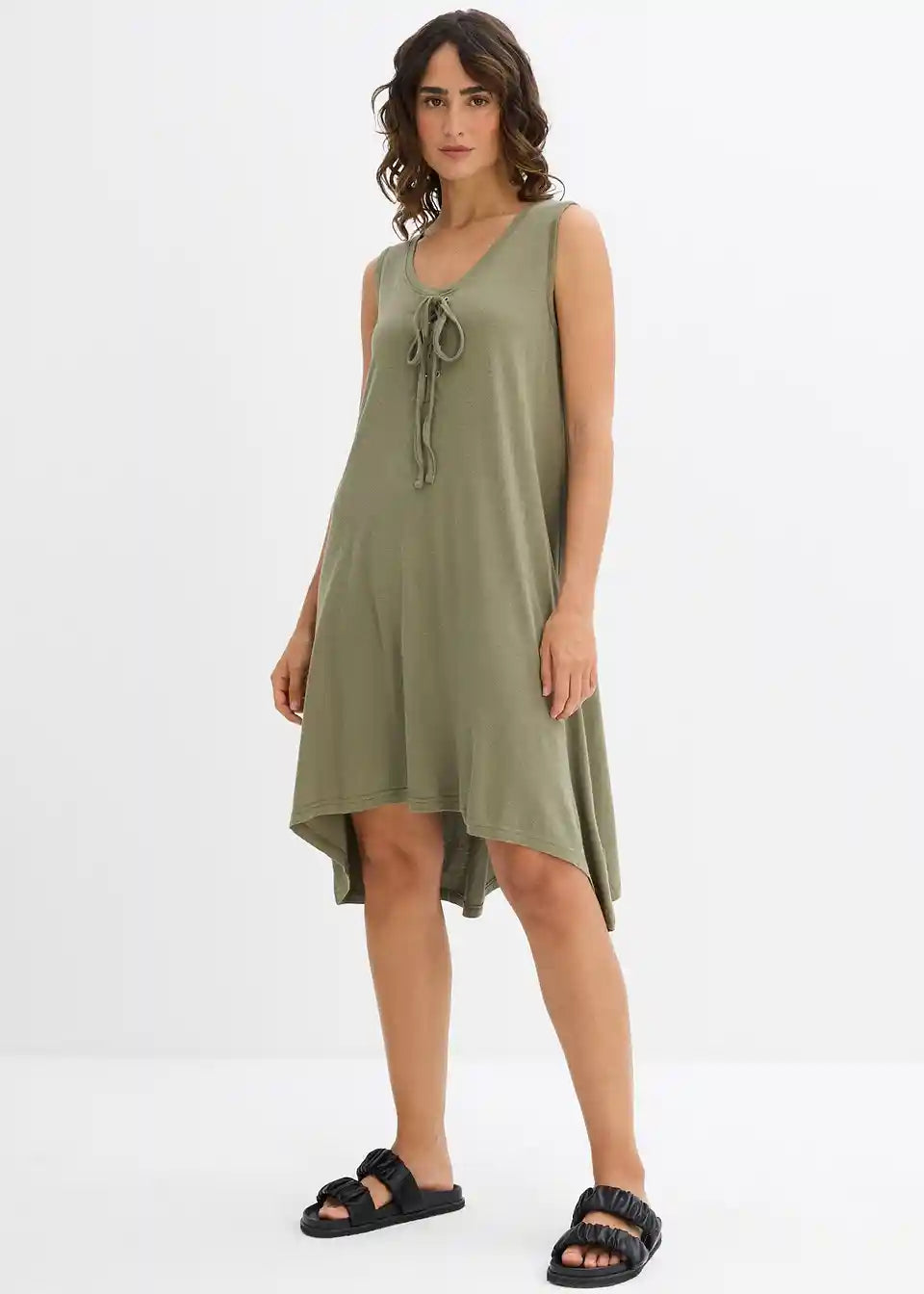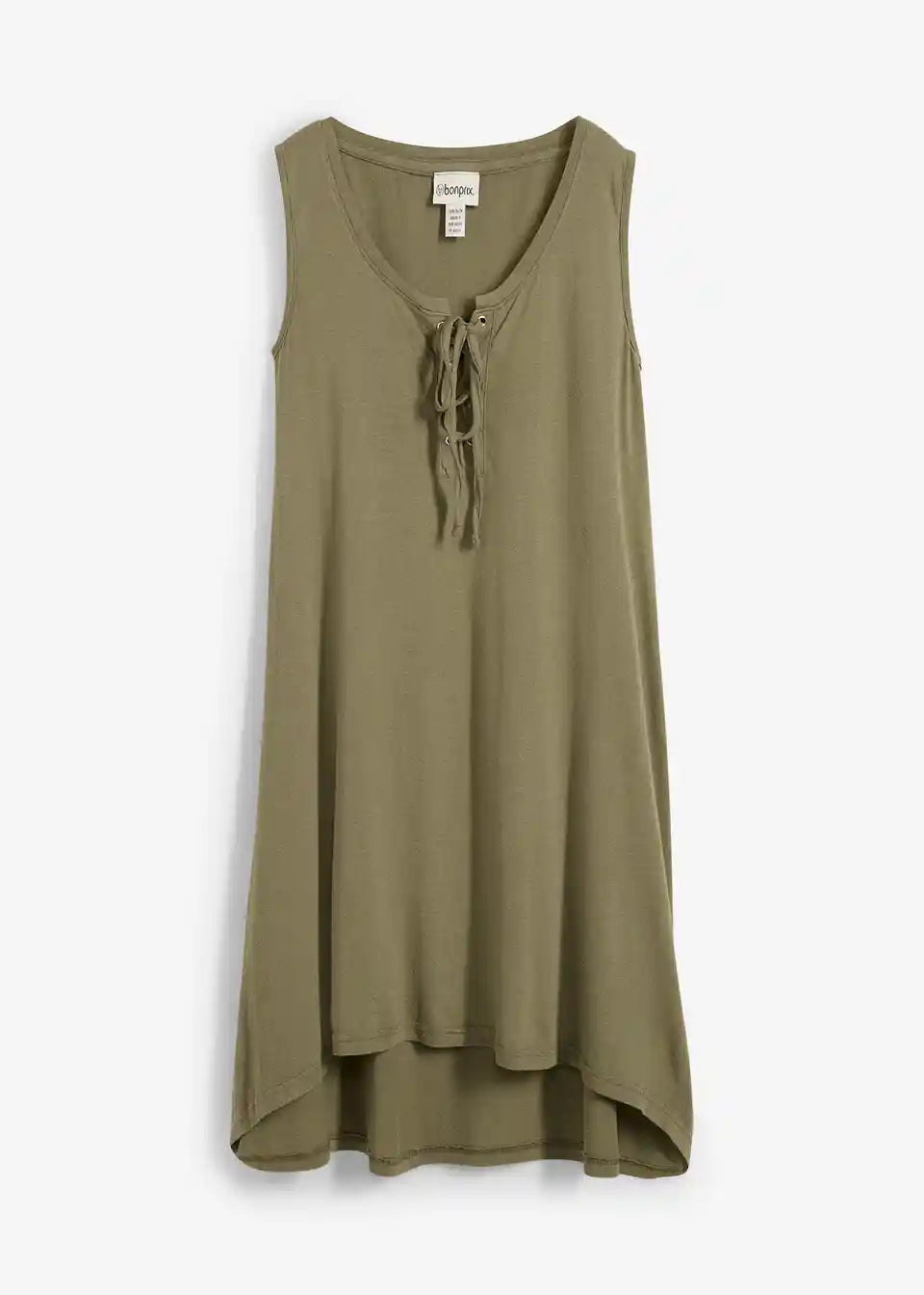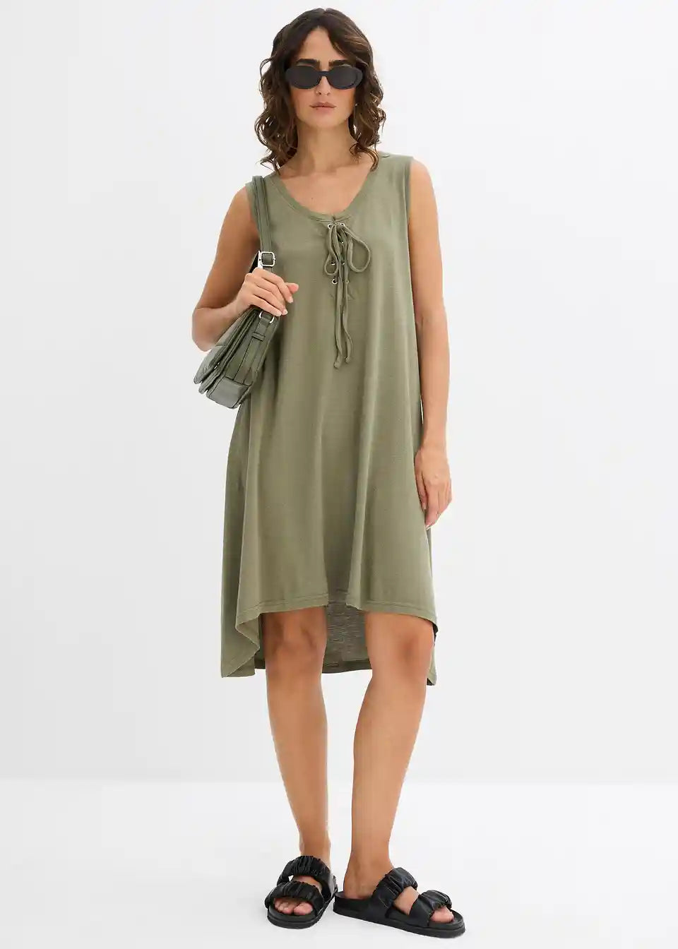 Ova moderna košulja-haljina s vezicama je savršen komad u ormaru. Lepršavi rub modela dužine do koljena je sprijeda kraći, što daje moderan Vokuhila izgled. Duboki okrugli izrez završava dugim prorezom u sredini sprijeda. Zahvaljujući dugom veznom vrpcu, širina se može podesiti i pretvoriti u efektan V-izrez. Velike ušice kroz koje prolazi vezica daju trendi haljini rokerski štih.