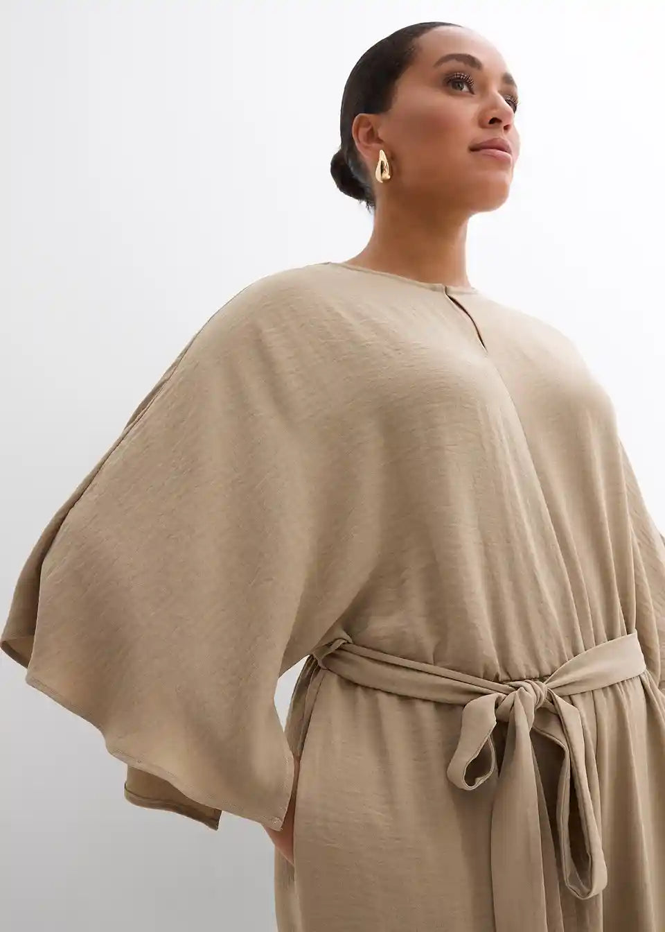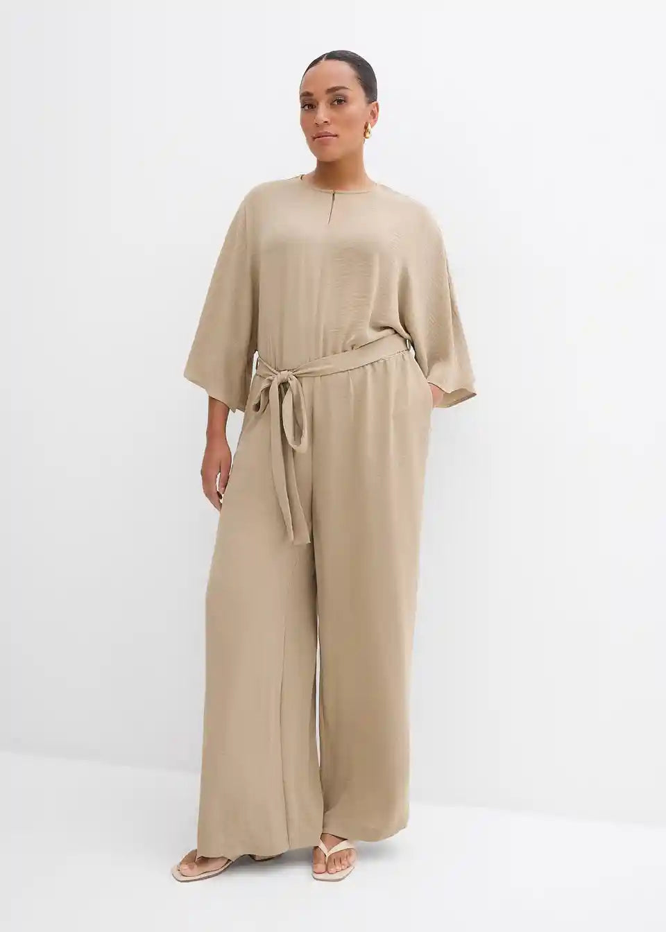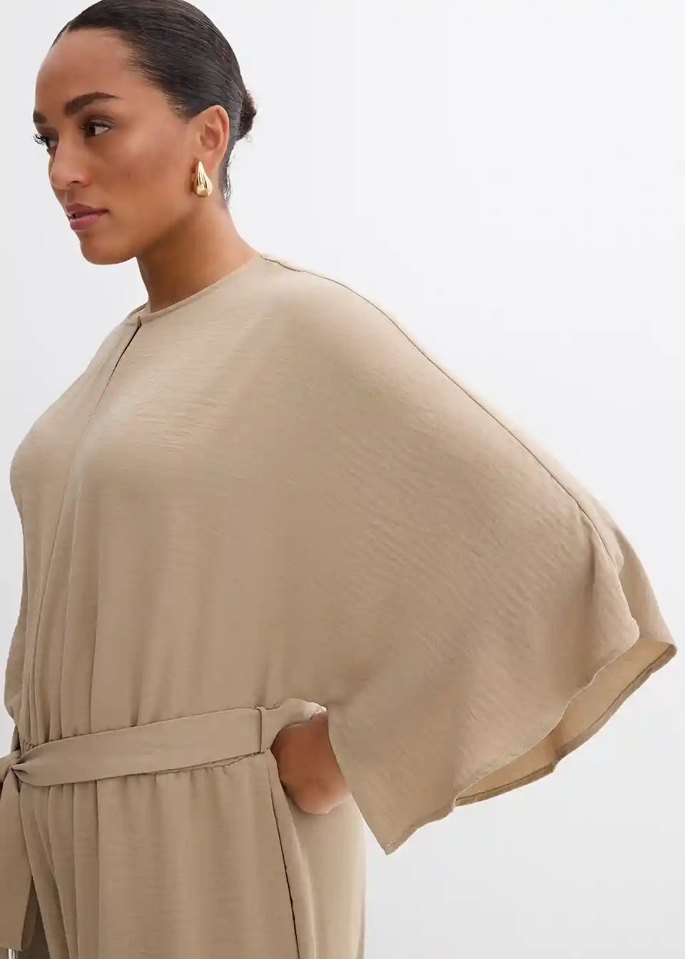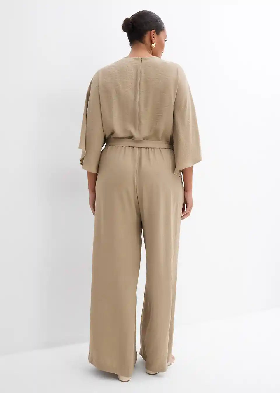 Elegantni jumpsuit sa širokim, voluminoznim nogavicama, izrezom u obliku ključaonice i lepršavim rukavima u obliku plašta. Pojas u istoj boji naglašava ležeran kroj.