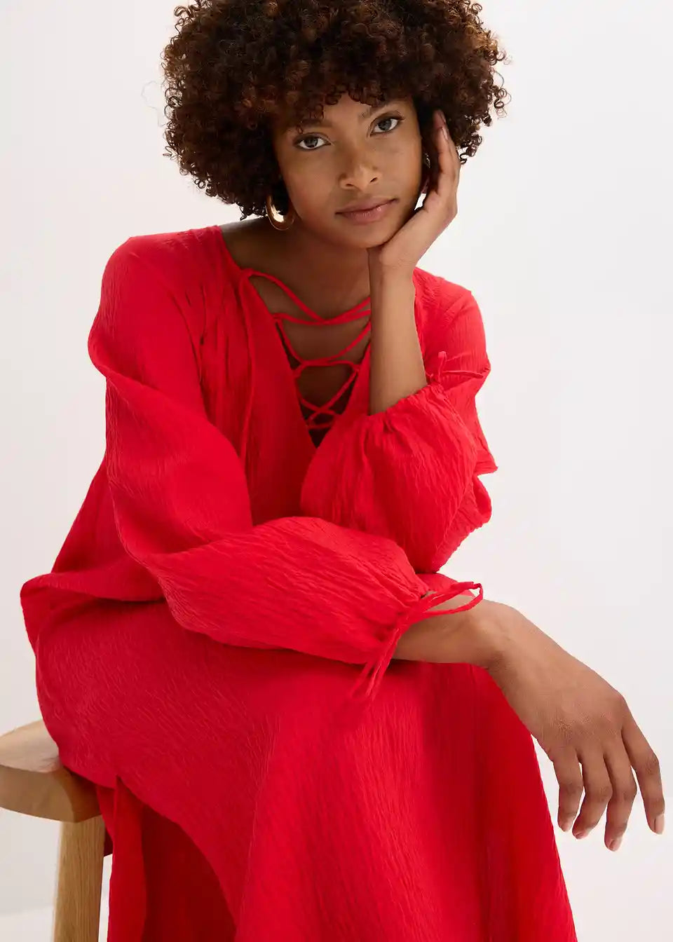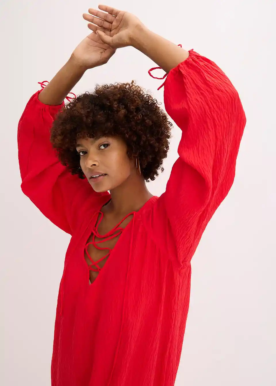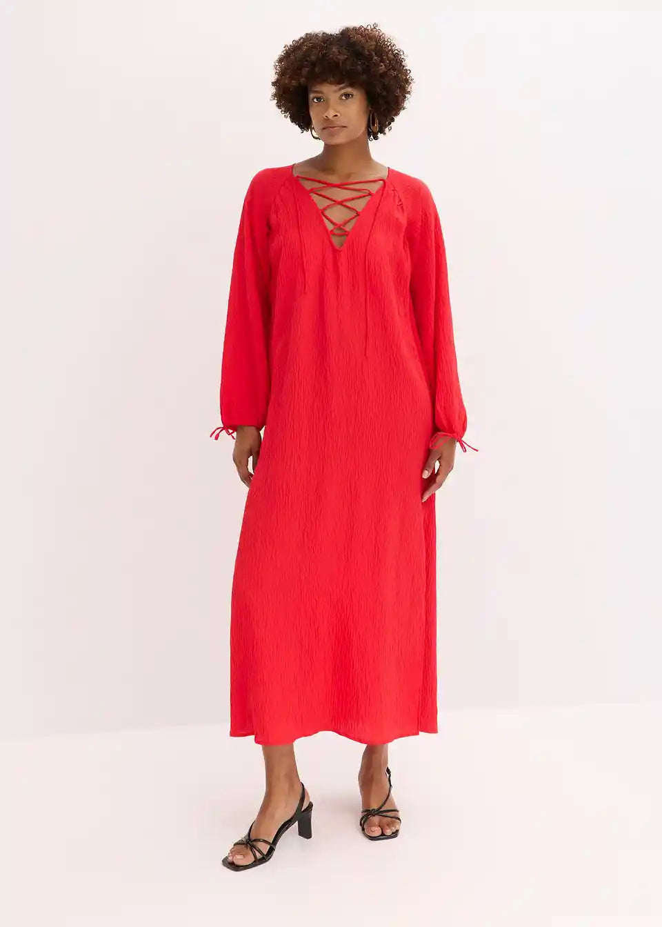 moderna kaftan-haljina od lagano strukturirane mješavine viskoze s dekorativnim detaljima vezanja na izrezu sprijeda i na rubu rukava