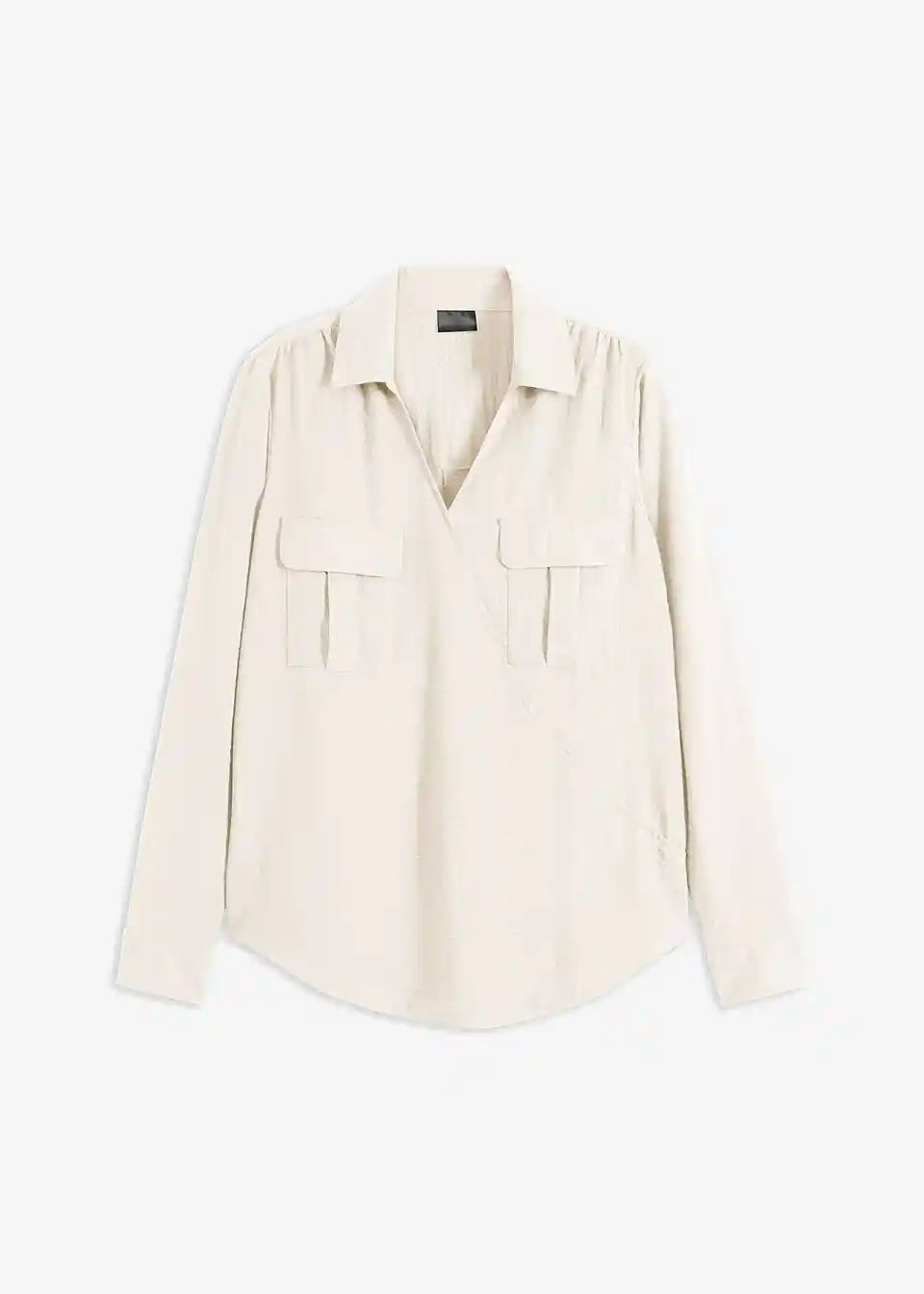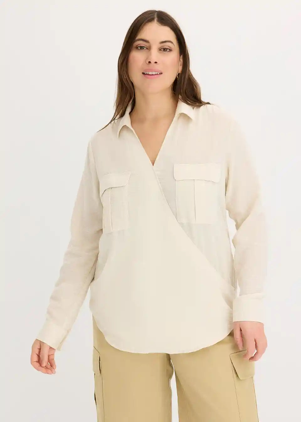 Šarmantna bluza s izgledom preklapanja i našivenim džepovima