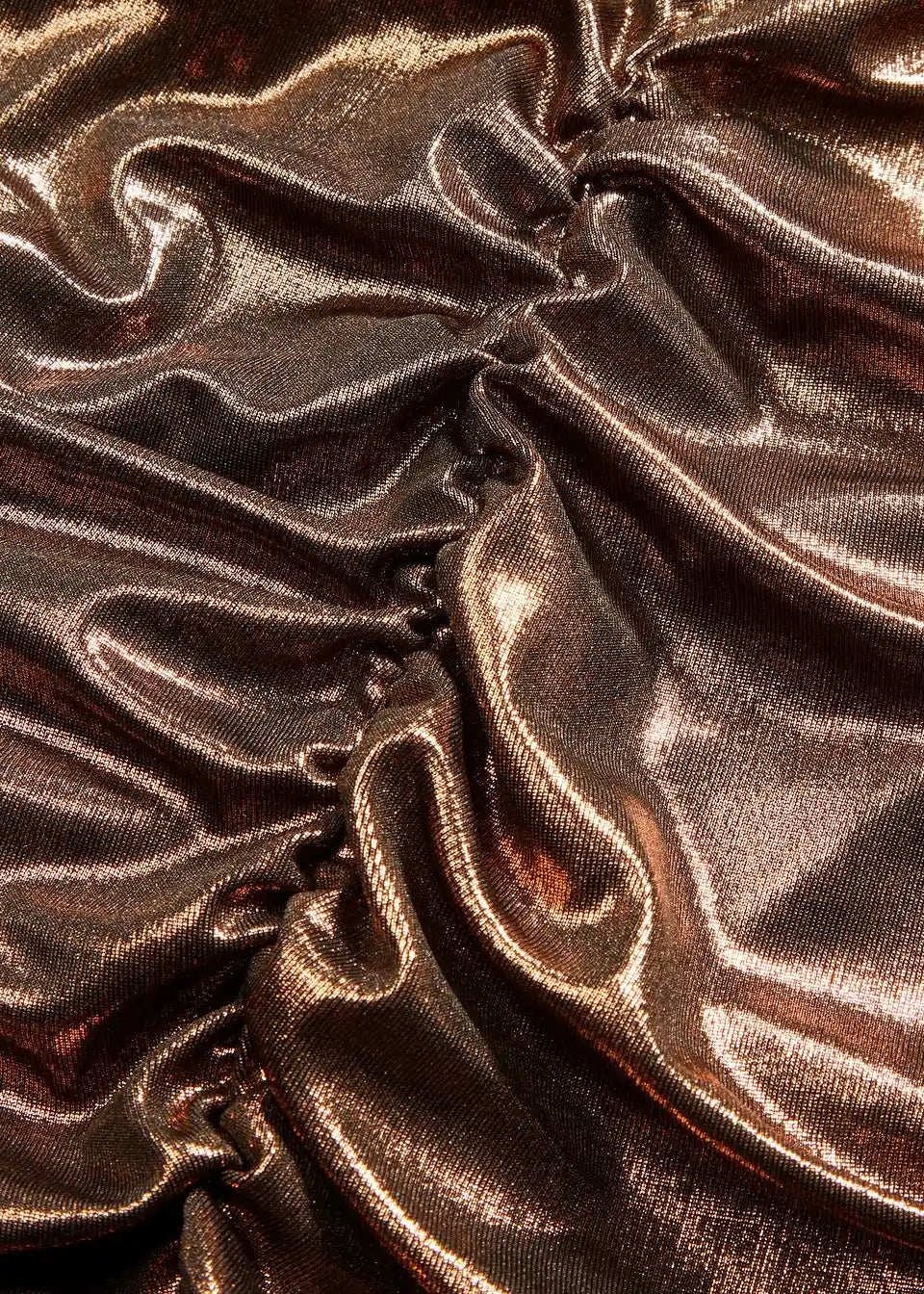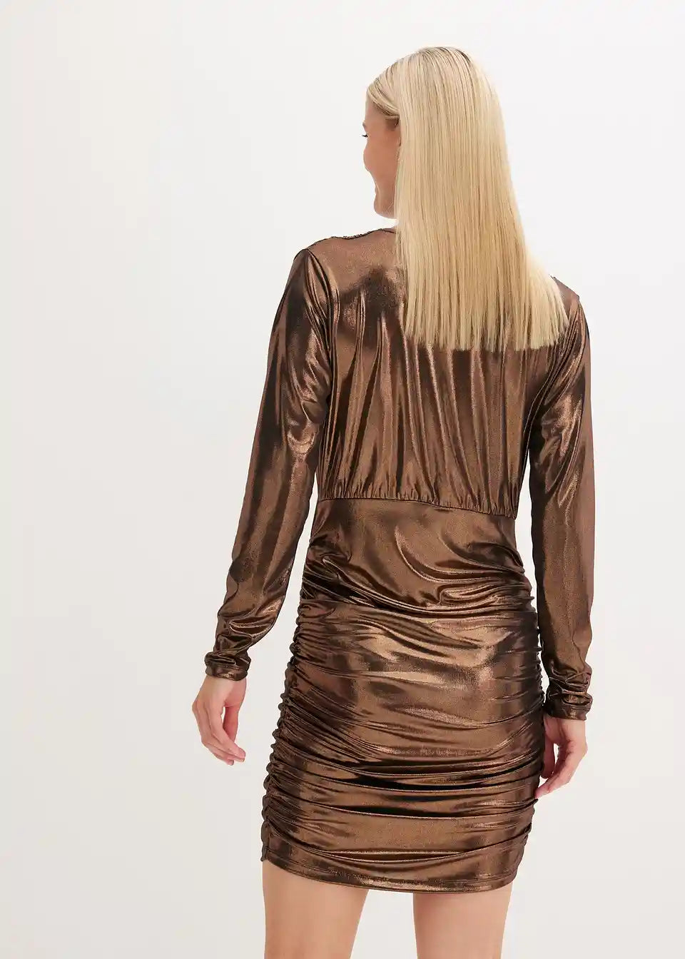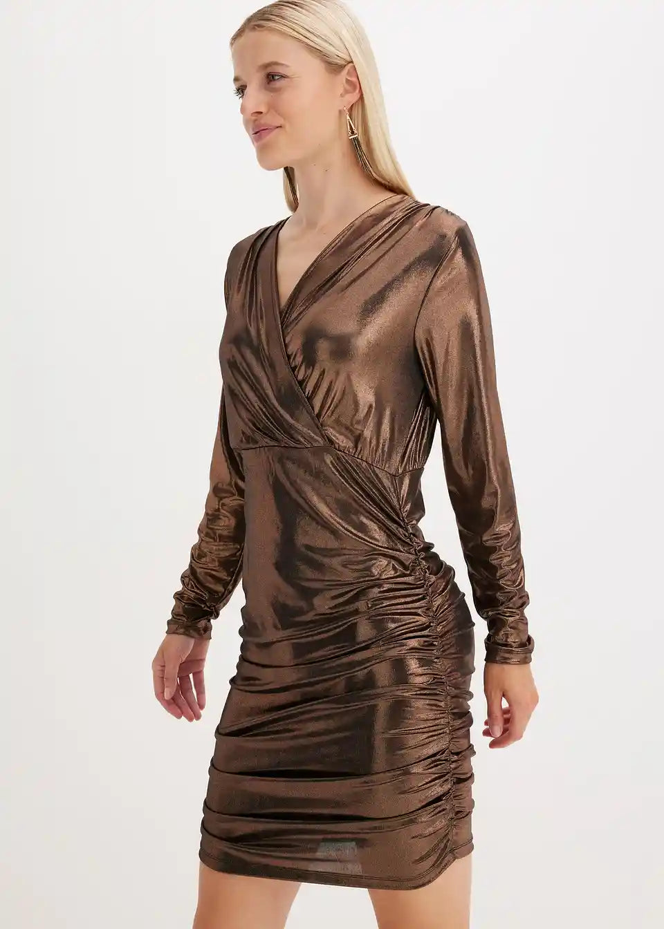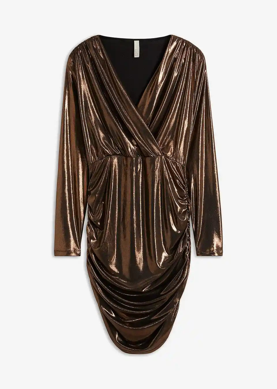 Moderna i ženstvena: kratka haljina od jerseya s sjajnim premazom. S preklopnim izgledom i naborima, ova haljina postaje pravi privlačitelj pogleda.
