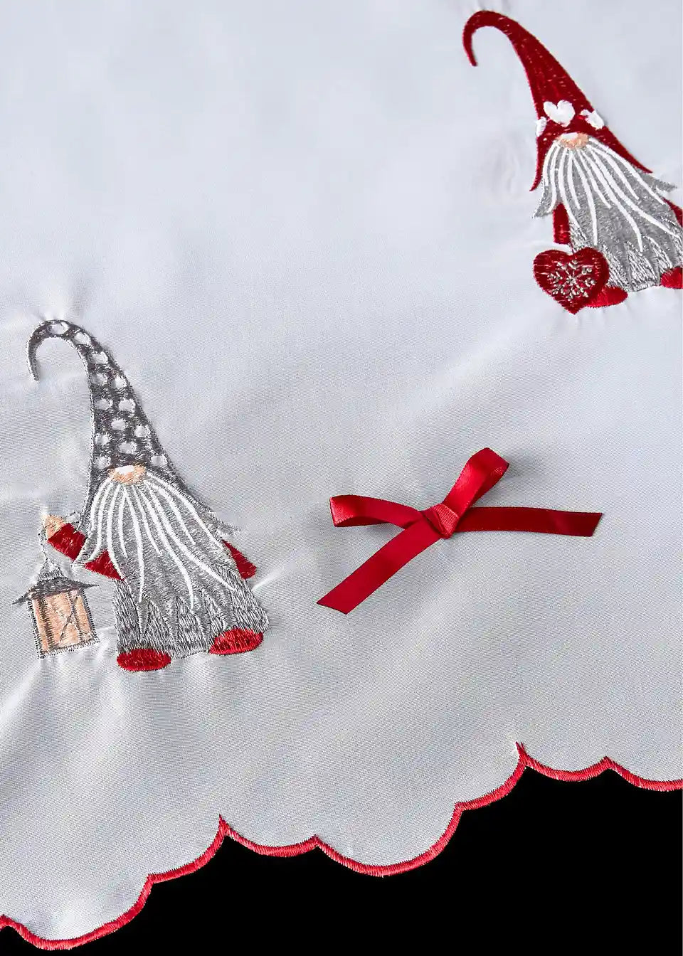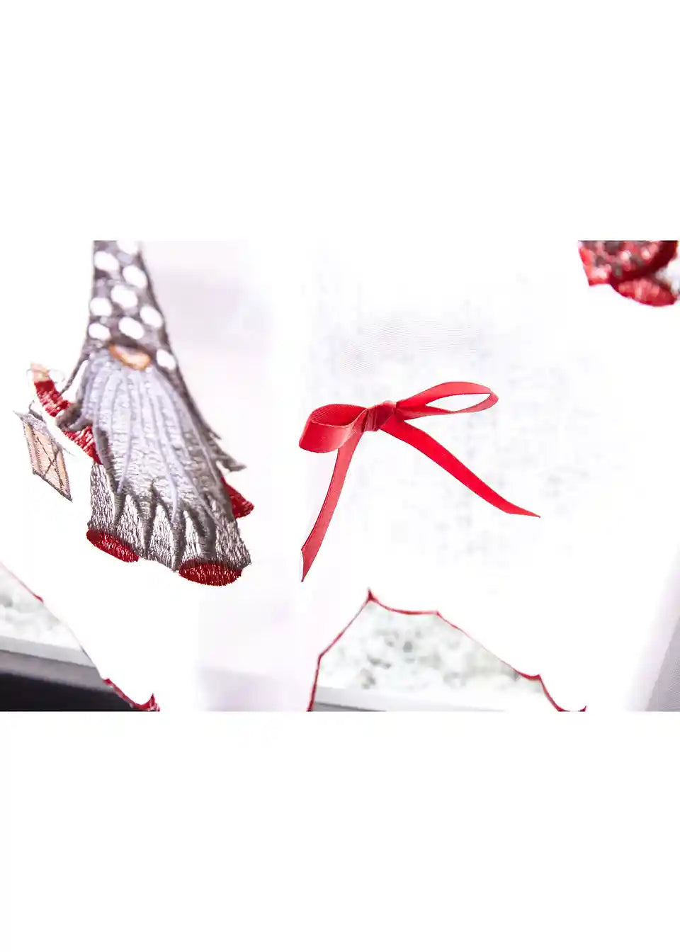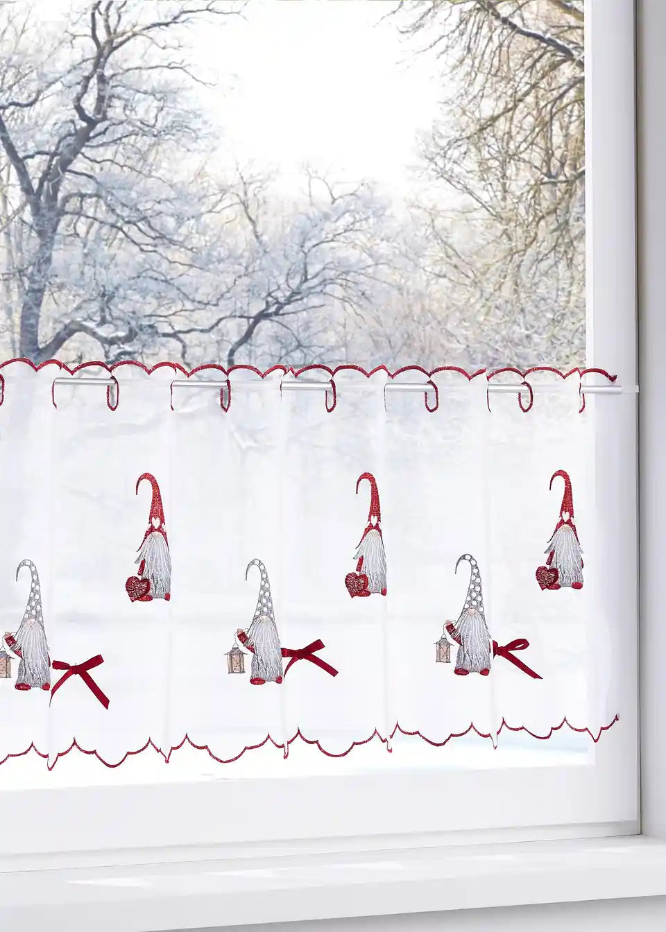 Božićna kratka zavjesa s preslatkim prišivenim mašnicama i izvezenim vilenjacima od laganog, prozračnog voile materijala. U skladu s tim, zavjesa je na gornjem i donjem rubu (koji su zakrivljeni) ukrašena crvenim vezom. Prikladno za šipke promjera do 3 cm.