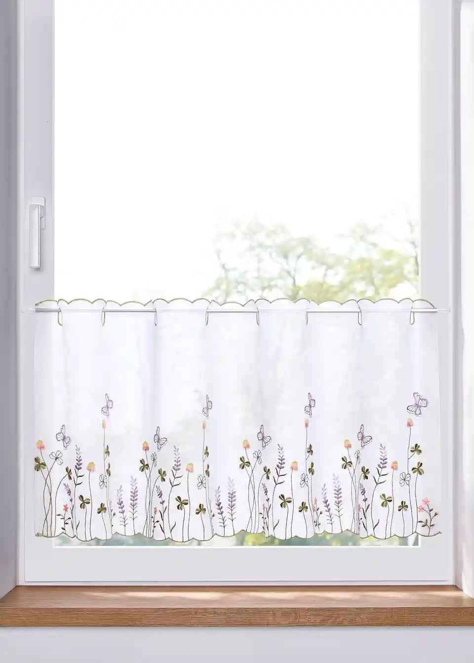 Praktične kratke zavjese s cvjetnim vezom u izgledu lana i otvorima za šipke promjera do maksimalno 3 cm.
