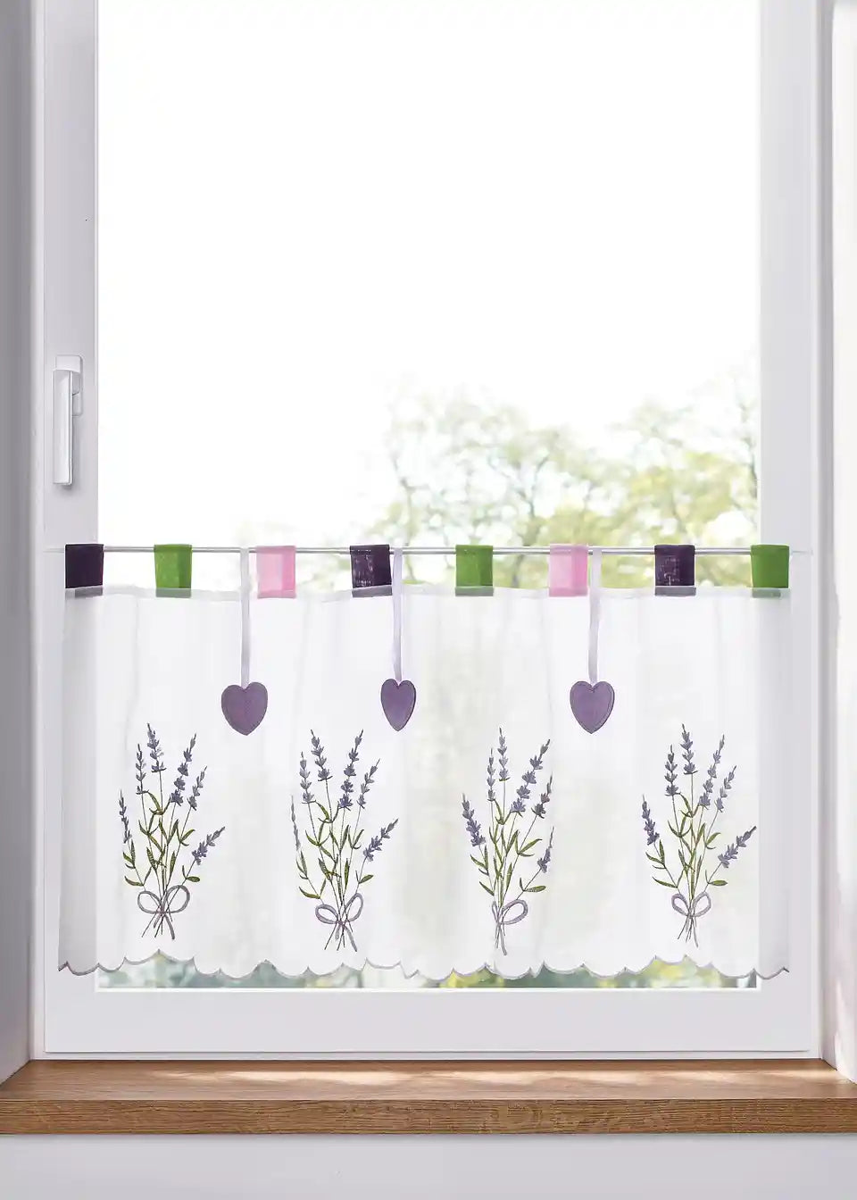 Umiljata kuhinjska zavjesa s prekrasnim vezom lavande i malim visećim srcima: Ta se srca mogu po želji i ukloniti. Apsolutno privlači pažnju za tvoj kuhinjski prozor!