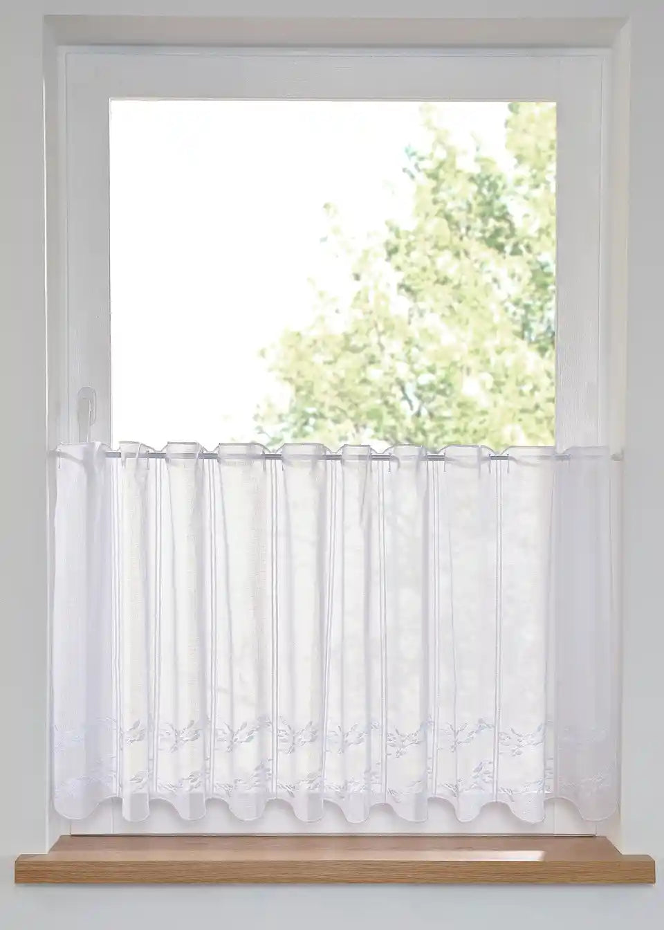 Jednostavna moderna kuhinjska zavjesa s nježnim vezom listova.