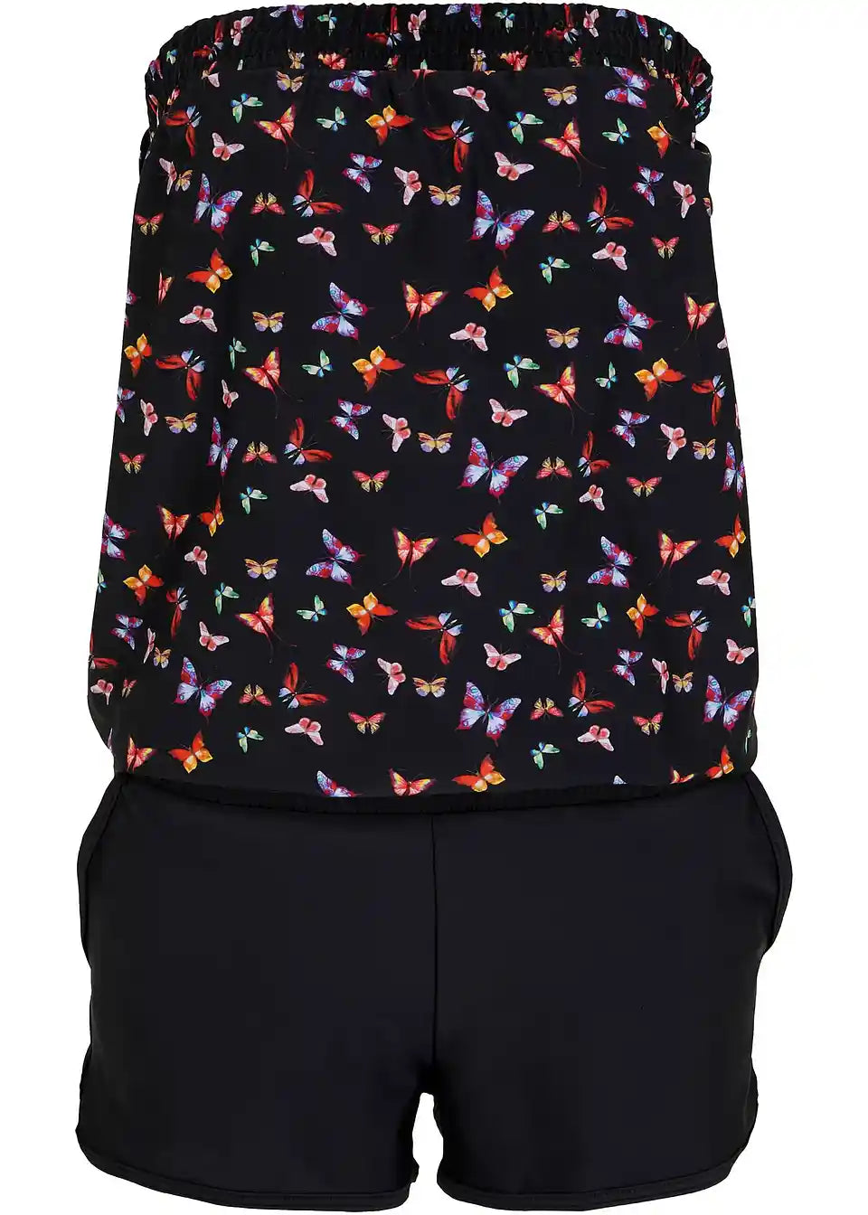 Overal od kupaće tkanine. Odvojive i podesive naramenice. Uklonjivi mekani umetci. S elastičnom trakom na gornjem rubu i na bokovima. Kratke hlače s ušivenim džepovima. Ugrađene gaćice.
