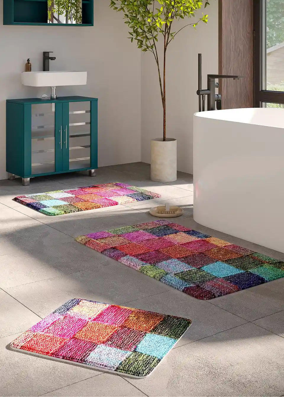 Kupaonski set sa šarenim patchwork printom, izuzetno mekana tekstura, brzo se suši, s Memory pjenom. Izrazito upijajuća.