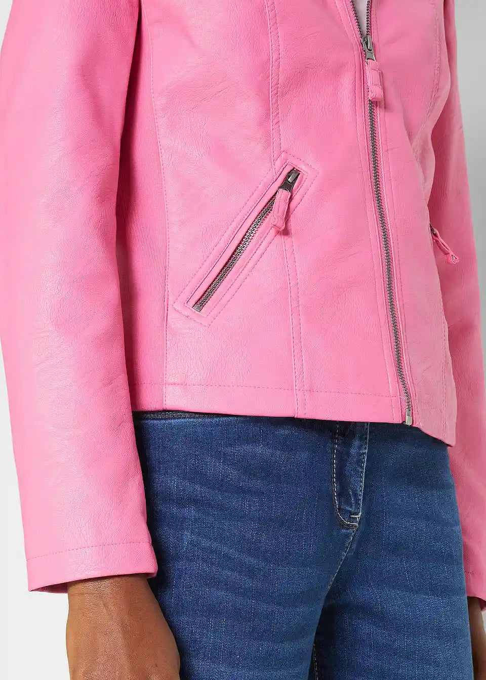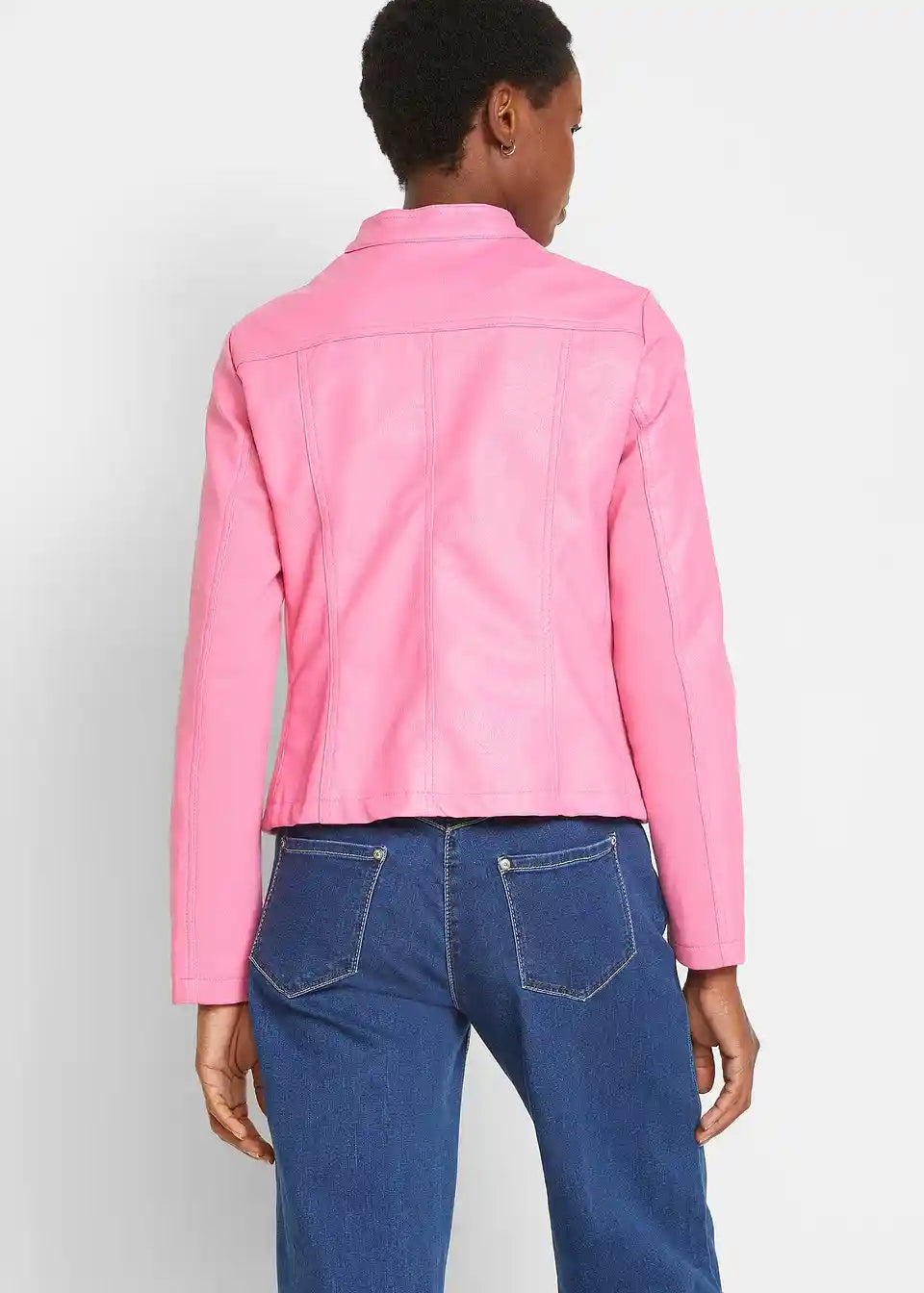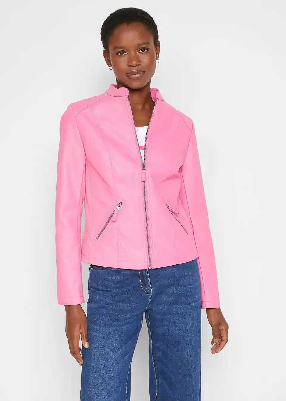 Ova privlačna jakna od imitacije kože iz bpc kolekcije ističe se finim detaljima. Uključuje mali stajaći ovratnik i dva bočna džepa s patentnim zatvaračima na prednjoj strani. Umetci od rebrastog materijala na bočnim stranama i rukavima osiguravaju dobru prilagodbu i ugodan osjećaj tijekom nošenja. Lagano strukirana jakna od imitacije kože idealan je dodatak trapericama i gležnjačama, ali također odlično nadopunjuje uske midi suknje s salonkama.